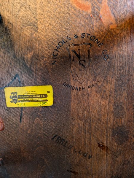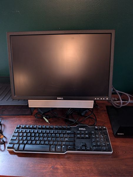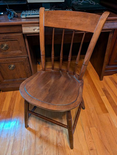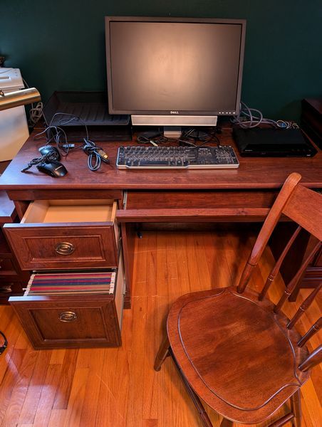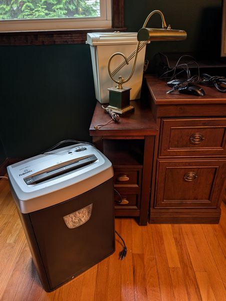 Office Furniture and Equipment. Wood desk, 47"Wx21"Dx29"H; wood Nichols & Stone desk chair, 16"Wx16'Dx33"H; brass desk lamp, 17"H; two shredders; Dell monitor, 2'W; Sony subwoofer; keyboard; other related items as seen in photos.