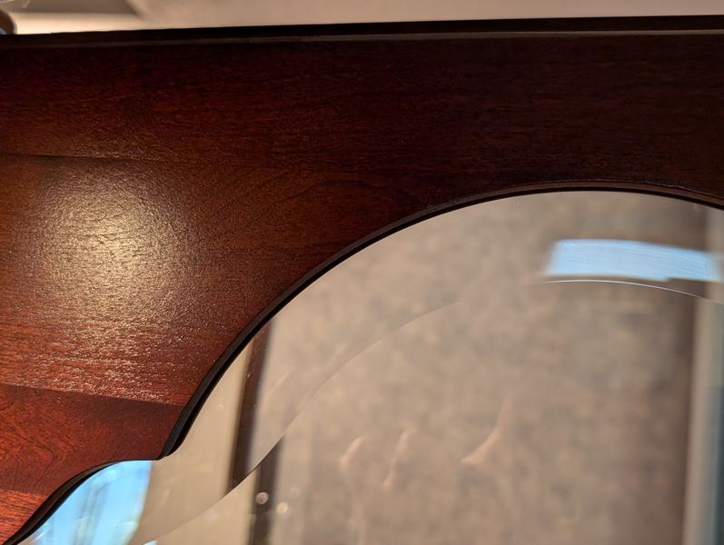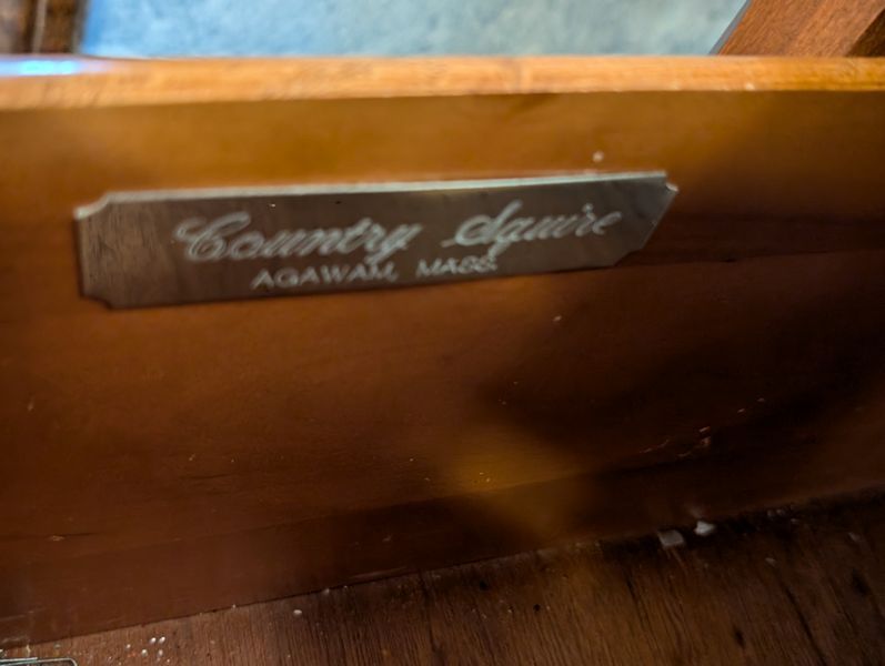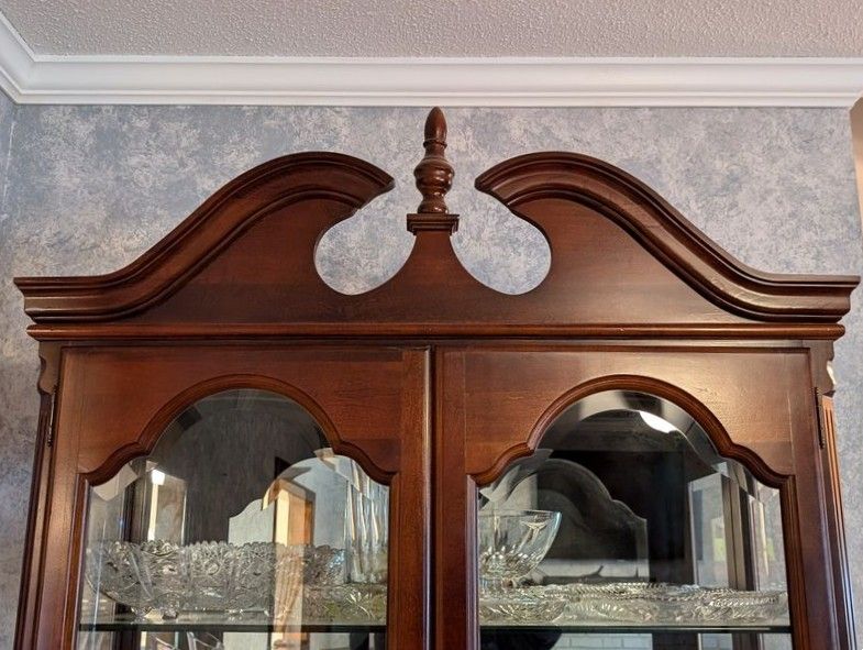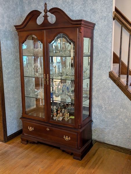 Formal Display Cabinet. Traditional lighted wood cabinet by Country Squire with glass front & sides and glass shelves, single drawer below and beveled glass with finial and crown molding, 43"Wx18"Dx84"H. Items seen inside cabinet are not included