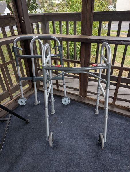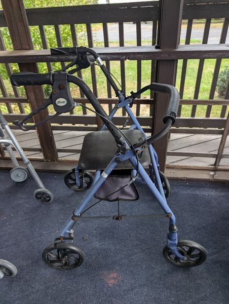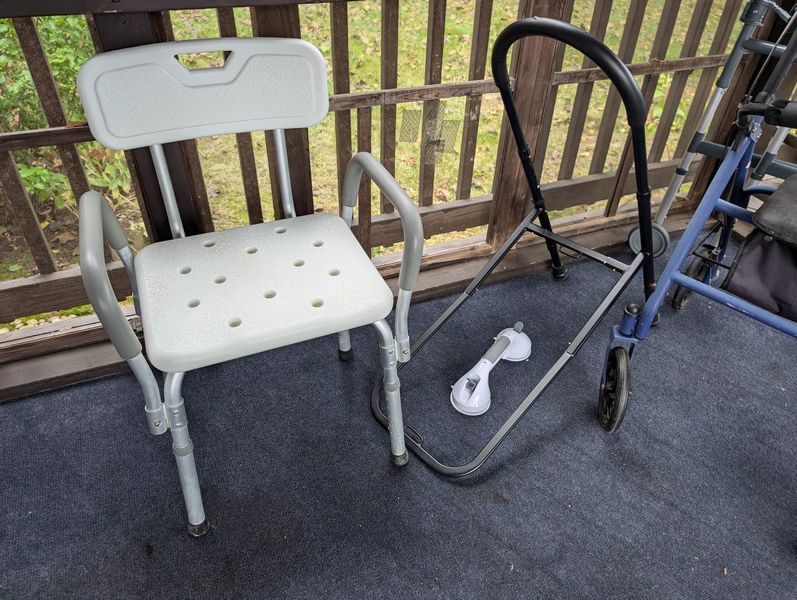Medical Equipment. Two folding walkers; Drive rollator; shower seat; bed rail; grab bar. See photos for details.
