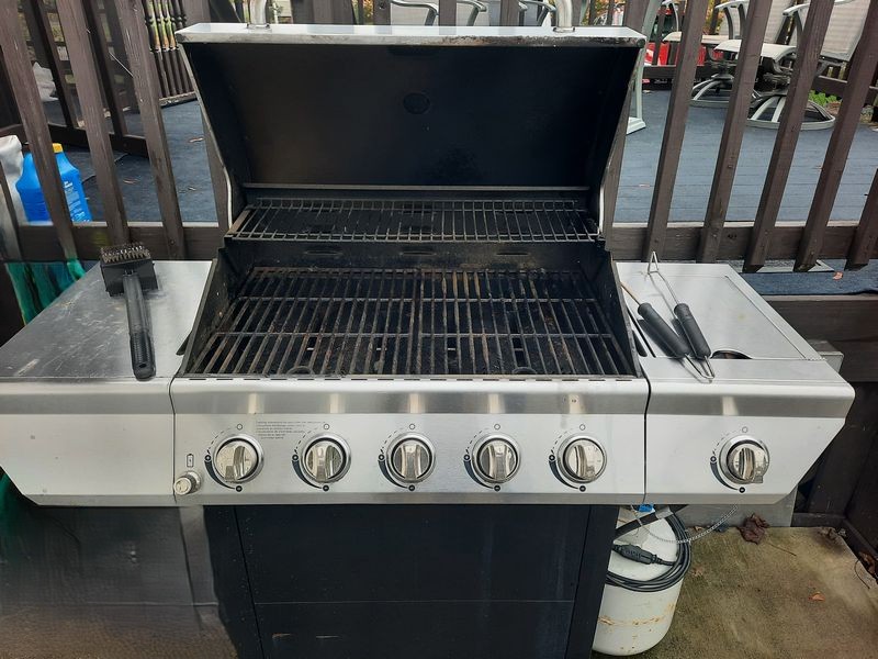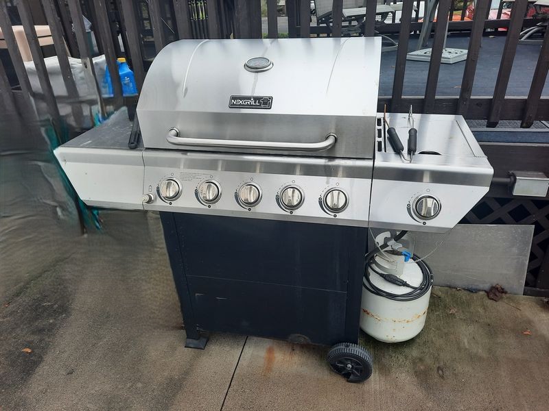 Outdoor Table, Grill. Rectangle glass & metal patio table, 5'Lx38"Wx27"H; pair of folding (non-matching) chairs; blue umbrella with green iron stand; NexGrill propane SS grill with side burner, tank and utensils. See photos.