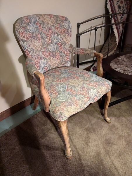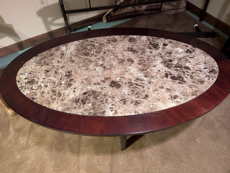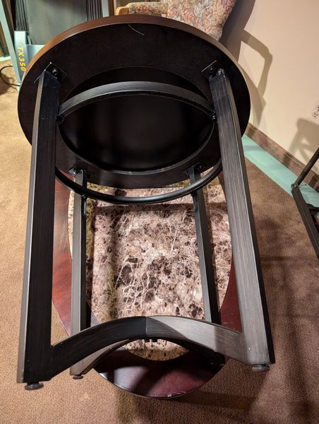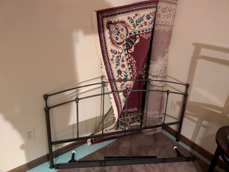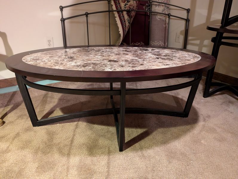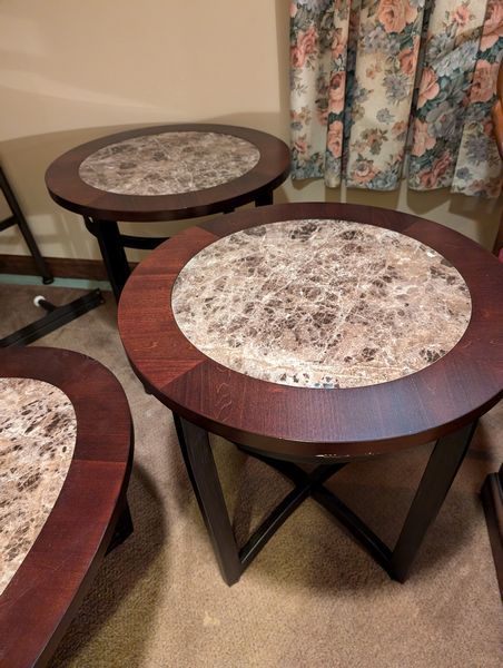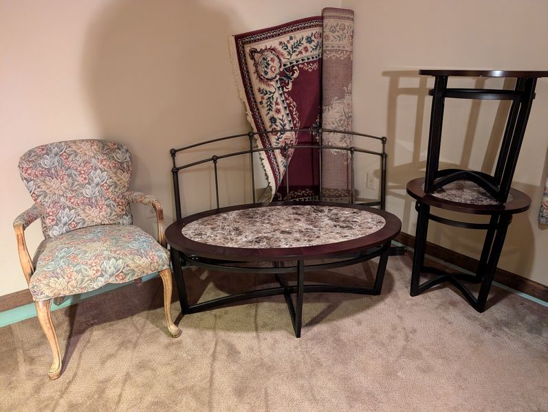 Metal Headboard, Tables, Area Rug. Metal Queen HB w/ rail; fringed area rug, 5.5'x8'; light wood armchair w/ uphol seat & back, 25"Wx25"Dx35"H; set/3 modern tables w/ faux stone tops, incl: coffee, 4'Lx28"Wx19"H (see photo edge damage) w/ pr matching end tables, ea 2'diam x25"H. Loc in finished basement.