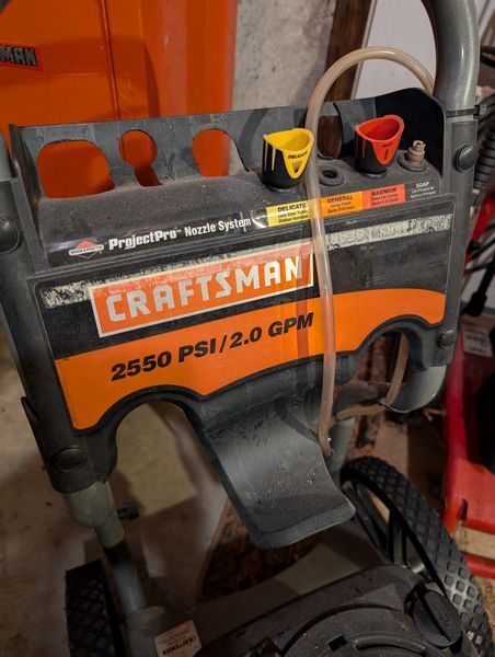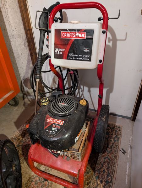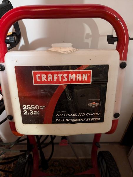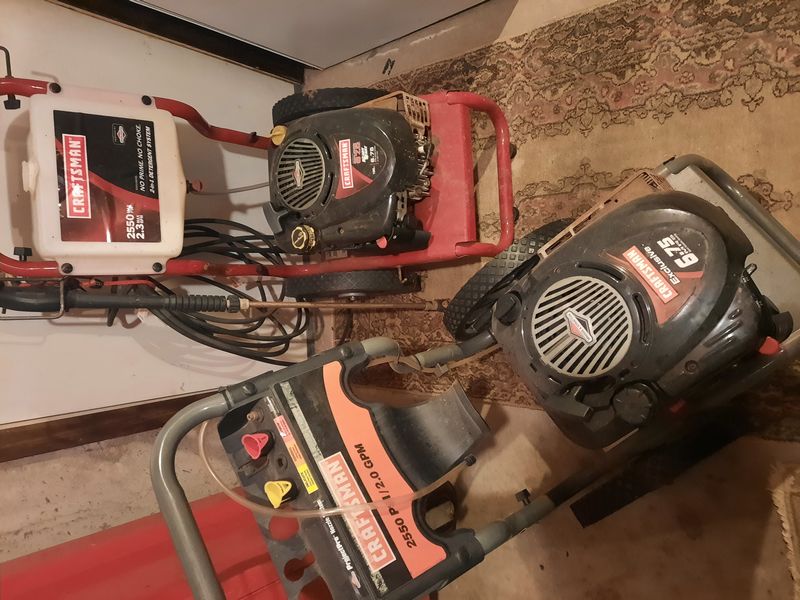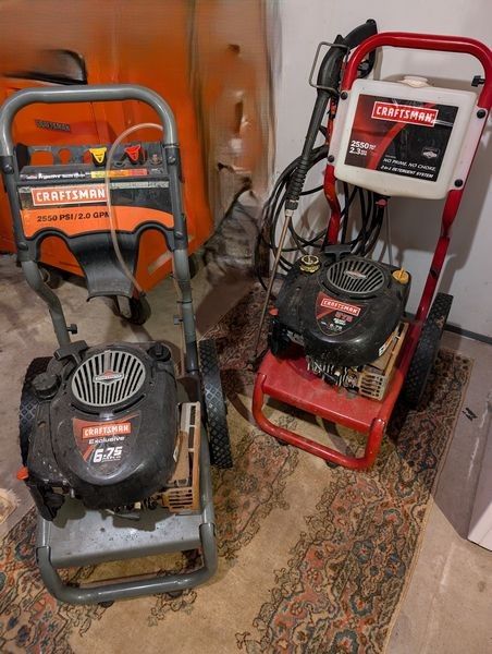 Power Washers, featuring Craftsman. Two Craftsman power washers w/ 2550 psi (one 2.0 gpm, one 2.3 gpm). See photos. Other items seen in background not incl. Loc in basement near hatchway exit.