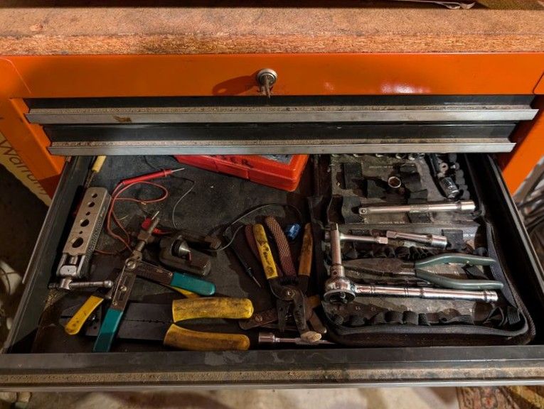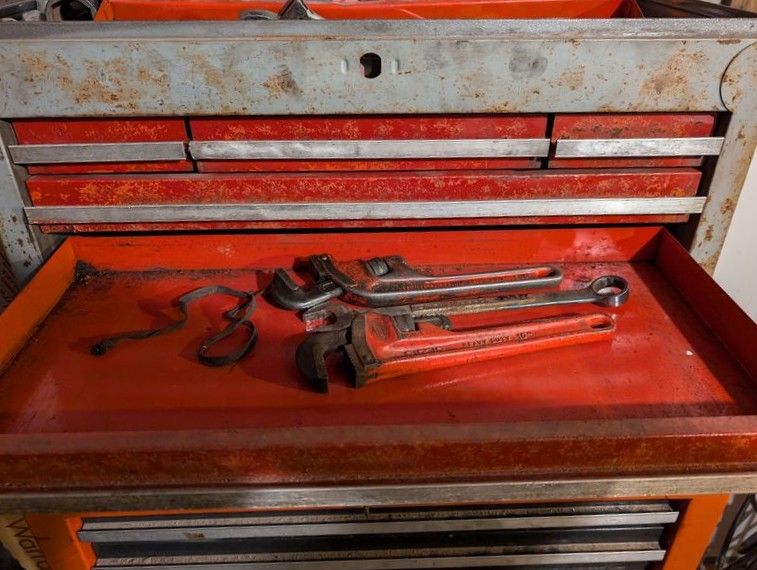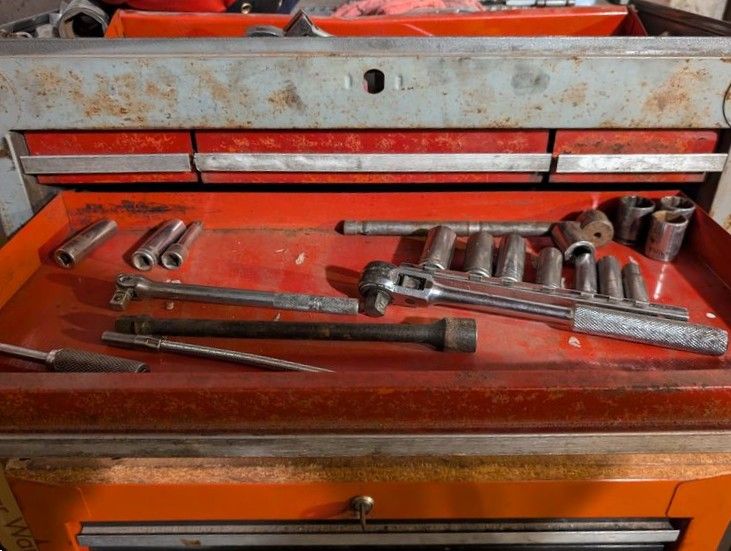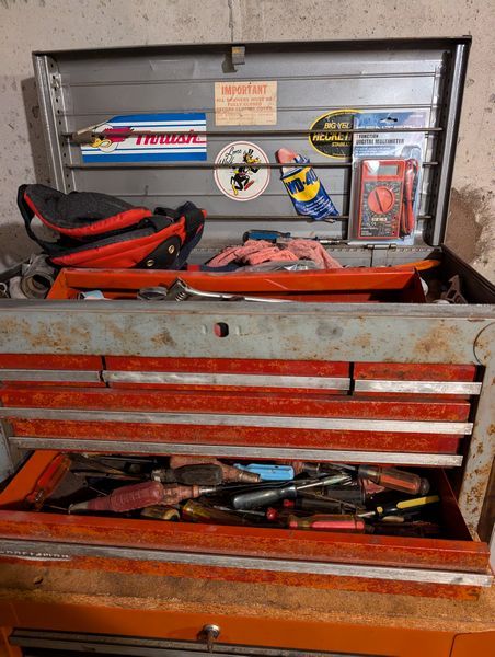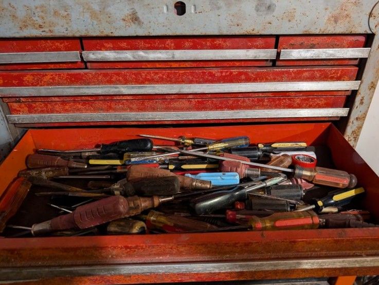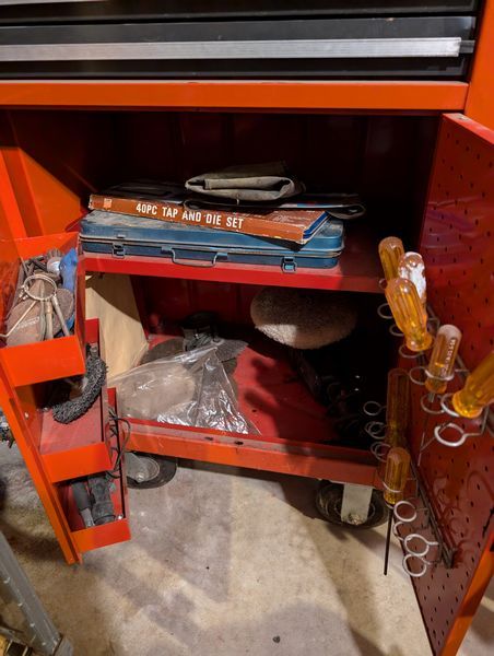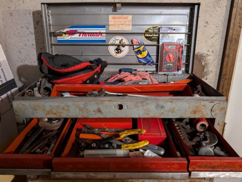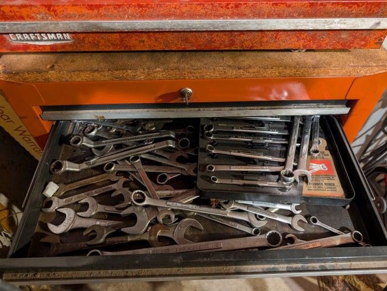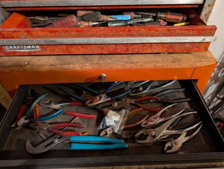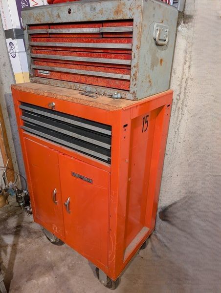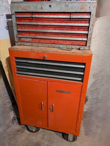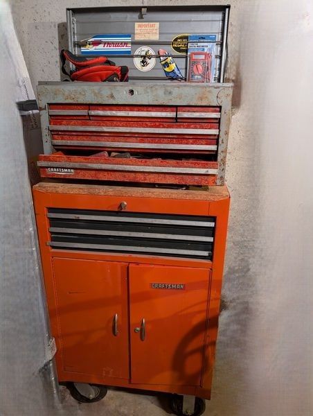 Craftsman Tool Chest. Craftsman red metal tool chest on wheels w/ contents (sockets, wrenches, screwdrivers, pliers). See photos for details. Loc in basement near hatchway exit.