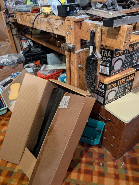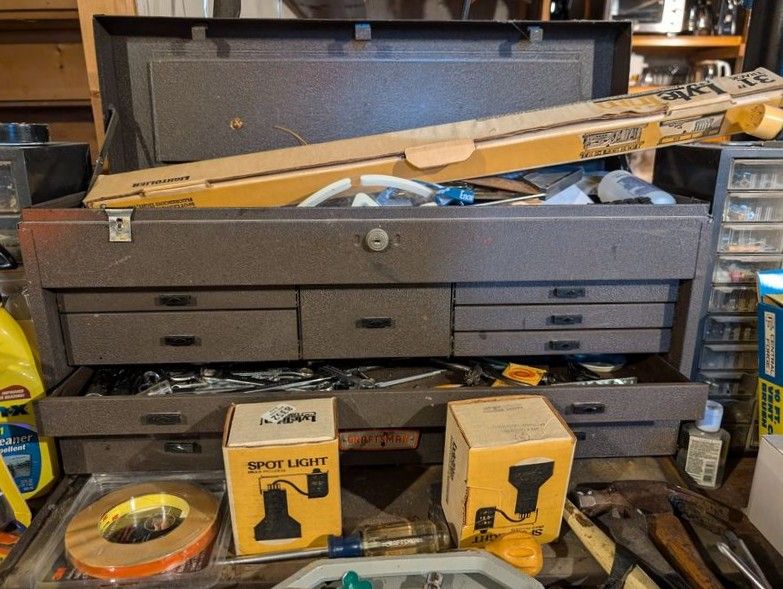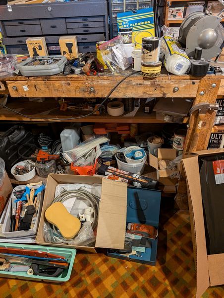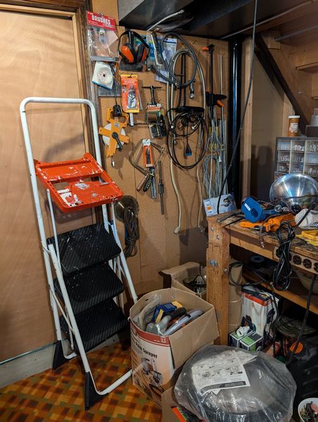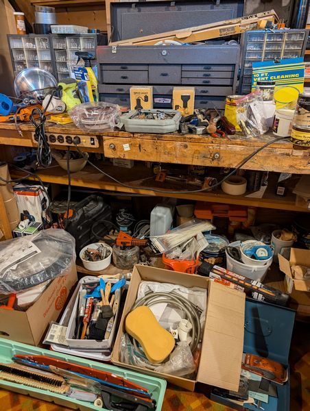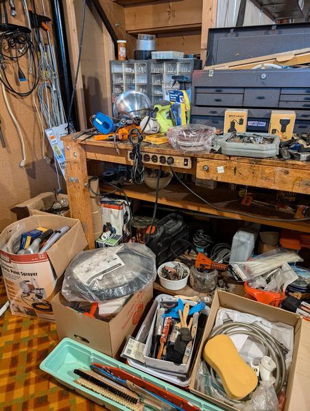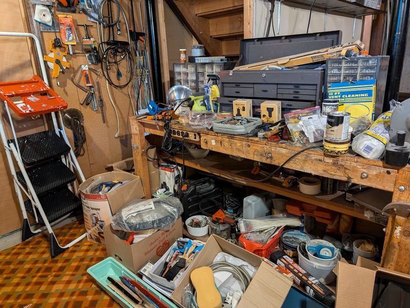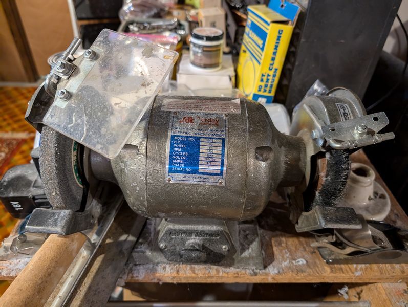 Ladder, Bench Grinder, Contents of Workbench. Coso 3' ladder; heavy duty bench grinder BG-6; metal tool box; contents of workbench incl: painting, plumbing, lighting, hand tools, HW. Loc in basement.