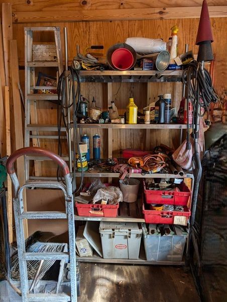 Hand truck, Ladder, Metal Shelving, Contents. Alum 6' ladder; hand truck; metal shelving w/ contents as seen in photos. Loc in shed.