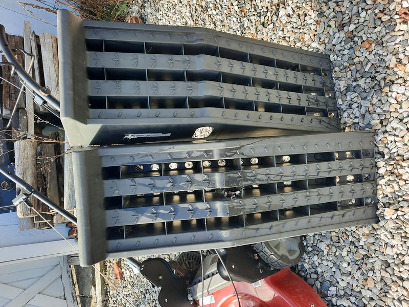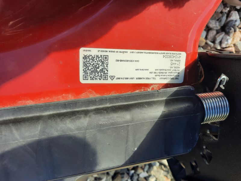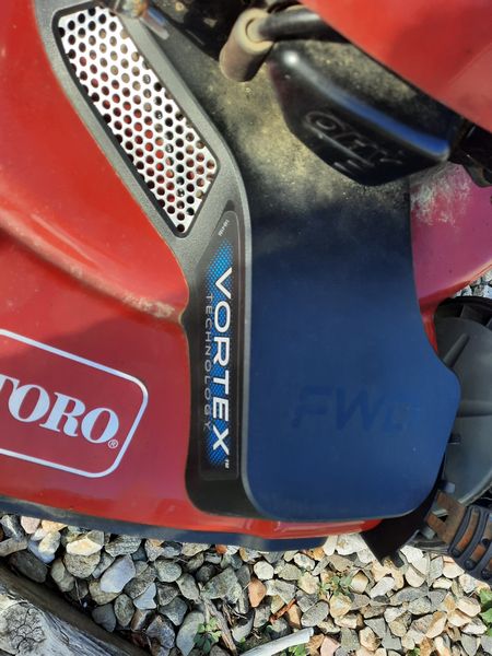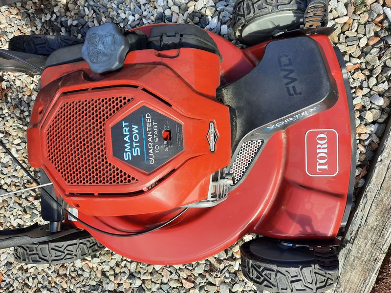 Toro Lawnmower and Ramps. Toro Smart Stow lawnmower w/ Vortex technology, model 21445; pr heavy duty ramps. Loc outdoors.