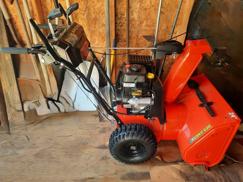 Ariens 24" Snowblower. Ariens 223 cc snowblower, model 920029, ST24DLE. Loc in shed. Items seen in background not incl.