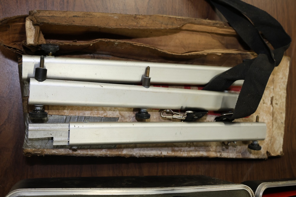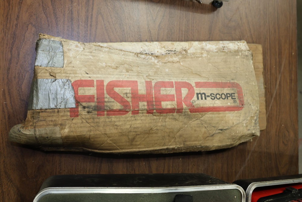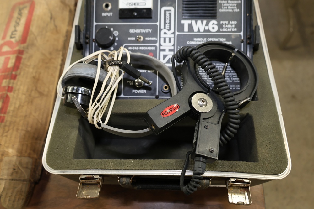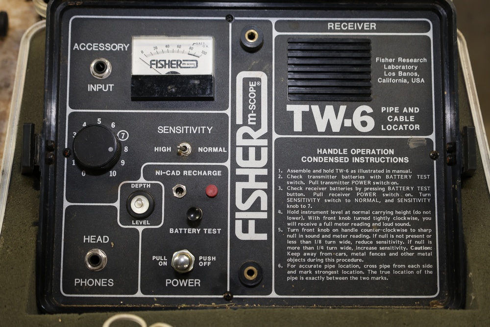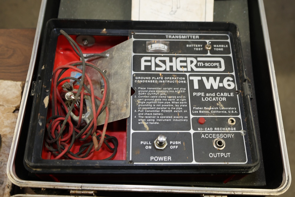 Fisher m-Scope TW-6 pipe and cable locator set by Fisher Research Laboratory, Los Banos, California, USA. Includes both receiver and transmitter units with controls for sensitivity, depth level, and Ni-Cad recharge, housed in a fitted metal carrying case. Designed for locating underground pipes, cables, and utility lines using electromagnetic signal tracing. Set includes connecting cables, headset, and adjustable aluminum handle assembly.