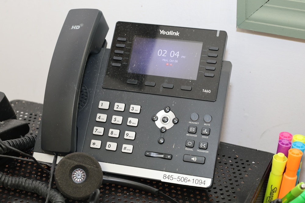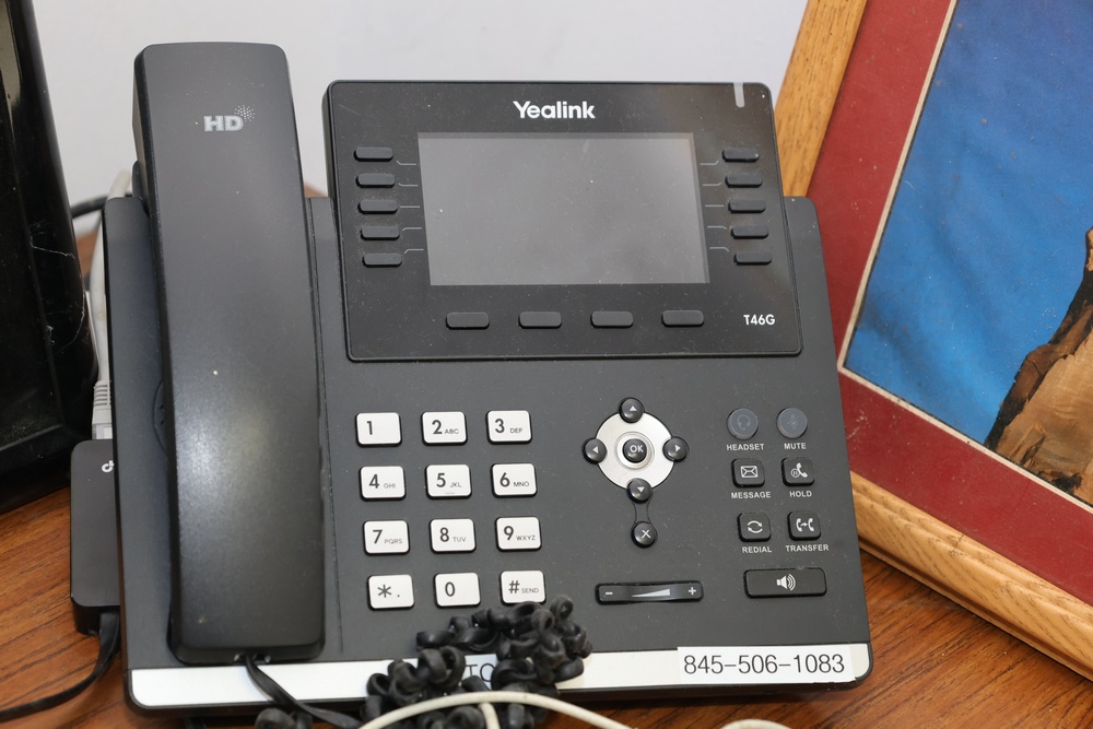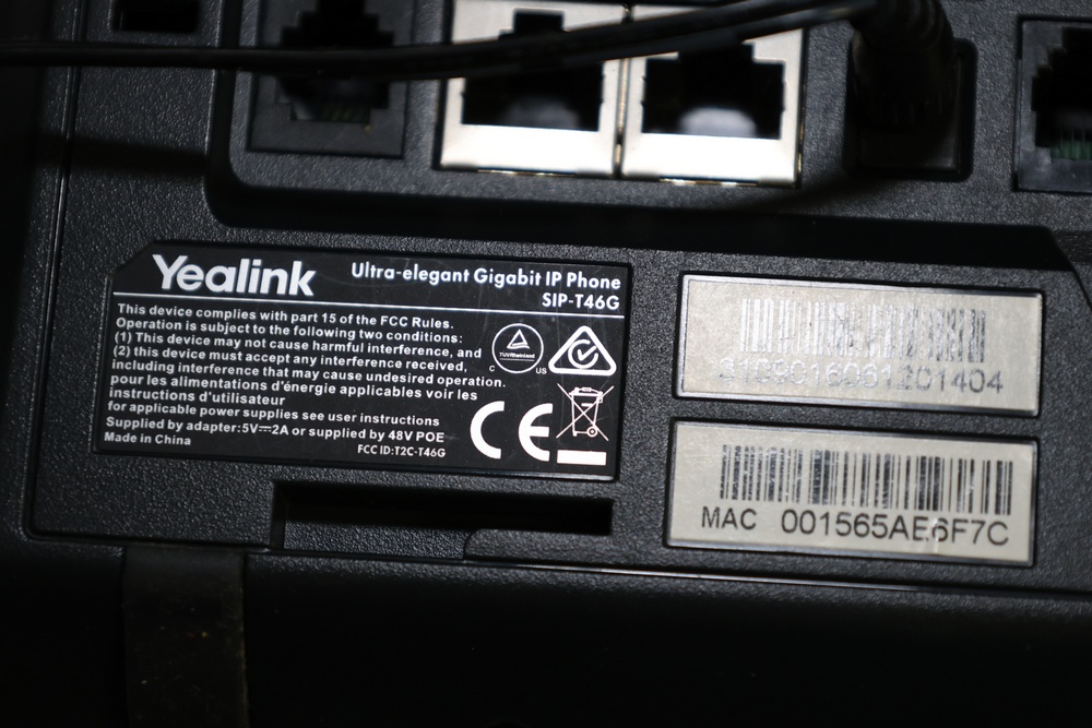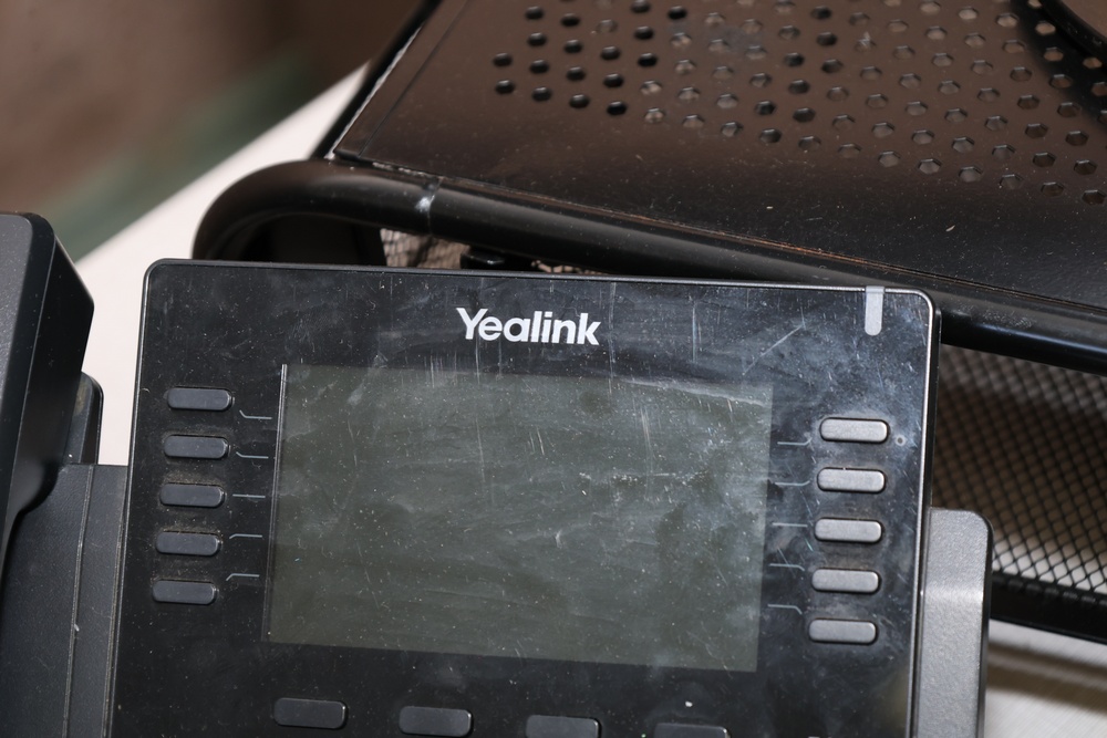Yealink T46G VoIP Phones with power cords and network connectivity ports. Each phone has functional tactile keys, an LCD display, and an HD handset. Suitable for office or business use. Includes additional monitors and a keyboard as shown.