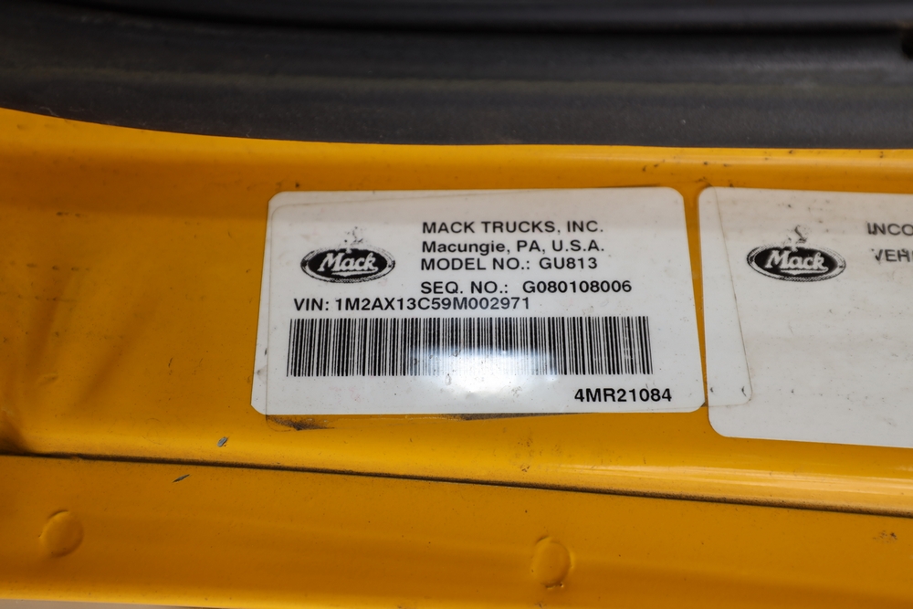 2009 Mack Granite GU813 Garbage Truck with Leach. VIN: 1M2AX13C59M002971.  Leach 20 yard rearload packer body. Allison transmission. Body: Chassis 2D. Engine: 10.8L I6 DI Diesel. Odometer reading: 82637. Hours reading: 20001. Seller reports: Runs, drives, operates. Title & key available.