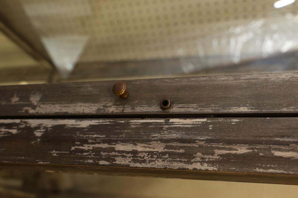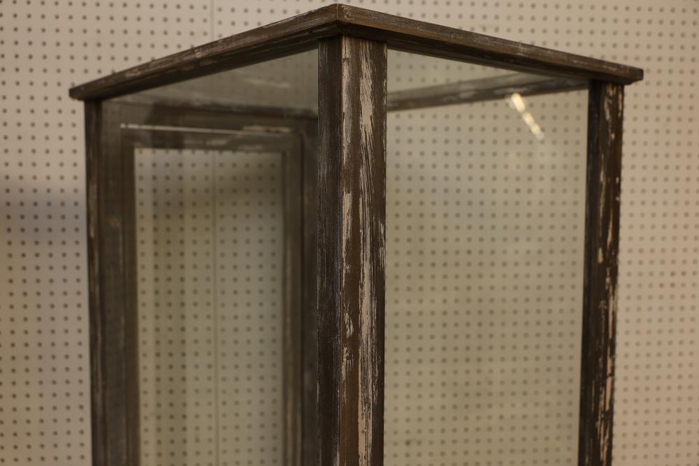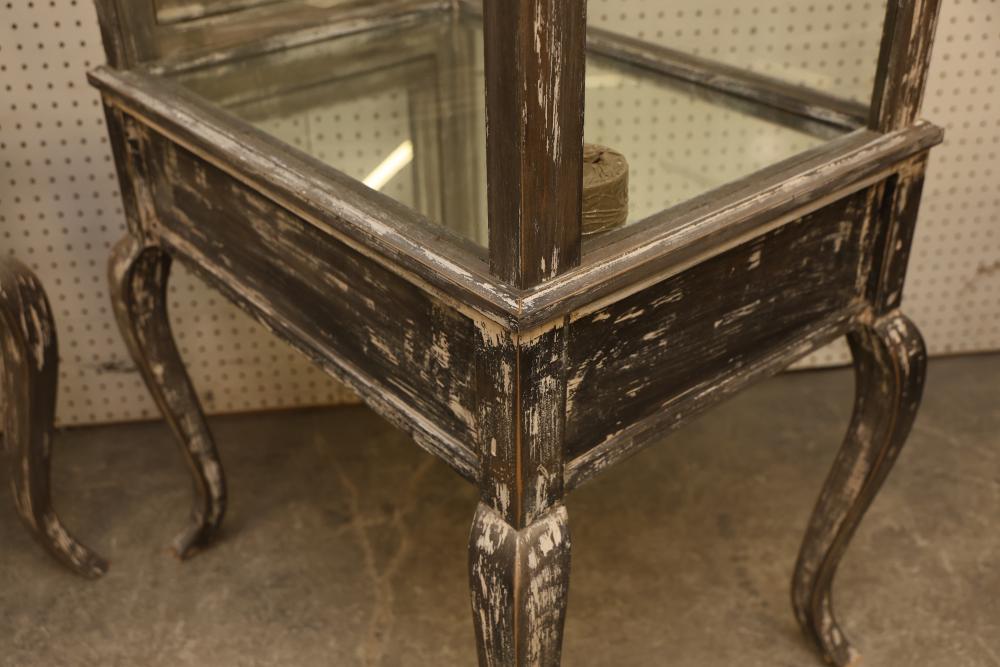 Two Weathered Display Cabinets with Glass Panels. Each cabinet features a wood frame with distressed finish, glass panels on all sides, and curved legs. The flat top and see-through design provide ample display space. No key available but doors are unlocked. Some hardware is included. 26inWx19inDx72.5inH, interior is 46inH Pickup only.