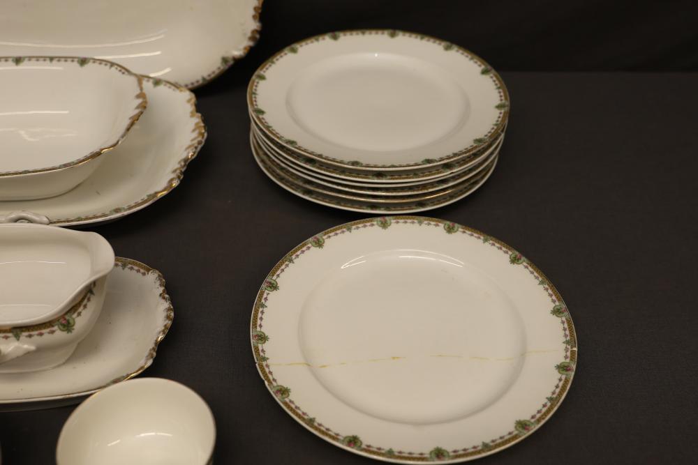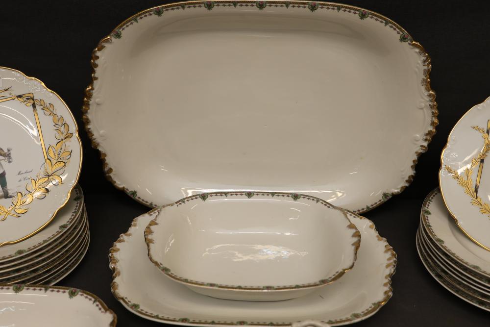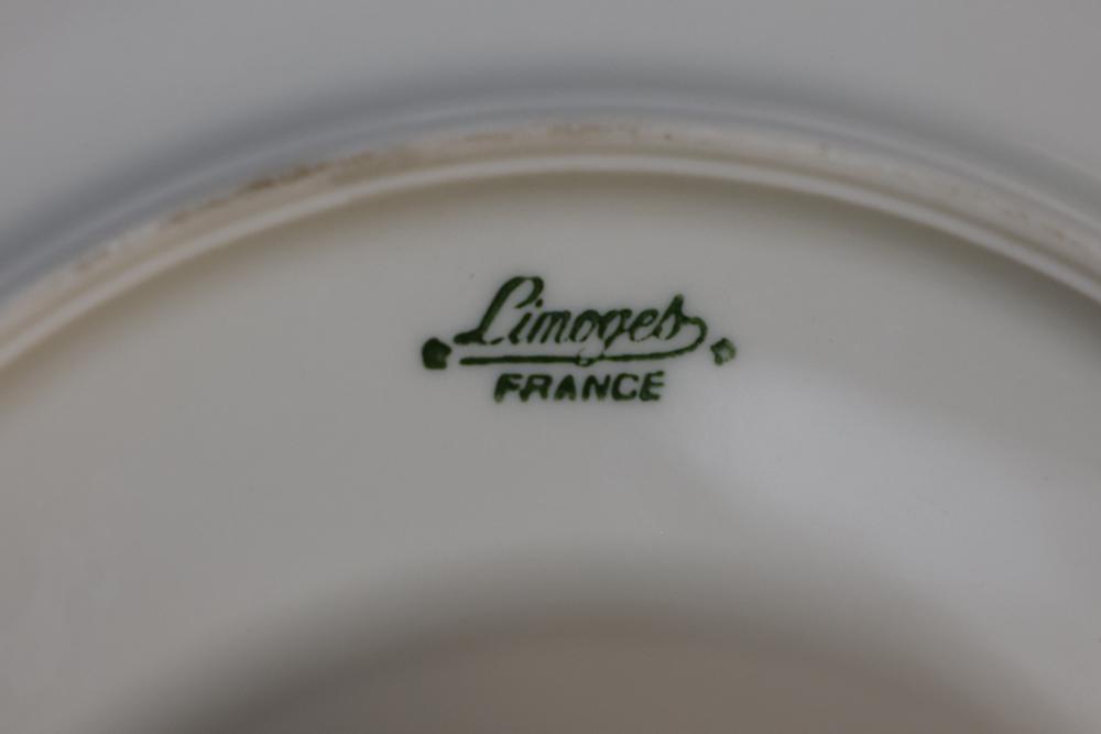 Limoges Porcelain Dinnerware Set Featuring Limoges Plates and Serving Pieces. This porcelain dinnerware features a variety of elegantly designed pieces, including multiple plates, bowls, serving dishes, and cups. Of particular note are the plates marked Limoges, featuring detailed illustrations and gold accents. Additional pieces feature decorative patterns to complement the set. Pickup only.