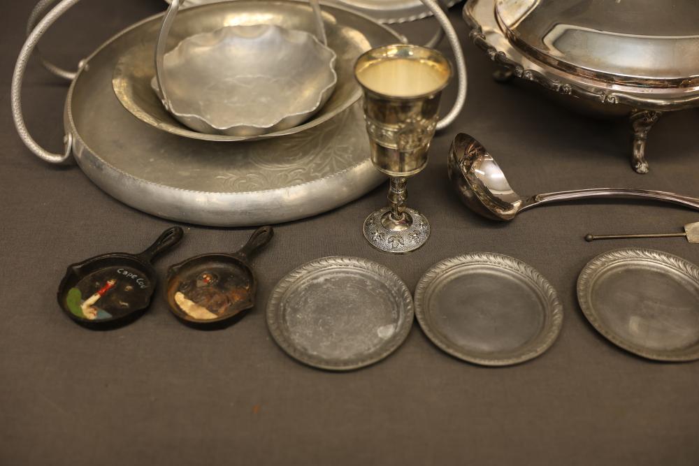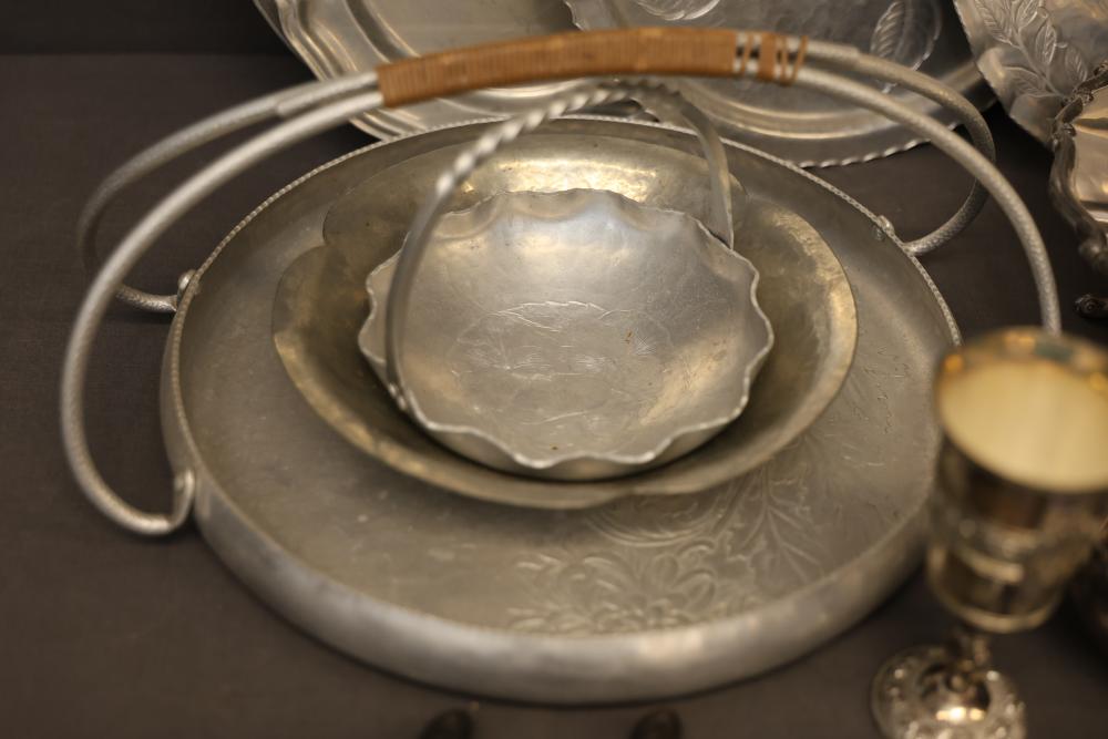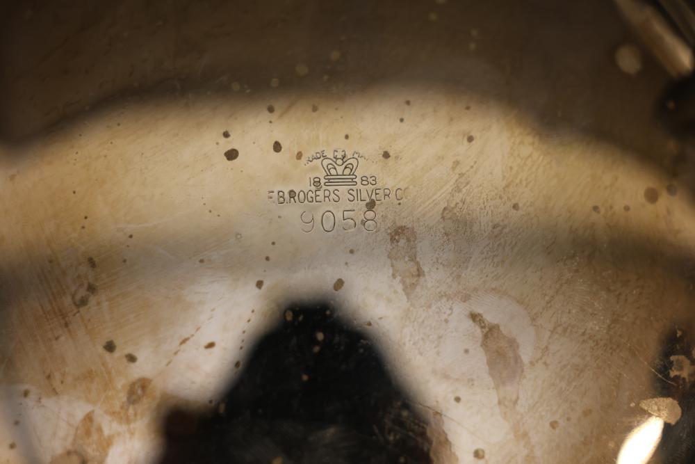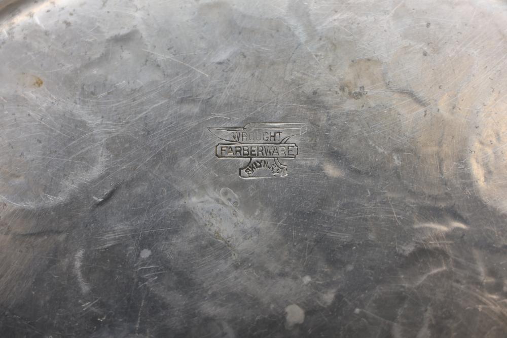 Decorative Metalware Including Rogers Silver and Farberware. This includes trays, pitchers, plates, serving bowls, and various decorative miniatures. The pieces showcase a mix of engraved and embossed details with various maker's marks, including Rogers Silver, Farberware, and additional stamped pieces. Sold as photographed. Pickup only.
