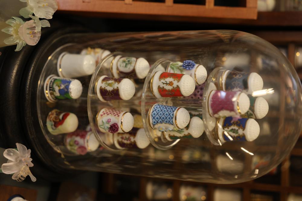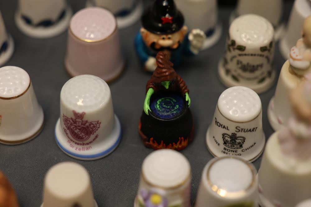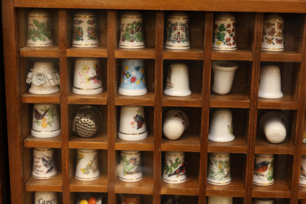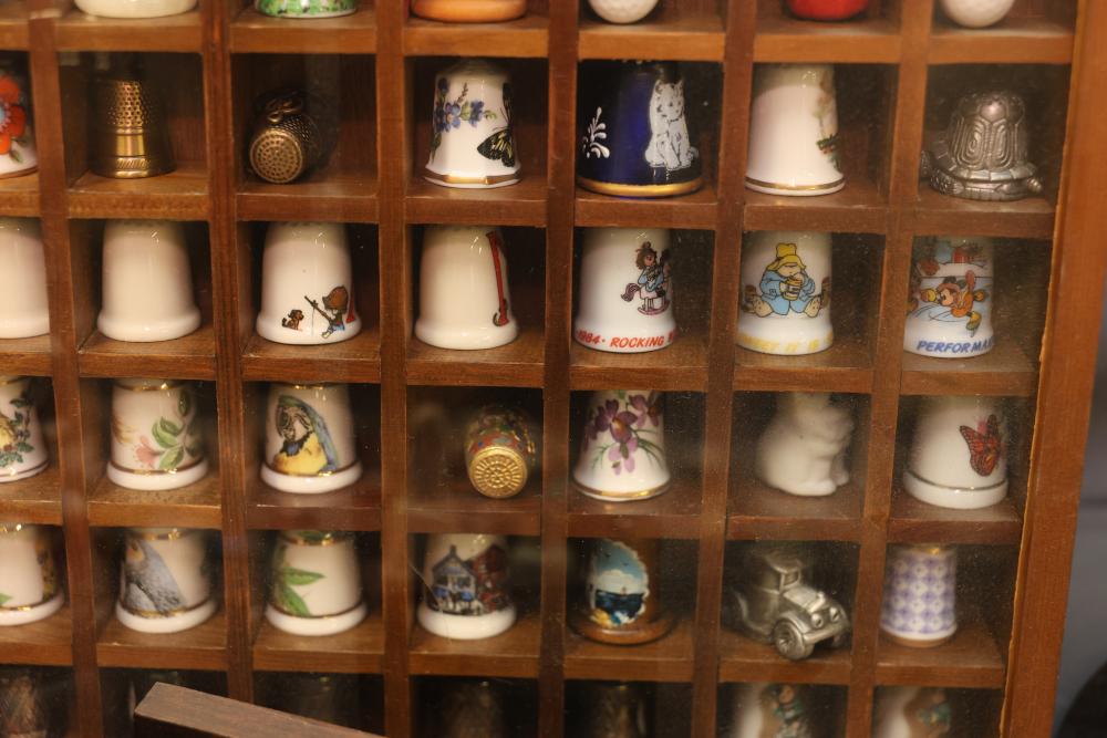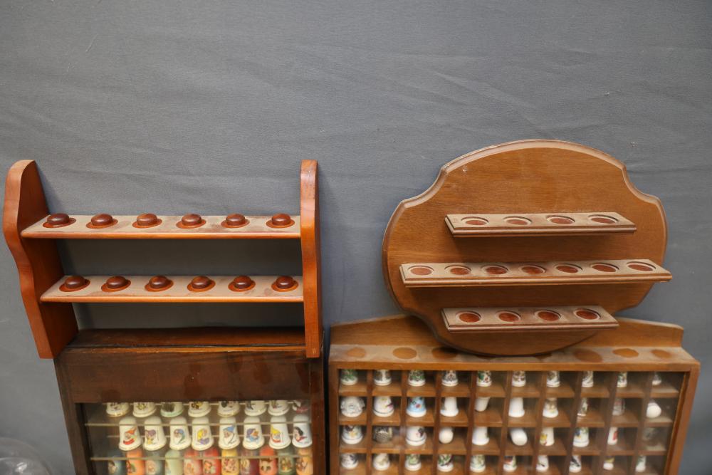 Extensive collection of decorative thimbles including ceramic, porcelain, and themed designs. Wide variety of intricate styles and motifs, with multiple custom display cases, shelves, and two glass dome display stands. Features notable collections such as Hummel-designed thimbles, animal-themed designs, and novelty figurines. Includes wood-framed wall-mounted cases and display racks. Pickup only.