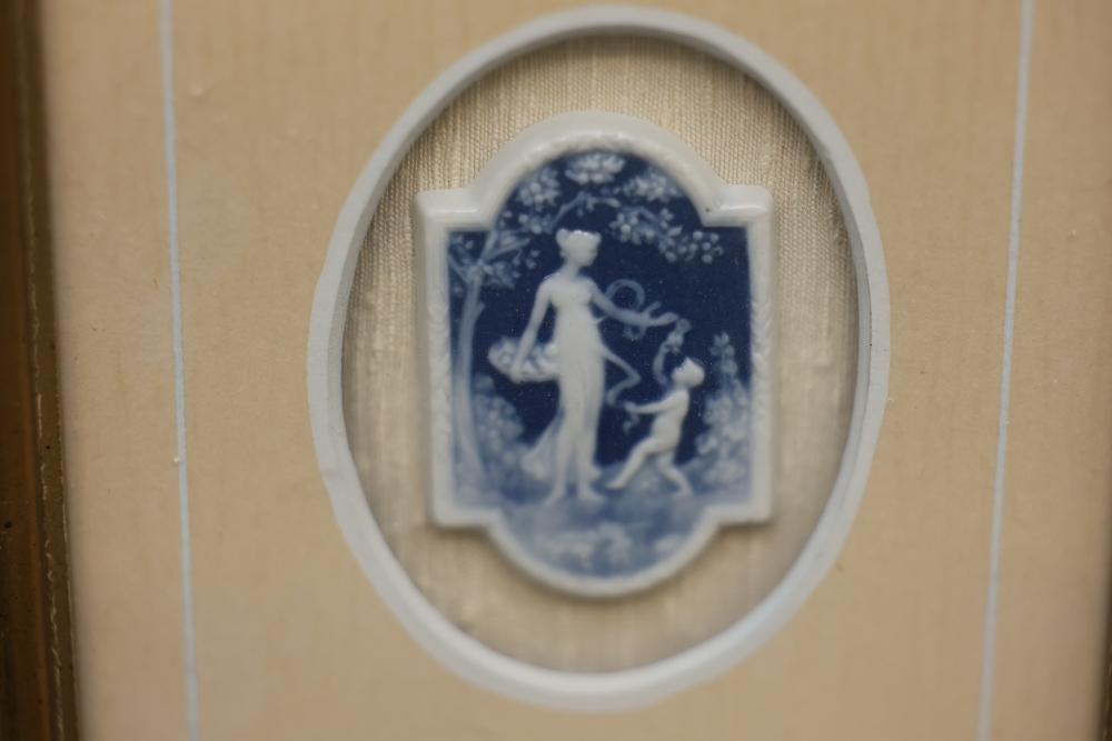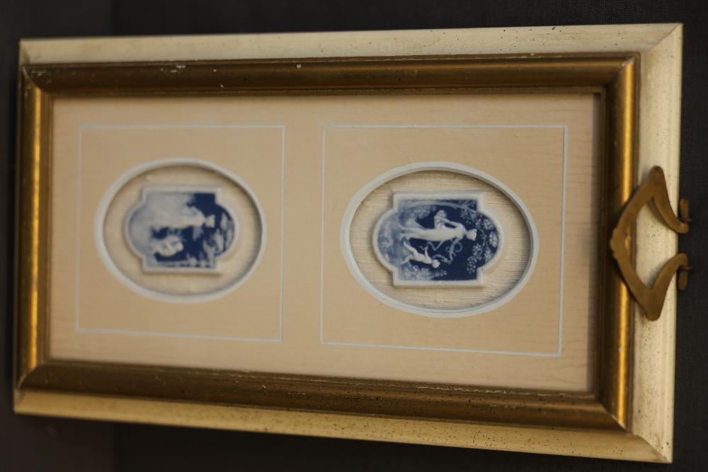 Two framed sets of blue and white relief plaques featuring figures in classical-style scenes. Each frame includes two individually matted oval plaques with detailed designs. Frames are gold-toned and include hanging hardware. Some wear is visible on the frame backs. Pickup only.