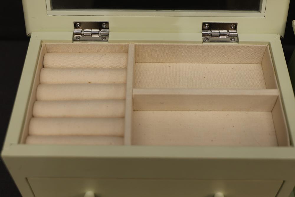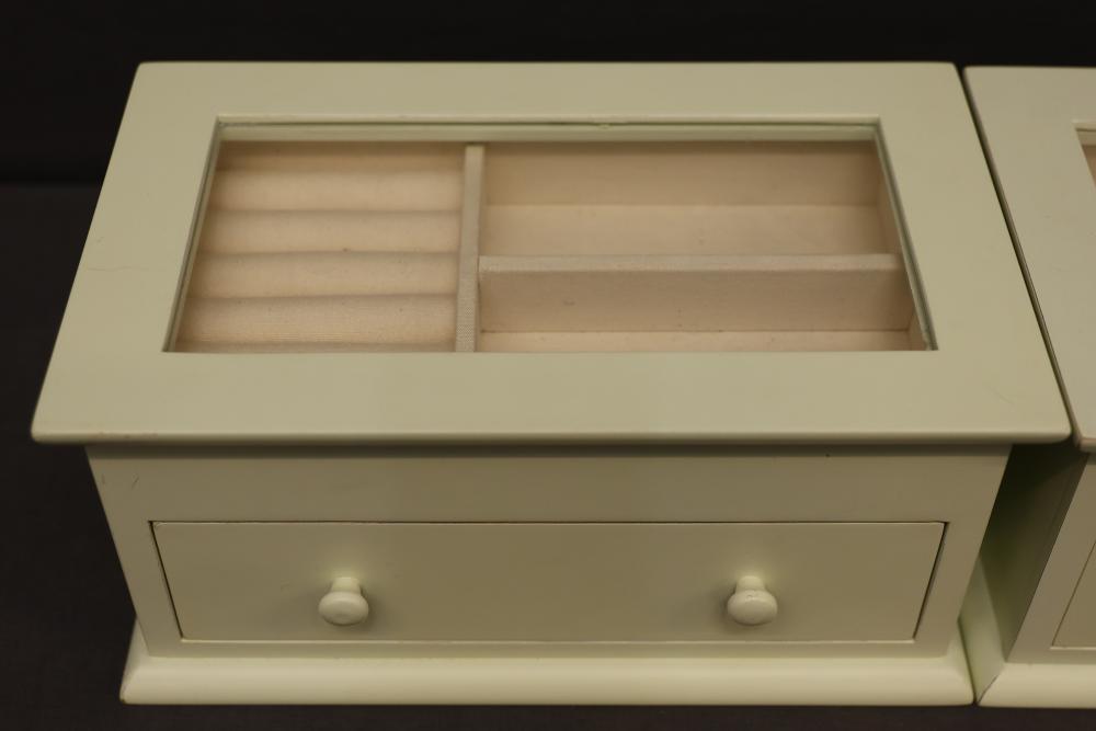Wooden Jewelry Boxes With Glass-Top Lids and Drawers. Each box has a hinged glass top for viewing its contents and includes divided compartments designed for organizing items. The interior of the top section has space for small items and rings, with cushioning provided for the latter. Below the top section is a pull-out drawer with additional divided space. Pickup only.