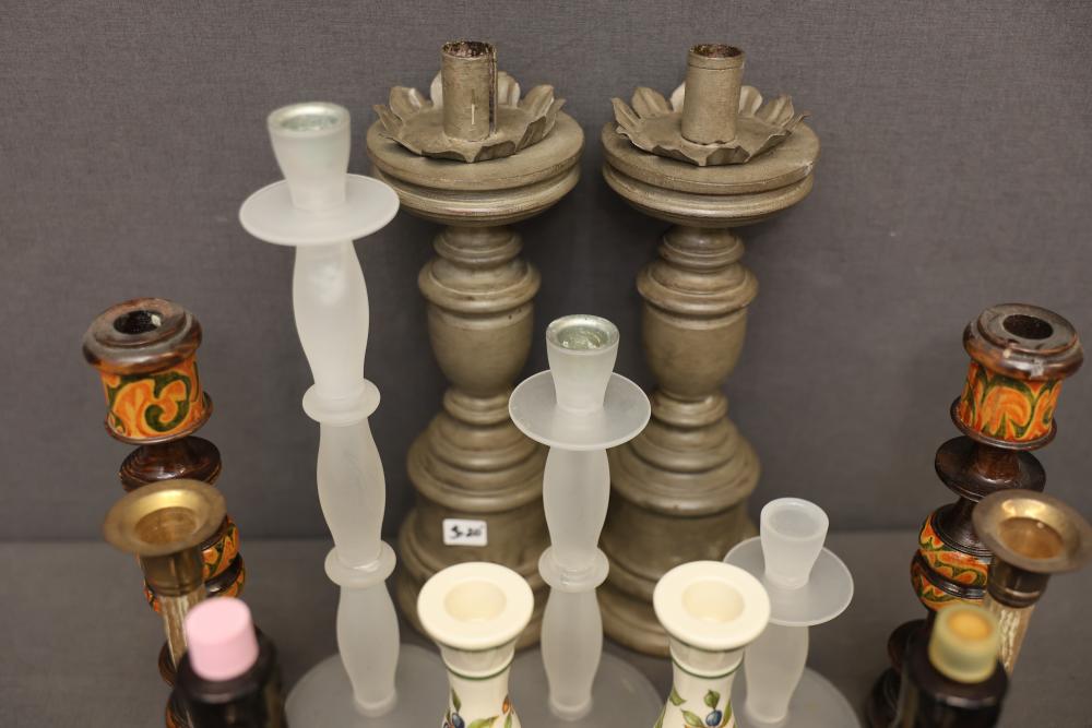 Candle holders in glass, metal, ceramic, and wood. Includes various designs and finishes, including frosted glass, silver-tone metal, hand-painted ceramic with fruit motifs, carved wood, and pressed glass. Several single holders and one double-light pressed glass holder. Pickup only.