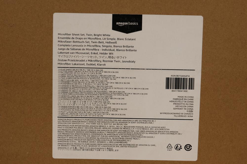 New in box bedding items including one down alternative comforter set for twin beds, sheet sets, and mattress bags. Items are sealed in original packaging. Comforter set box details include a twin white option. Mattress bags are suitable for queen and king mattresses. Pickup only.