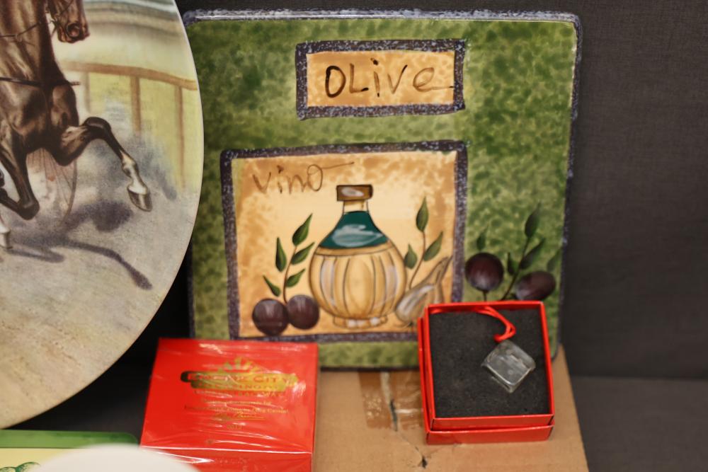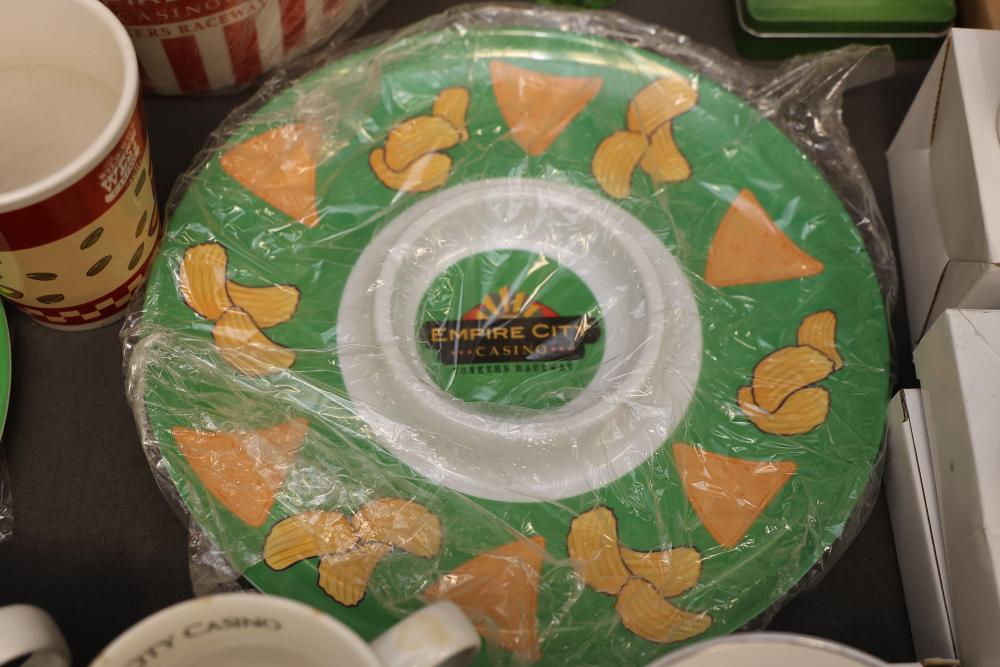 Tableware and Decorative Items Featuring Empire City Casino Branding. Includes two horse racing plates, branded mugs, serving dishes, bowls, and square plates. Features various patterns including racing themes and Empire City Casino logos. Suitable for tabletop and decorative purposes. Pickup only.