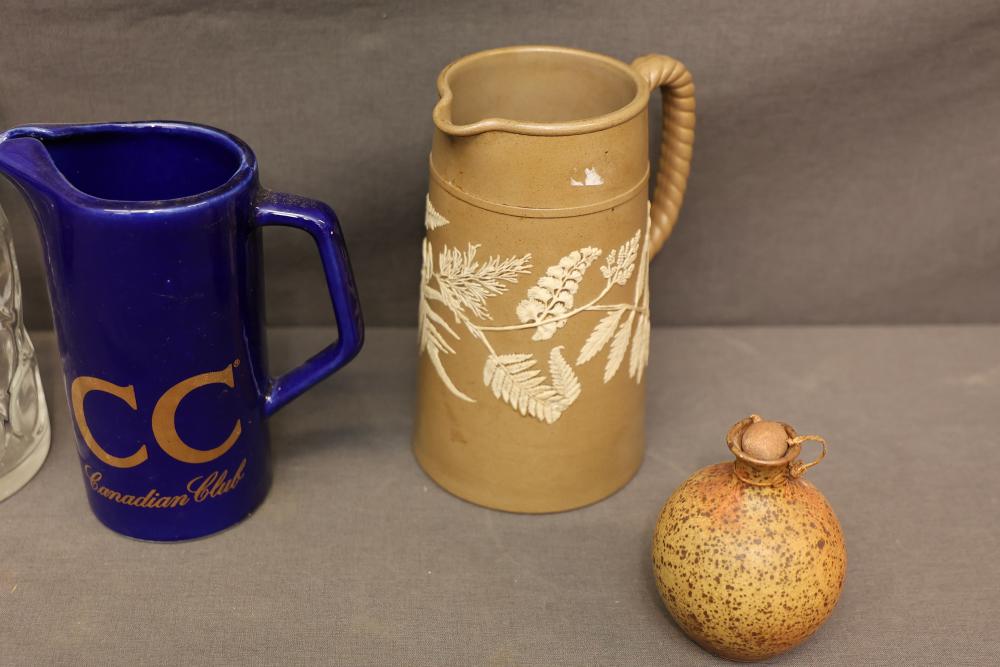 Ceramic and Glass Pitchers and Steins. Includes a brown ceramic pitcher with raised floral design, a blue ceramic Canadian Club pitcher, two Lowenbrau glass beer steins with logos, and two brown ceramic storage bottles. Pickup only.