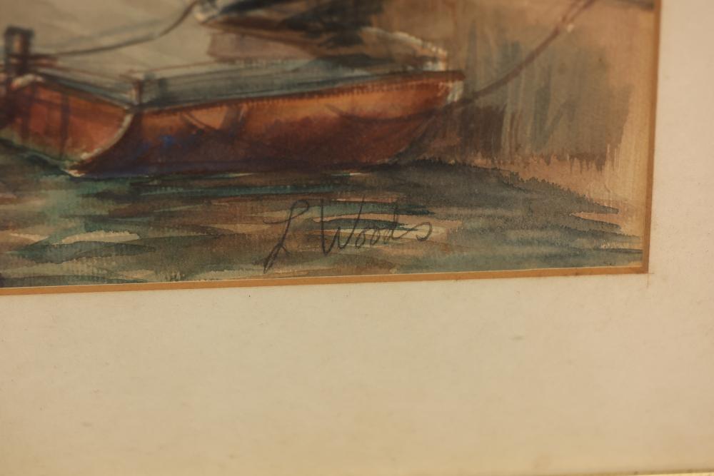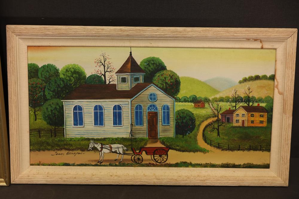 Framed Watercolor, Oil, and Acrylic Paintings by Various Artists. Includes three artworks: a harbor scene watercolor signed by L. Wates, an oil painting of a serene landscape with figures signed Elysa, and an acrylic painting depicting a church and countryside signed Jonas Bradford. Pickup only.