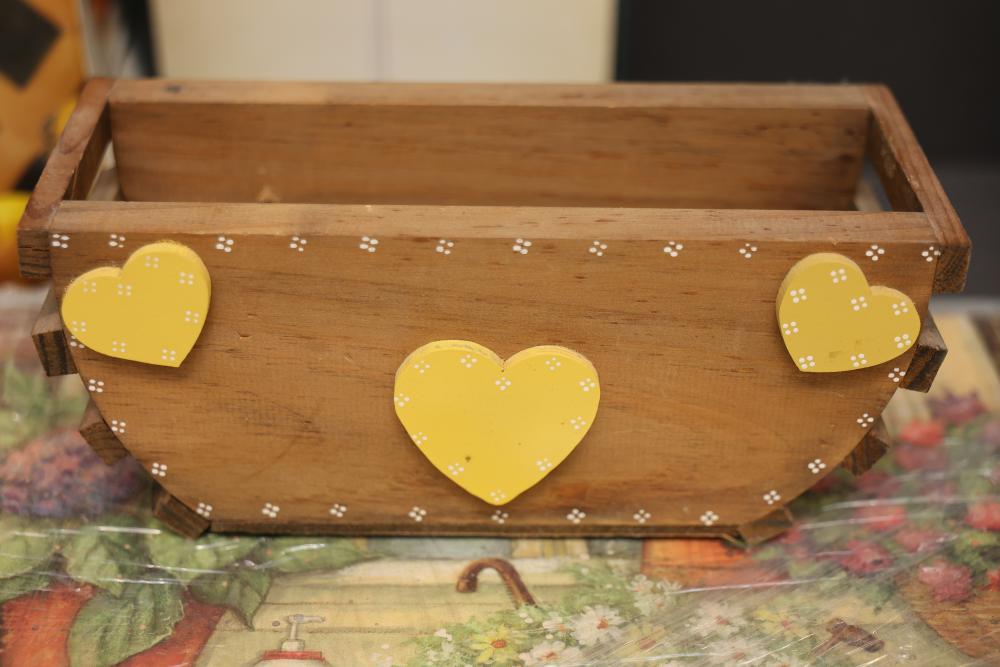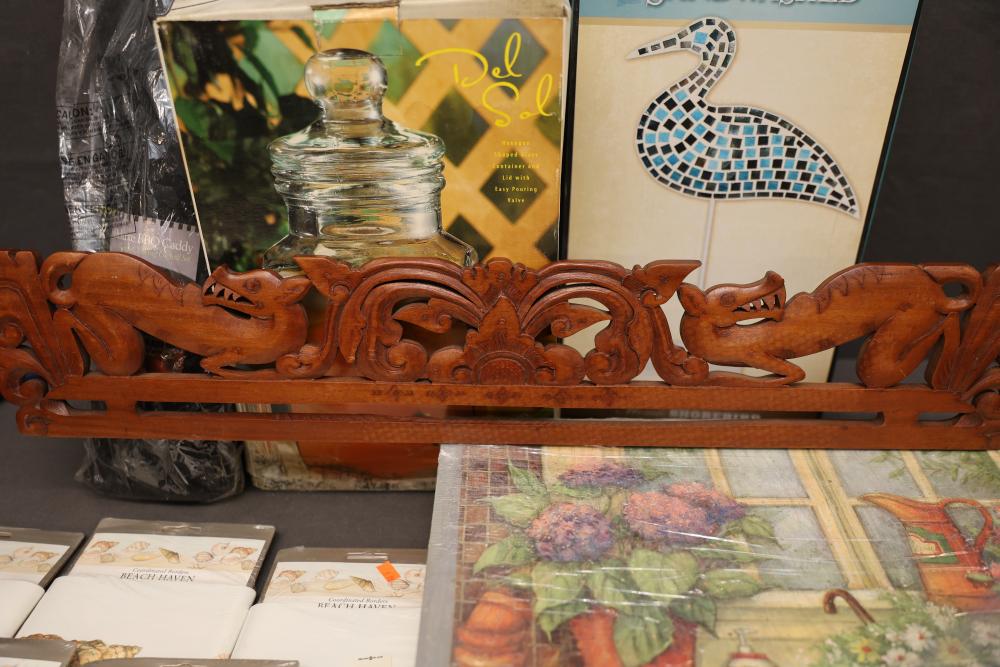 Home decor items, including a carved wooden panel with a dragon motif, a ceramic planter with heart accents, a framed floral artwork, a mosaic heron design, a plastic storage drawer, decorative seashell napkins, and a boxed glass beverage dispenser. Items are in varied materials and designs, with some boxed or wrapped. Pickup only.