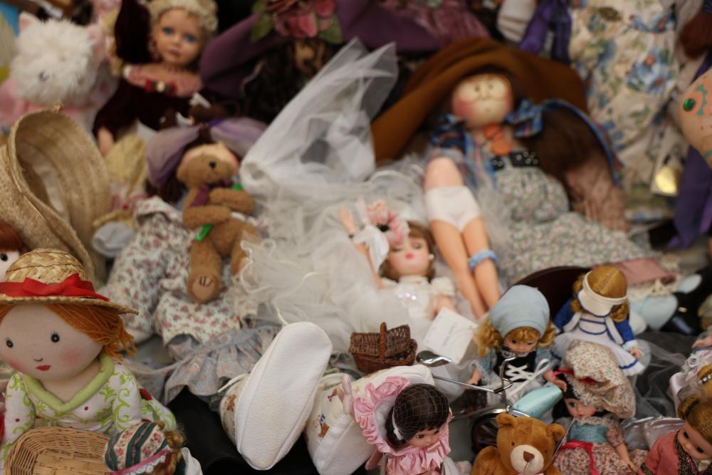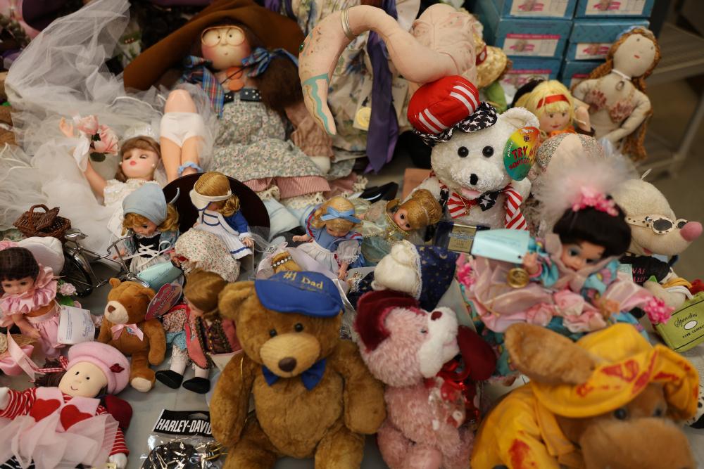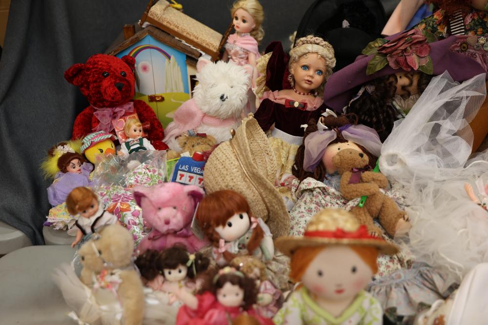 Dolls and plush toys with styles including porcelain collectible dolls, cloth dolls, teddy bears, and plush stuffed animals. Notable brands include "Christine Durand" limited-edition porcelain dolls. Includes multiple accessories such as hats and small decorative elements. Pickup only.