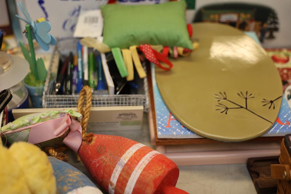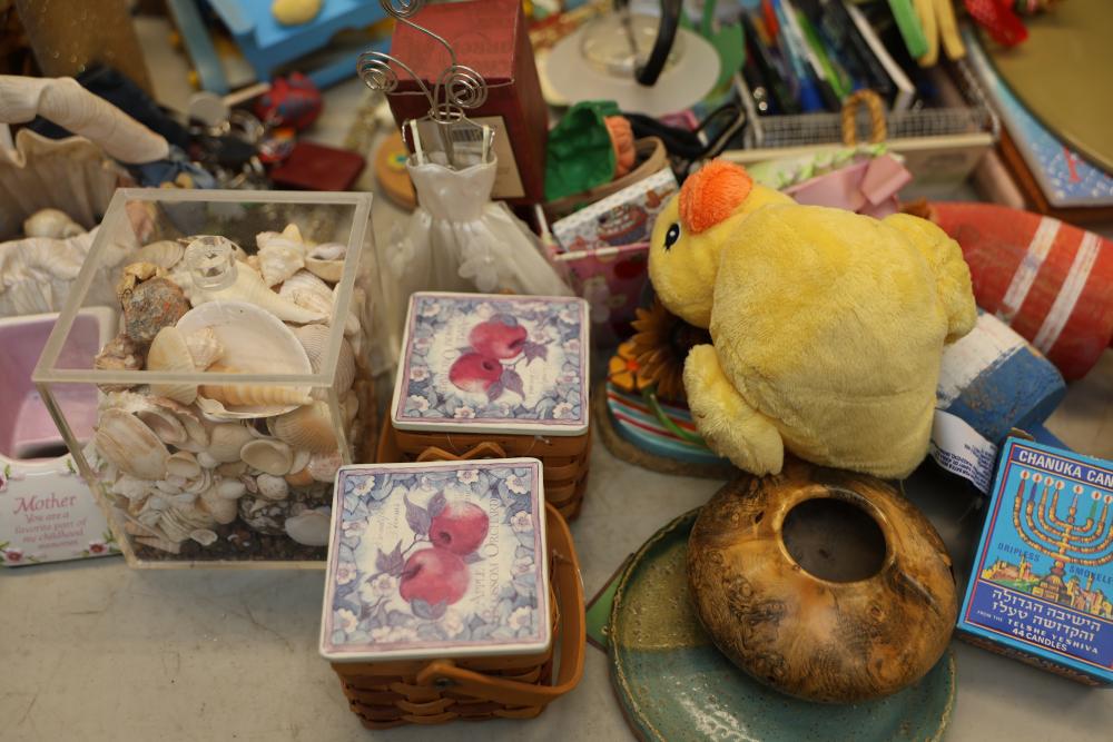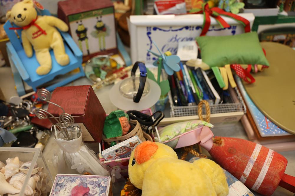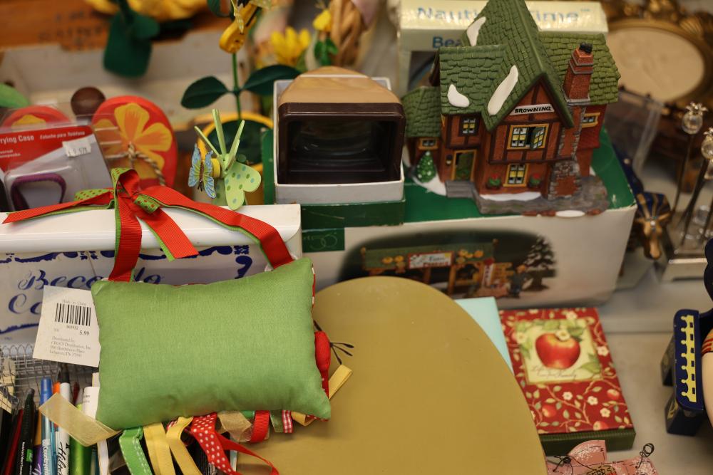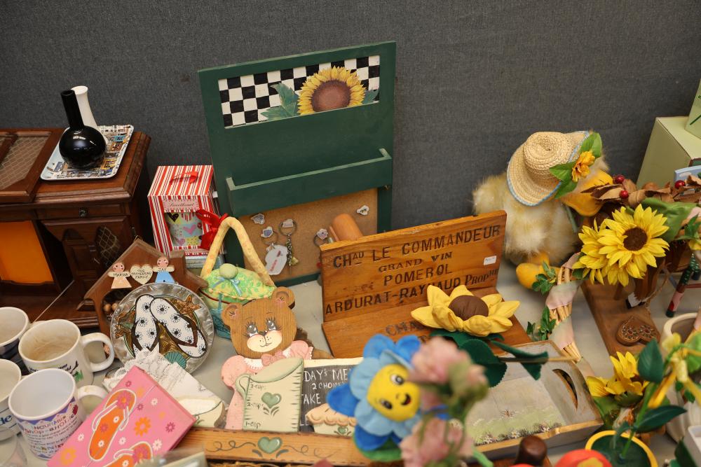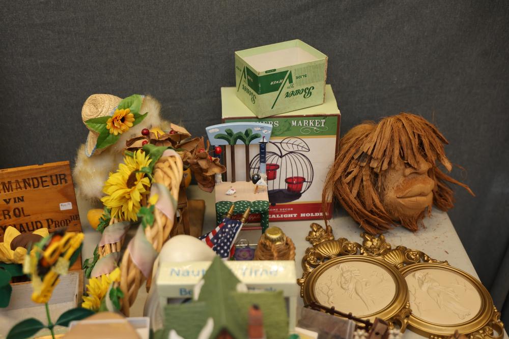 Home Decor, Toys, Kitchenware, and Collectibles. Includes a variety of home decor items such as framed art, metal and ceramic wall hangings, miniature Dickens Village houses, sunflower-themed pieces, and decorative baskets. Features a selection of toys including stuffed bears, plush flowers, and figurines of women in beach chairs. Kitchenware includes coffee mugs, small baskets, a ceramic serving plate, and a vintage spice box. Additional items include decorative pillows, seashells in a clear case, painted signs, stationery, pens, and a wooden shelf. Pickup only.