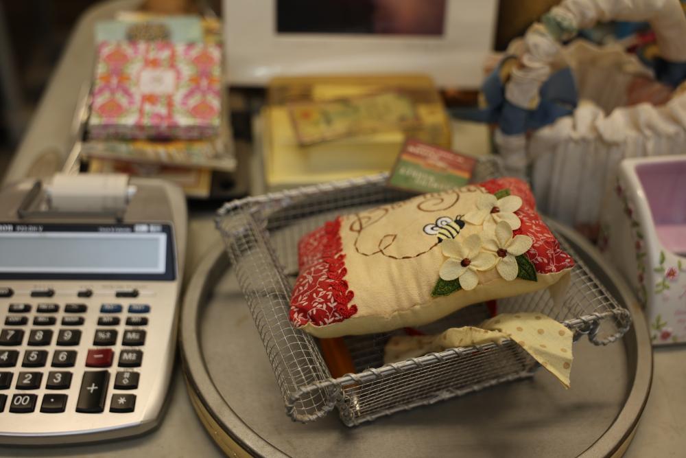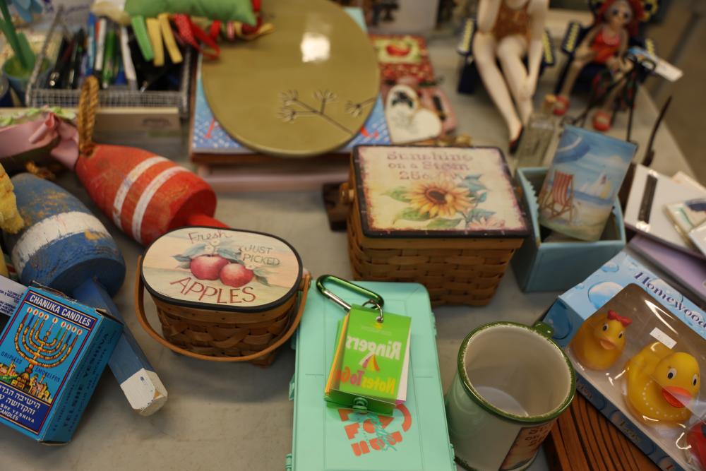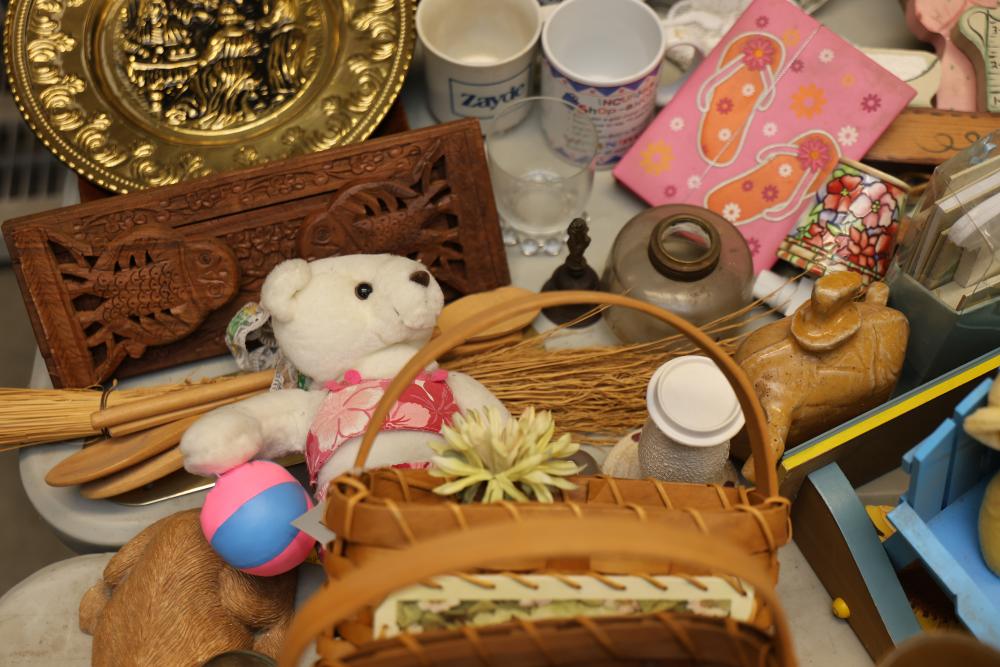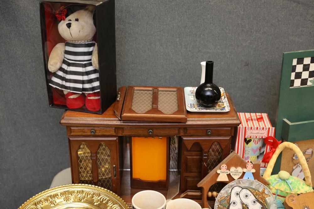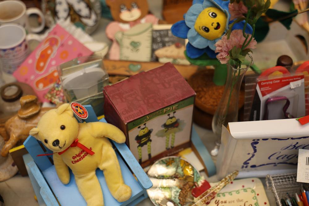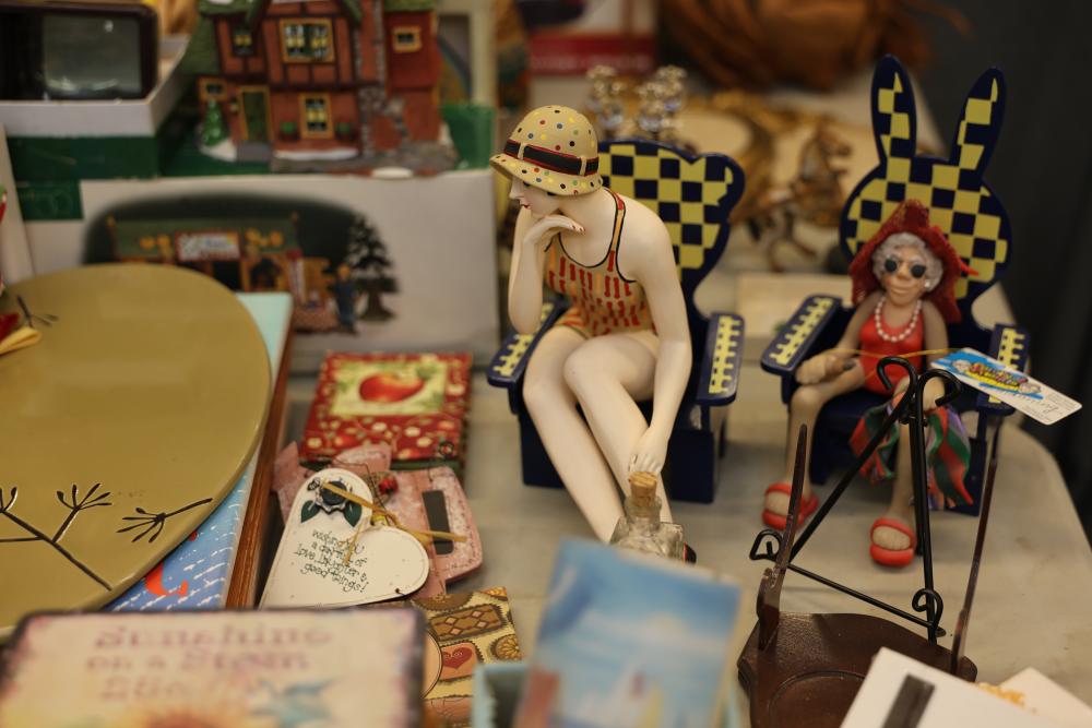 Home Decor, Toys, Kitchenware, and Collectibles. Includes a variety of home decor items such as framed art, metal and ceramic wall hangings, miniature Dickens Village houses, sunflower-themed pieces, and decorative baskets. Features a selection of toys including stuffed bears, plush flowers, and figurines of women in beach chairs. Kitchenware includes coffee mugs, small baskets, a ceramic serving plate, and a vintage spice box. Additional items include decorative pillows, seashells in a clear case, painted signs, stationery, pens, and a wooden shelf. Pickup only.
