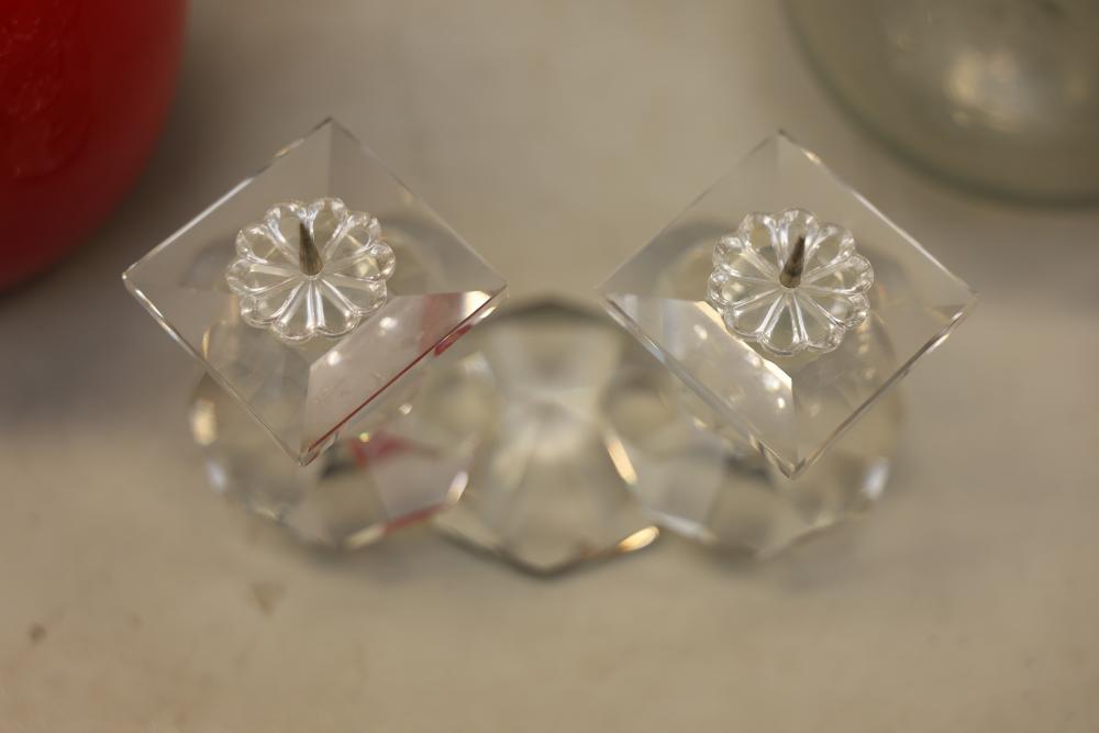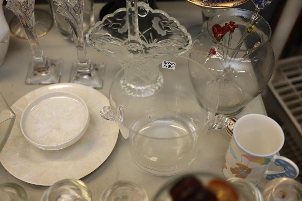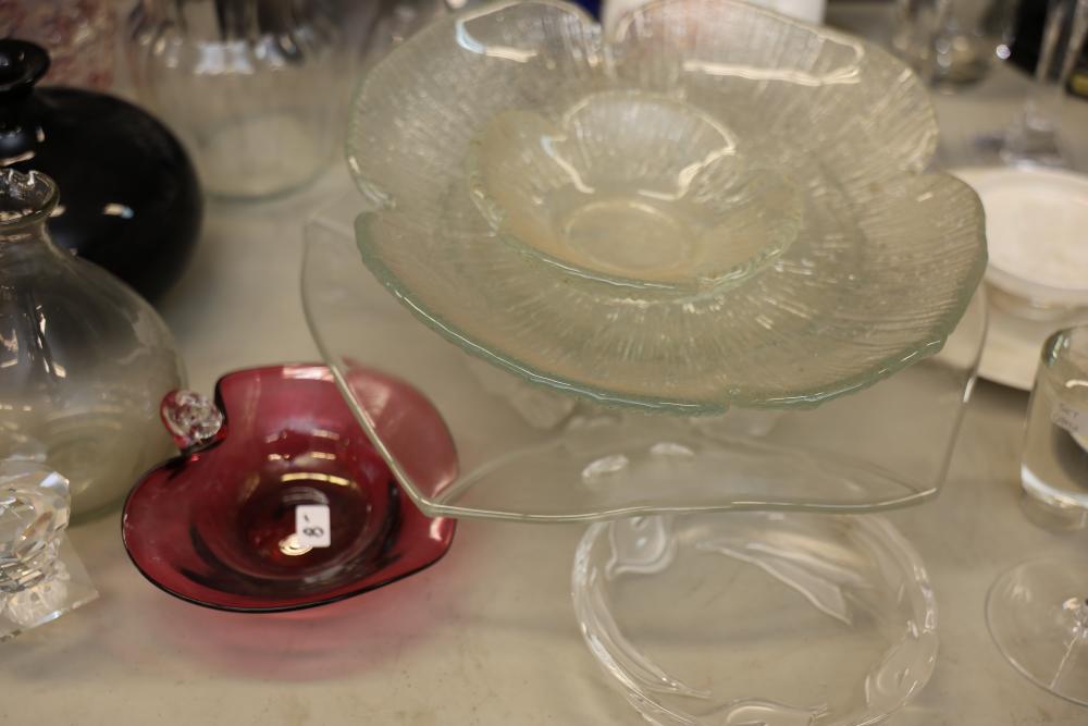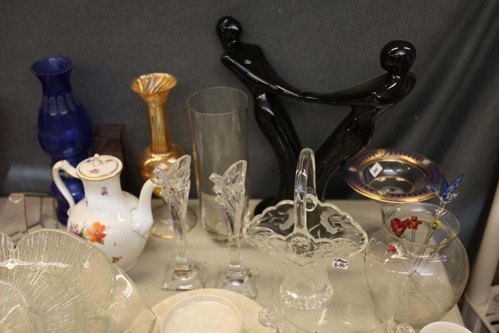 Decorative glassware collection features a variety of styles, including Mikasa red vessels and items embellished with Swarovski crystal. Includes ruffled and fluted vases, etched serving dishes, clear and colored glass bowls, decanters, candleholders, and figurines. Swarovski crystal pieces and Mikasa branding are identifiable on specific items. Pickup only.