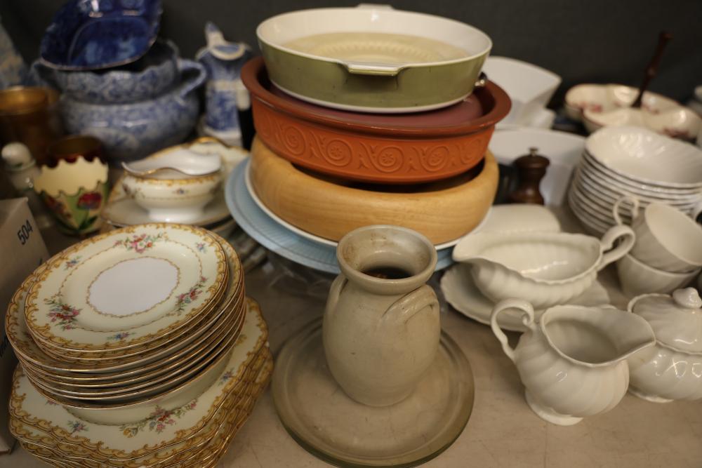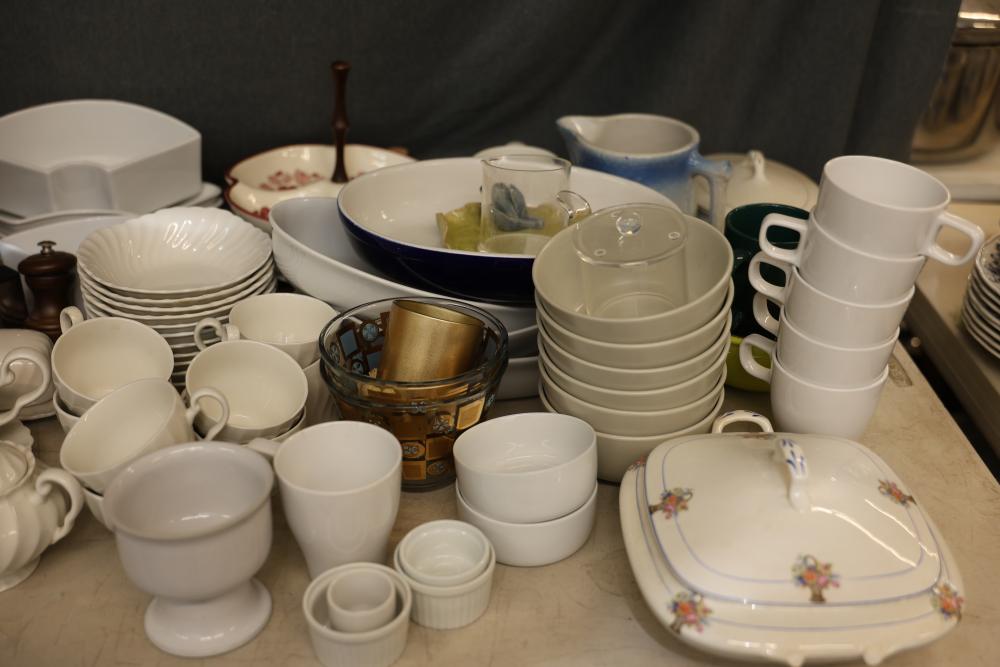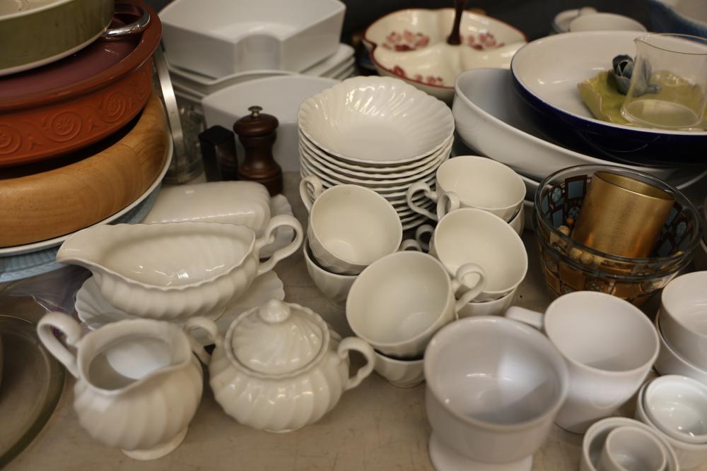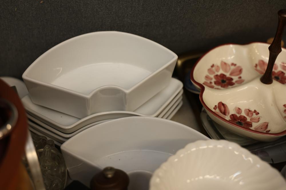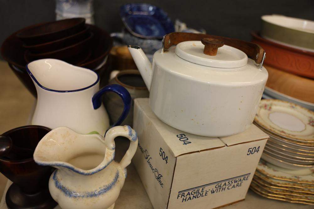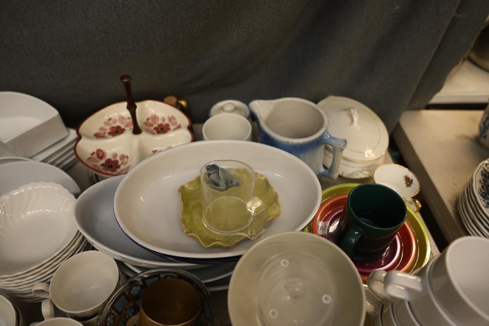 Tableware and Kitchenware Including Ceramic, Porcelain, and Glass Pieces. Includes an array of dinnerware, serveware, and drinkware such as cups, saucers, plates, serving platters, bowls, creamers, teapots, pitchers, and multi-section dishes. Notable pieces include blue and white ceramic items, floral-patterned porcelain items, and a range of glass and metal accents. Pickup only.