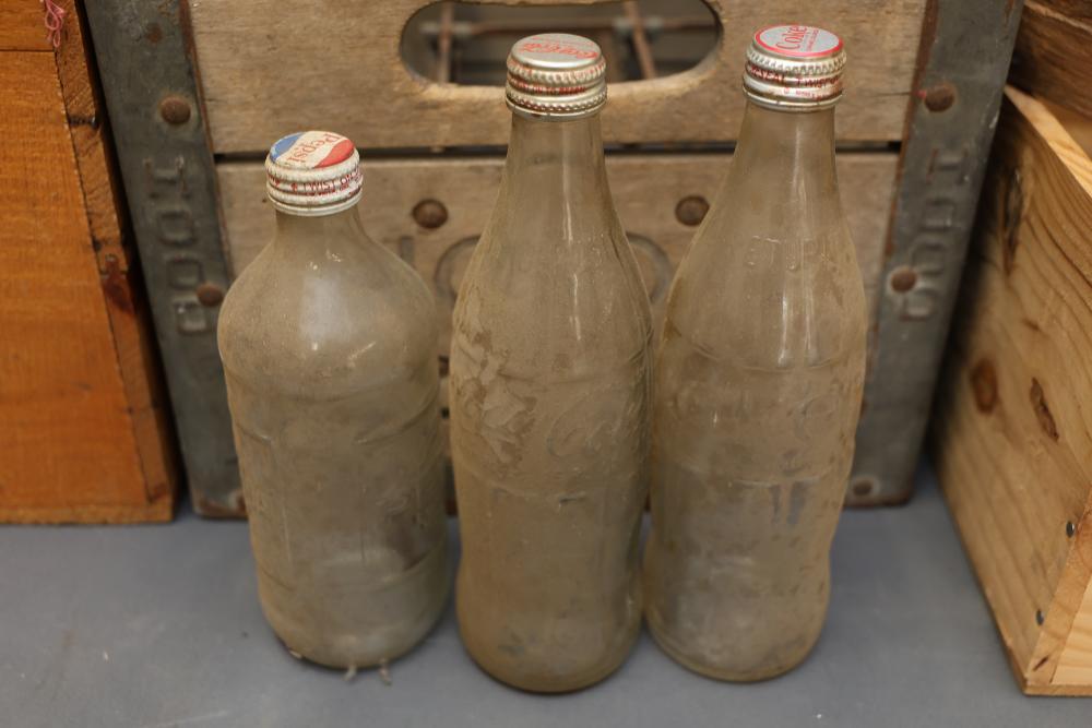 Vintage Bottles, Wooden Crates, and Metal Containers. Includes glass bottles with original caps, a wooden crate marked 'Chateau Gloria St. Julien,' another wooden crate with dividers, a metal bottle carrier holding Coca-Cola bottles, a green-lidded round container, a large ceramic jug, and various glass and metal vessels. Pickup only.
