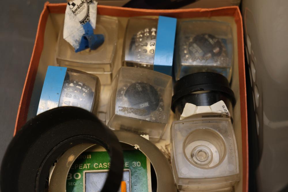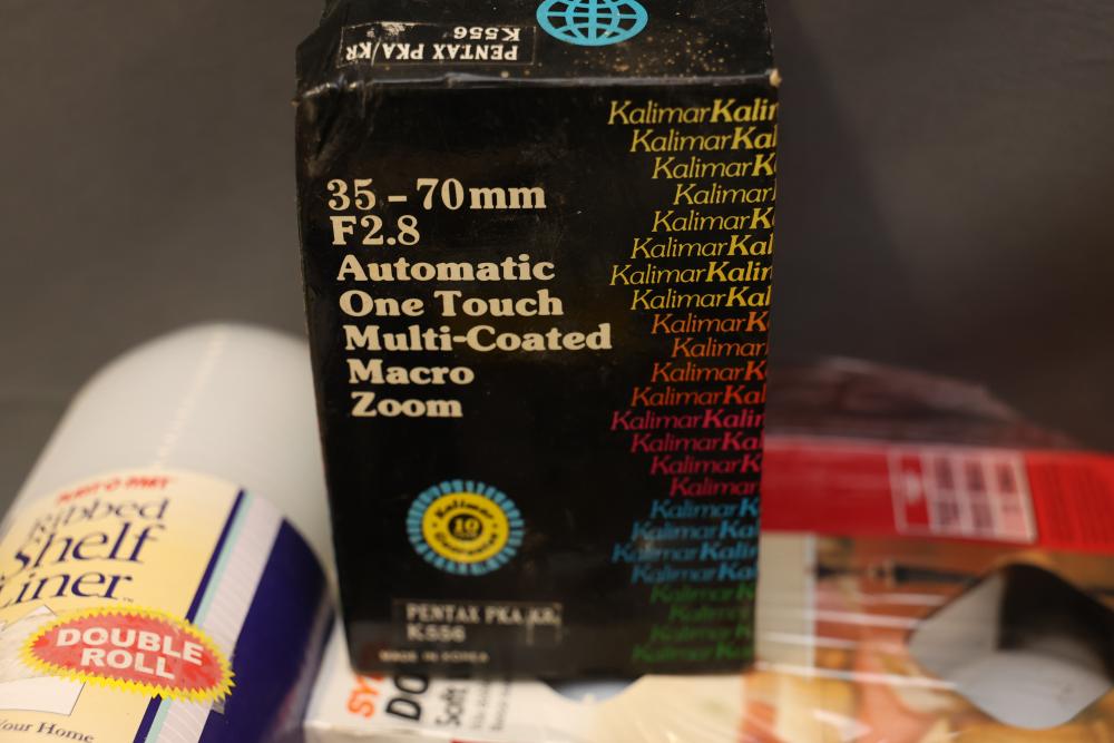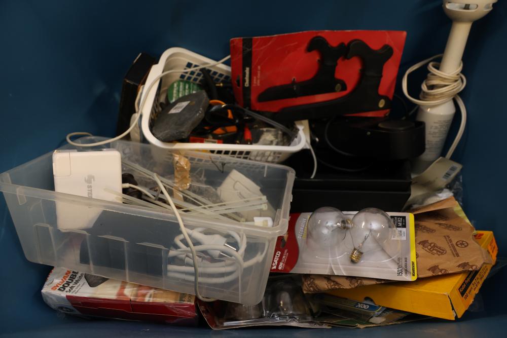 Home and hardware items including gloves, light bulbs, camera lens, and smoke alarm. Includes utility gloves, energy-efficient light bulbs, a boxed 35–70mm F2.8 camera lens, a BRK smoke alarm, an IBM-branded ink cartridge, ribbed shelf liner, and a portable vacuum. Also includes metal cups, assorted hardware, a calculator, and a collection of small packaged items. Pickup only.