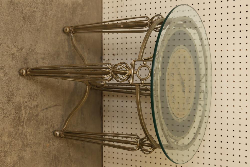 Glass-Top Metal Table with Integrated Clock, Approximately 21 Inches in Diameter and 23 Inches in Height. Features a round clear glass top supported by metal legs with decorative elements and an integrated clock housed beneath the glass surface. The clock mechanism is battery-operated, with access located on the underside. Pickup only.
