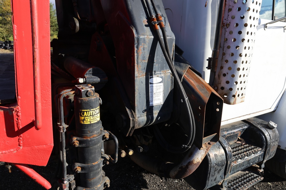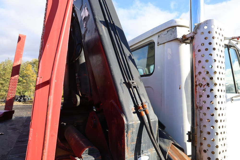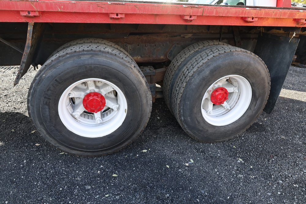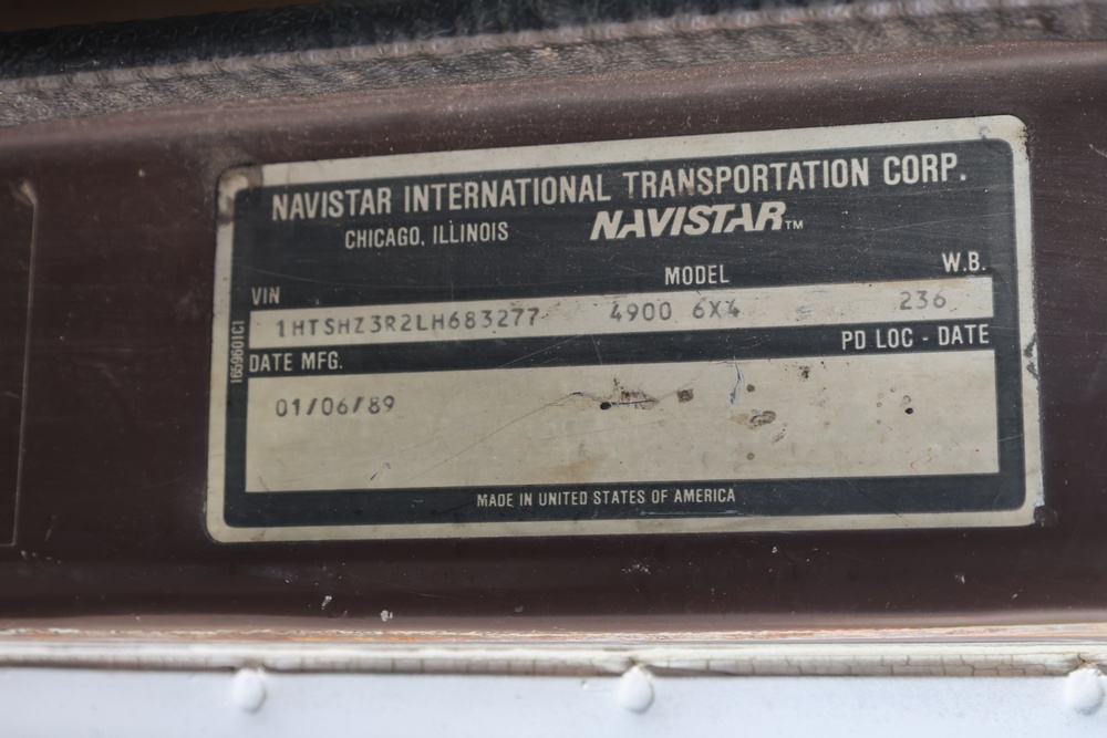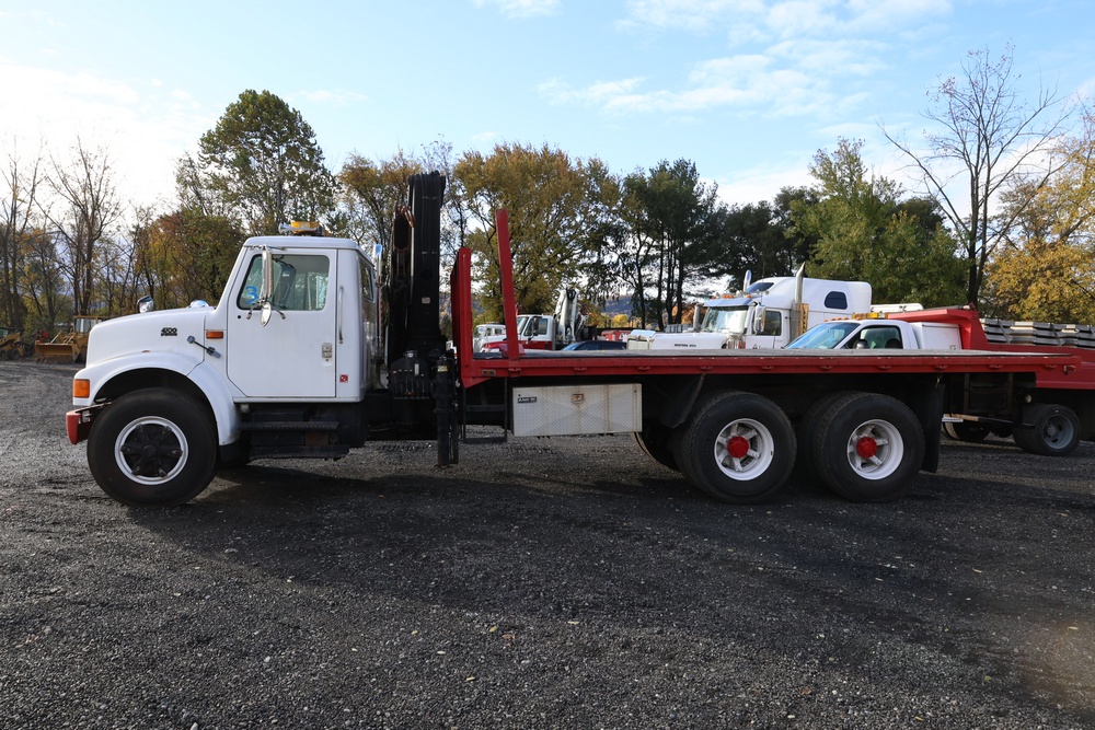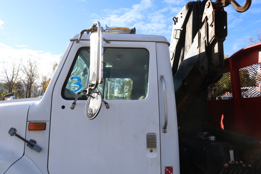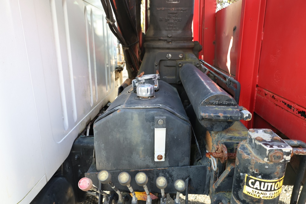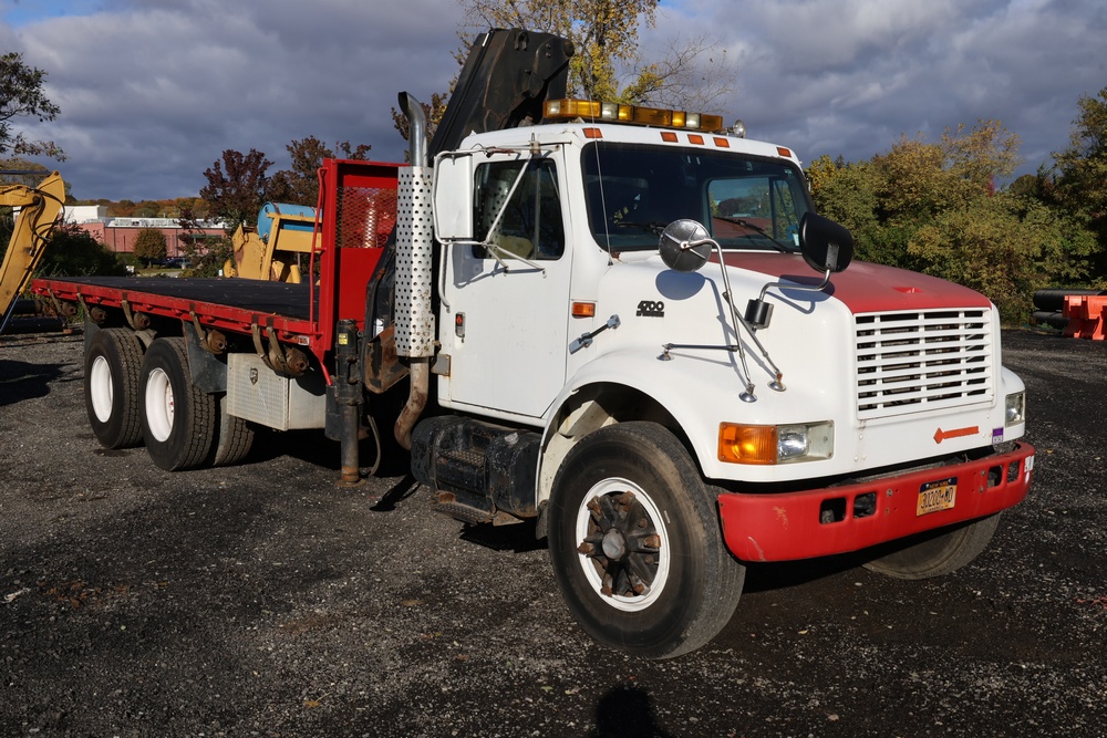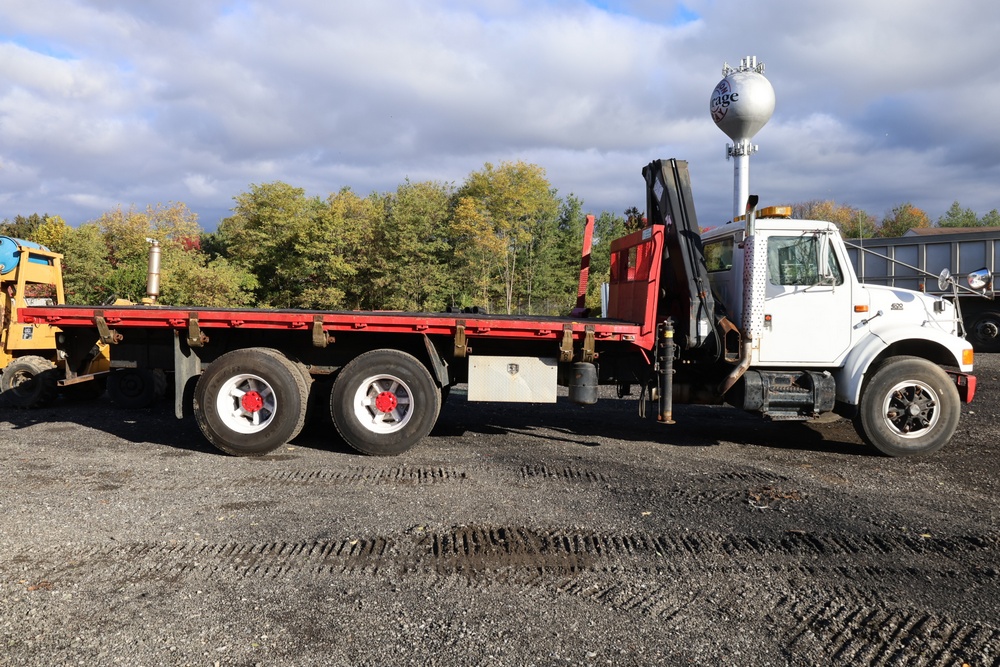 1990 International 4900 flatbed truck with hydraulic crane with a 7.6L L6 DIESEL engine. VIN: 1HTSHZ3R2LH683277. Odometer reading: 42,150 miles. Equipped with a diesel engine, automatic transmission, and dual rear wheels. Exterior: White cab with red front bumper and red flatbed. Interior features manual windows, climate control, AM/FM cassette radio, and power divider lock switch. Vehicle includes a flatbed, front crane mounting, side stake pockets, and hydraulic outriggers. Tire configuration: tandem rear axles with Continental HSC tires. Runs and drives. Title and key available.