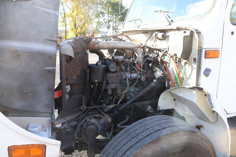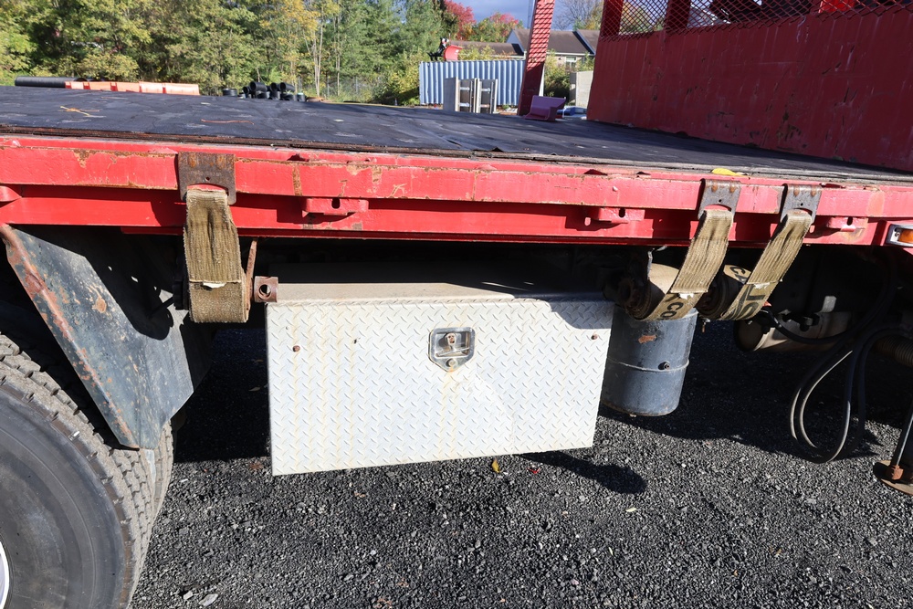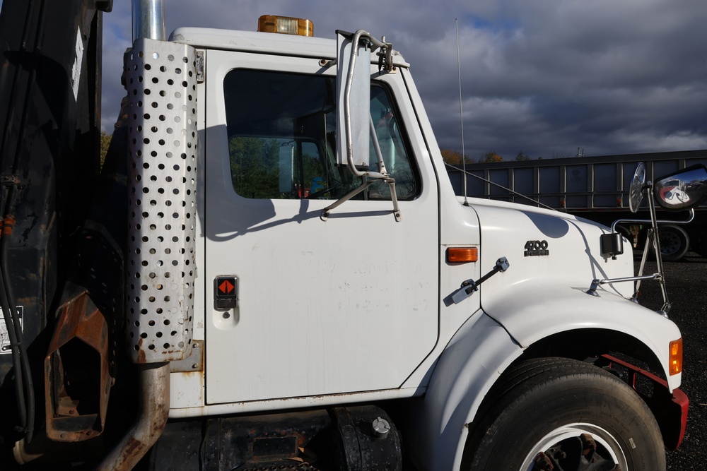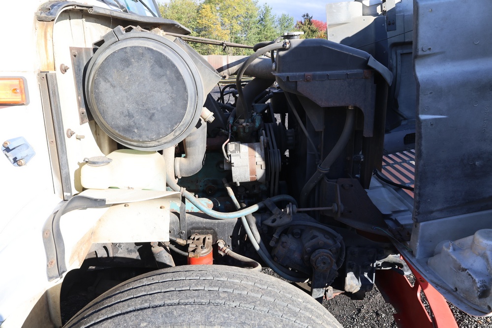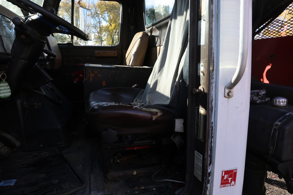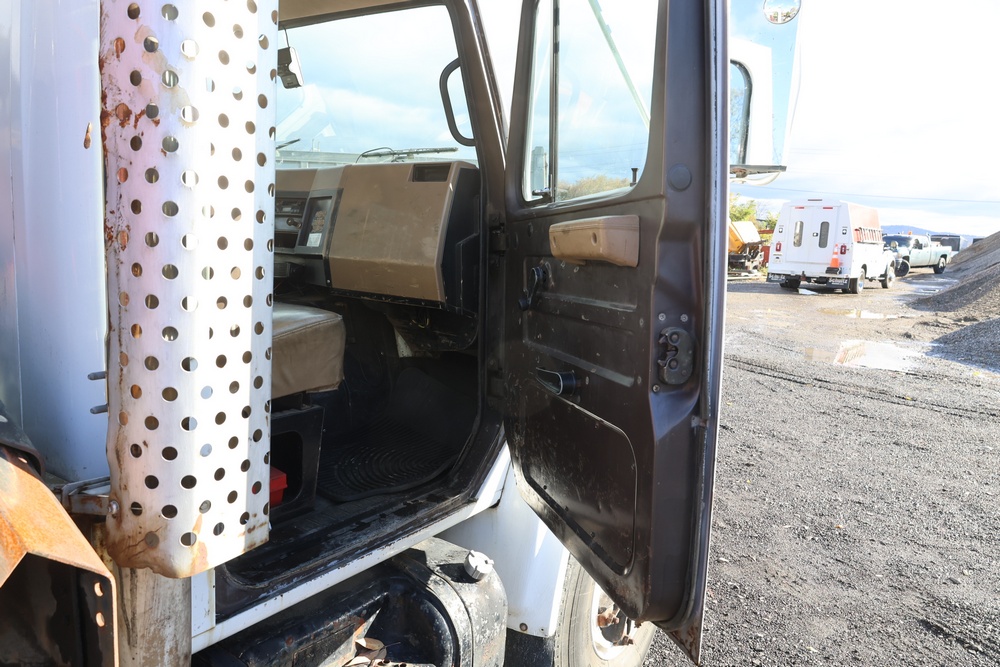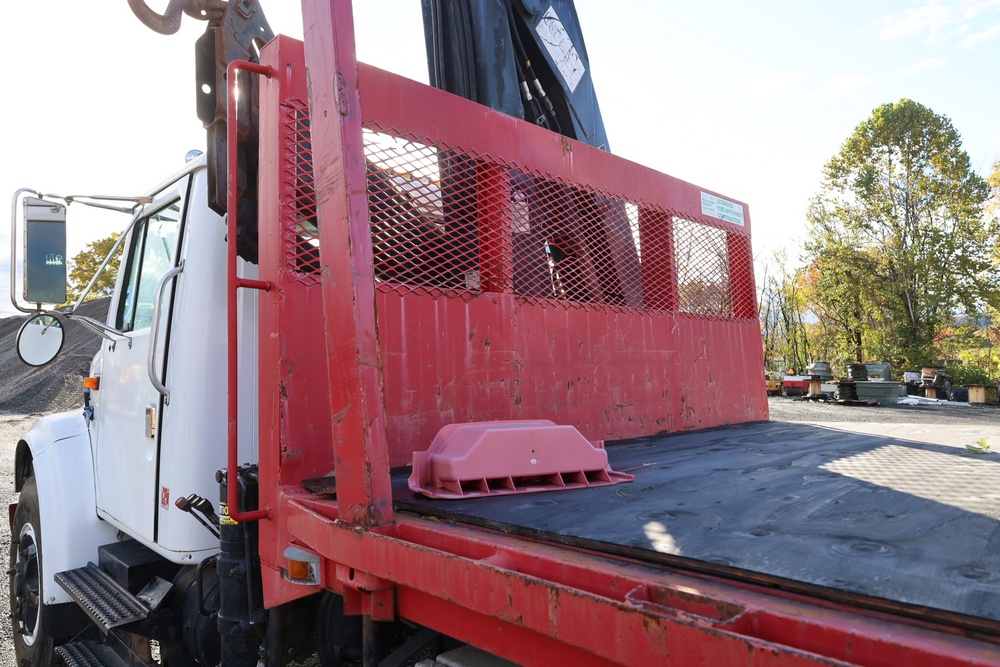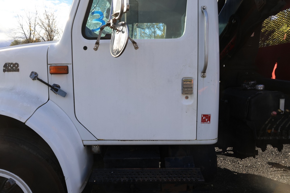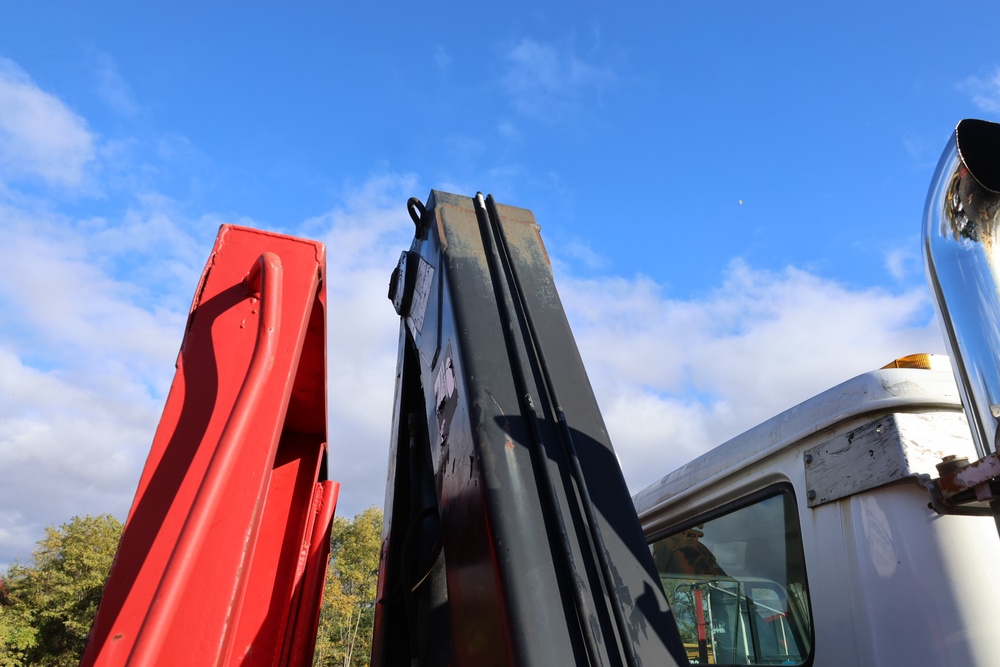 1990 International 4900 flatbed truck with hydraulic crane with a 7.6L L6 DIESEL engine. VIN: 1HTSHZ3R2LH683277. Odometer reading: 42,150 miles. Equipped with a diesel engine, automatic transmission, and dual rear wheels. Exterior: White cab with red front bumper and red flatbed. Interior features manual windows, climate control, AM/FM cassette radio, and power divider lock switch. Vehicle includes a flatbed, front crane mounting, side stake pockets, and hydraulic outriggers. Tire configuration: tandem rear axles with Continental HSC tires. Runs and drives. Title and key available.