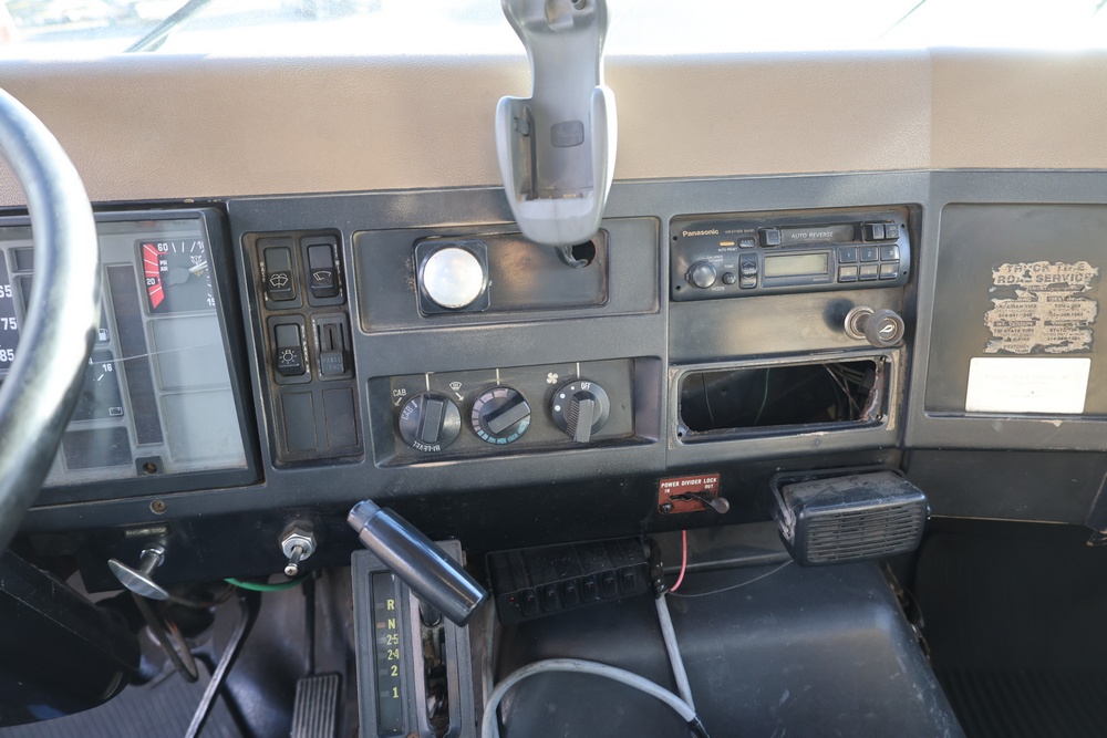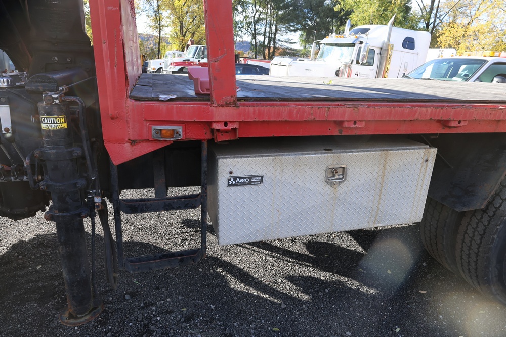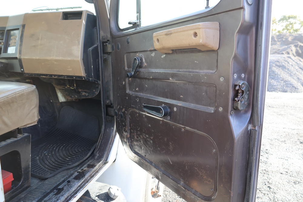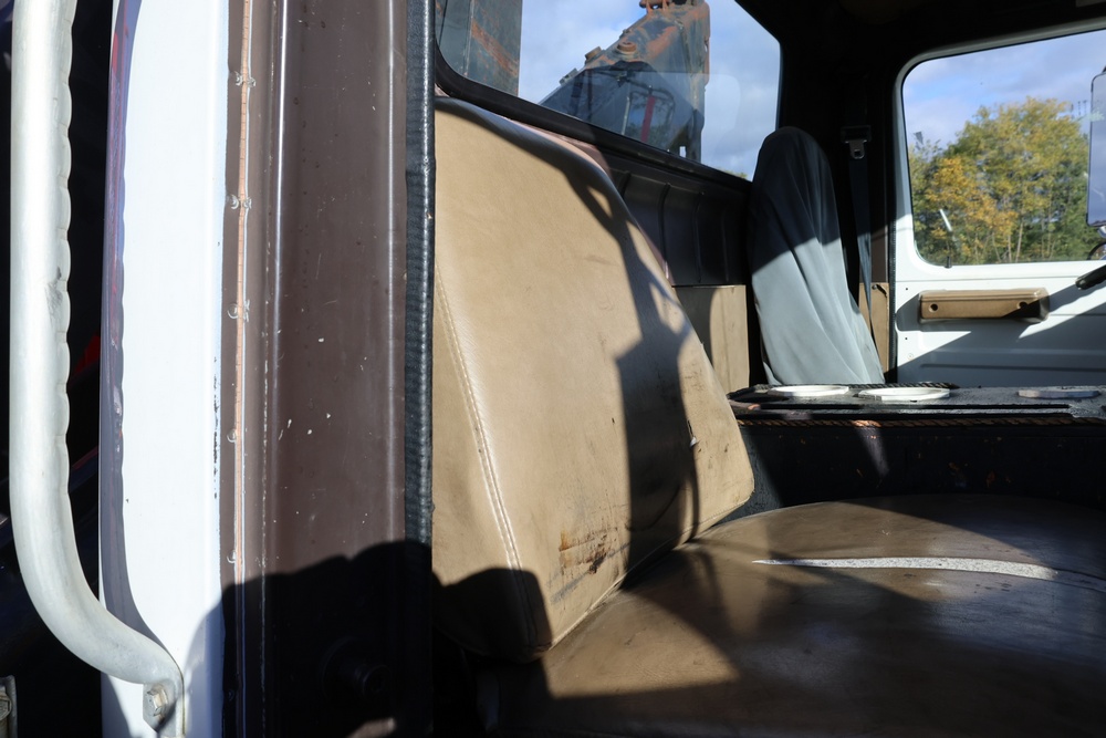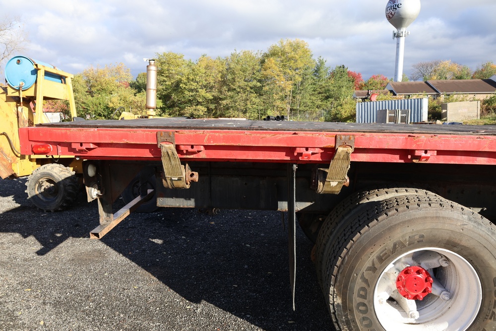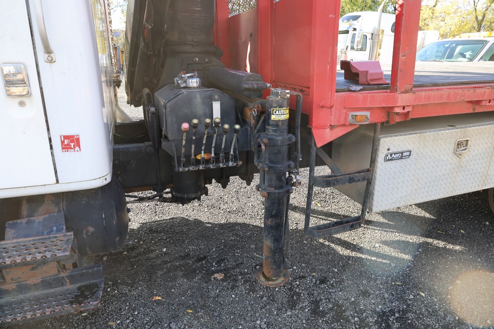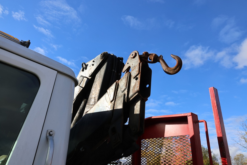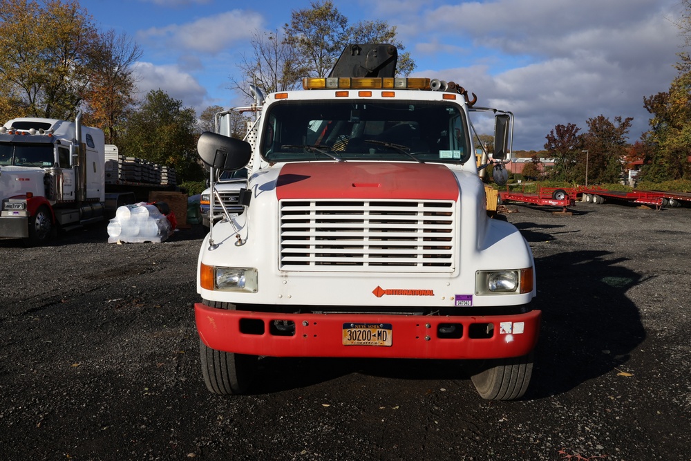 1990 International 4900 flatbed truck with hydraulic crane with a 7.6L L6 DIESEL engine. VIN: 1HTSHZ3R2LH683277. Odometer reading: 42,150 miles. Equipped with a diesel engine, automatic transmission, and dual rear wheels. Exterior: White cab with red front bumper and red flatbed. Interior features manual windows, climate control, AM/FM cassette radio, and power divider lock switch. Vehicle includes a flatbed, front crane mounting, side stake pockets, and hydraulic outriggers. Tire configuration: tandem rear axles with Continental HSC tires. Runs and drives. Title and key available.