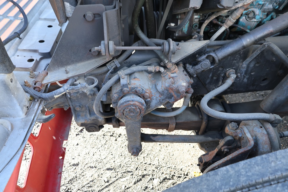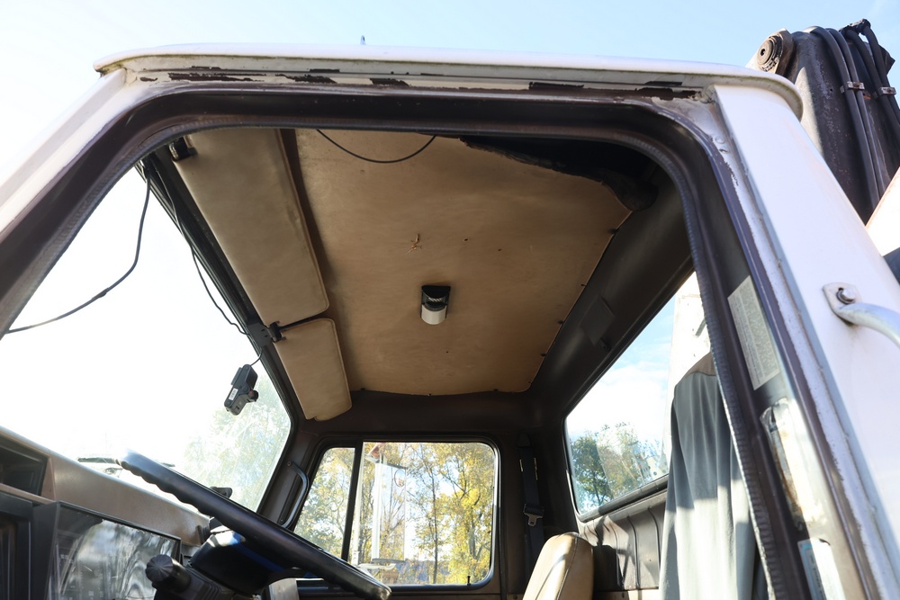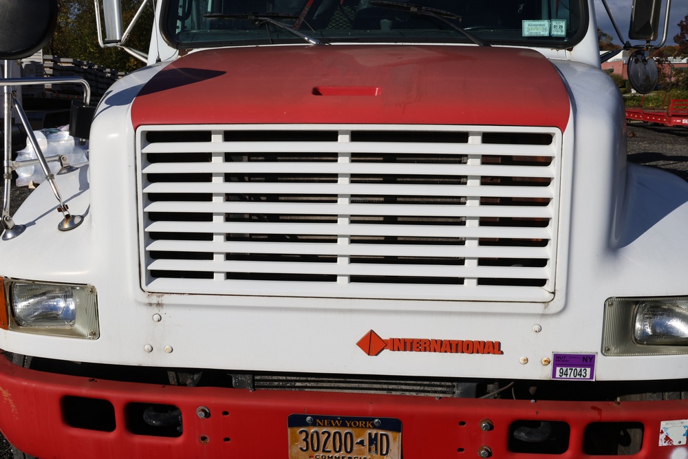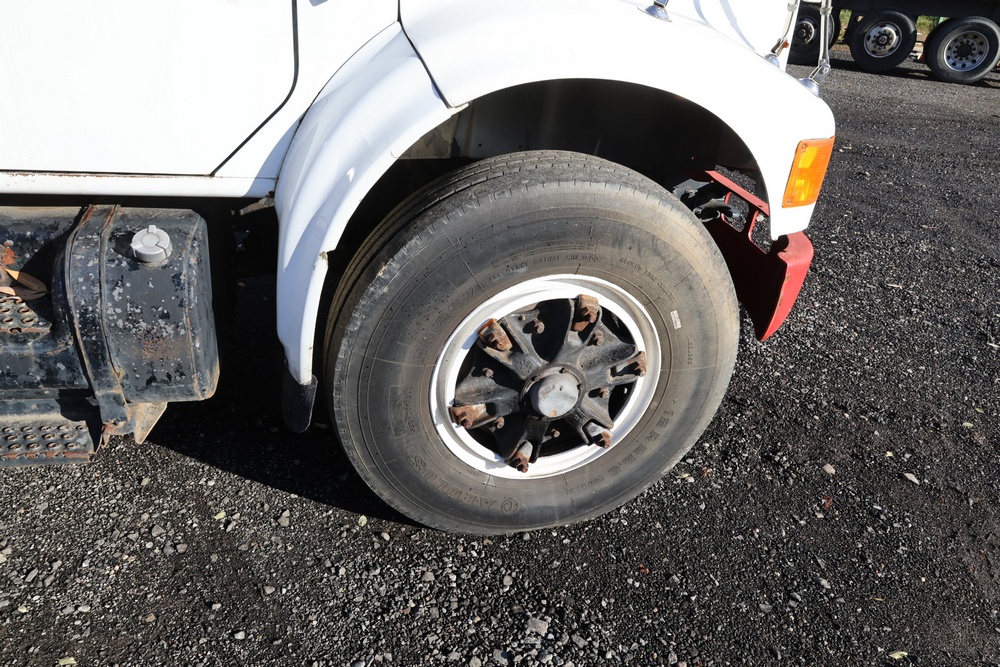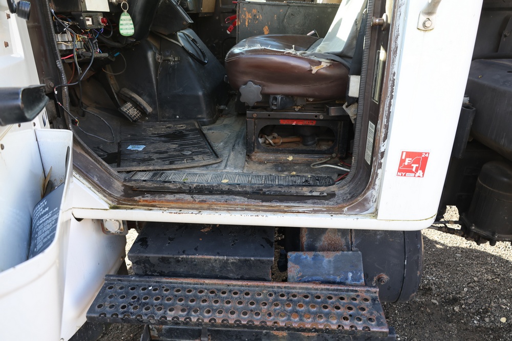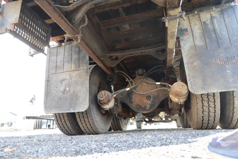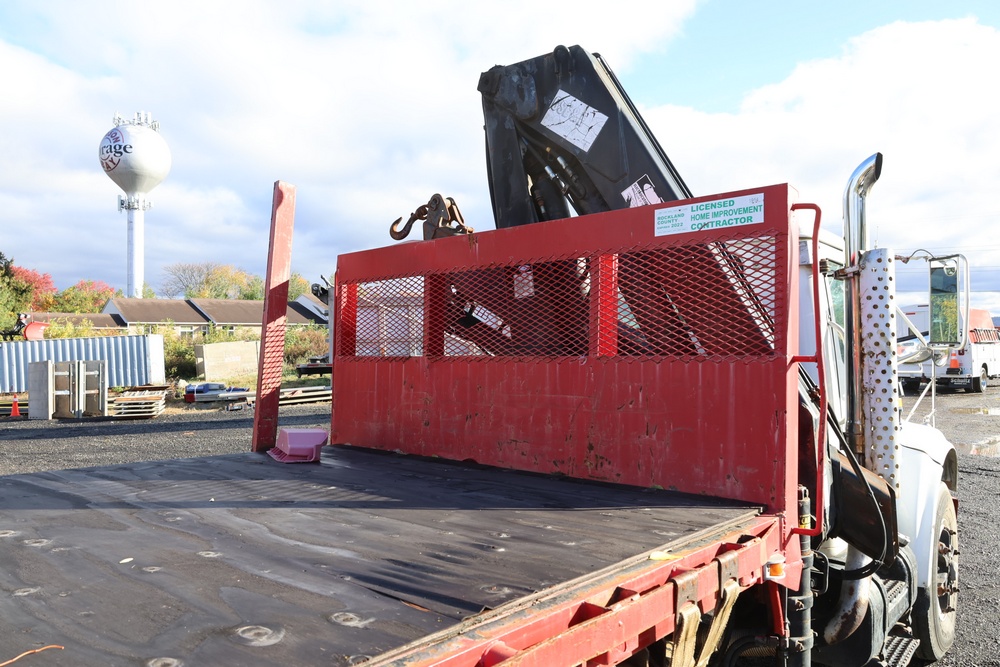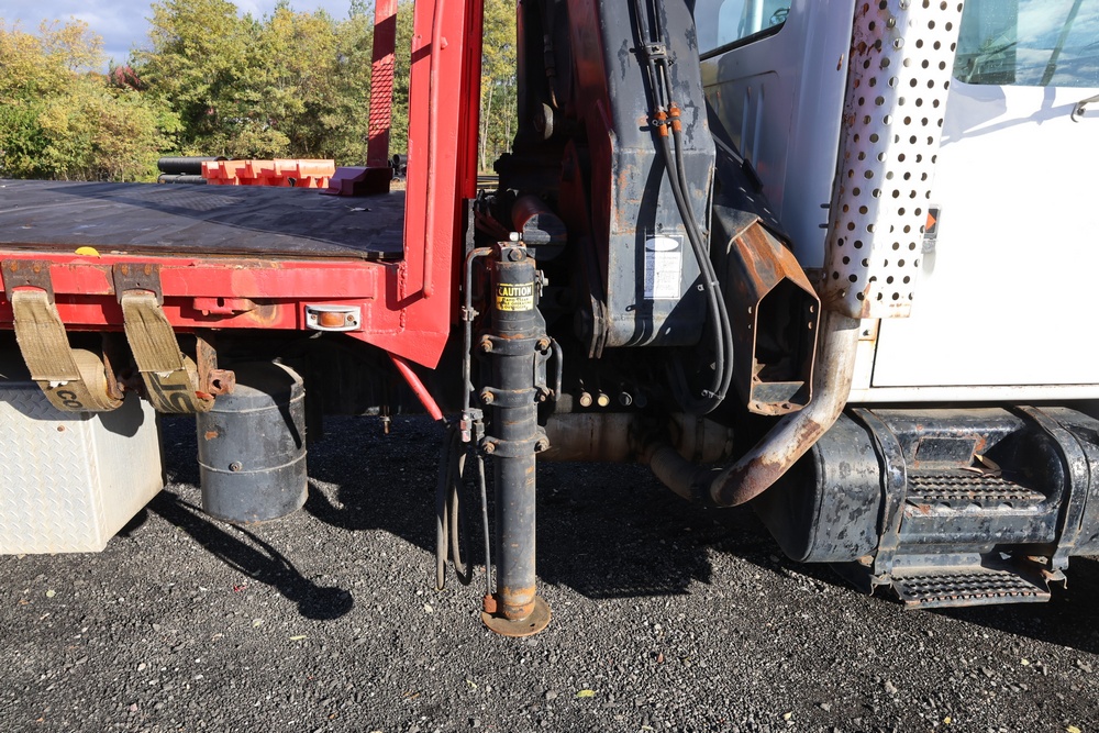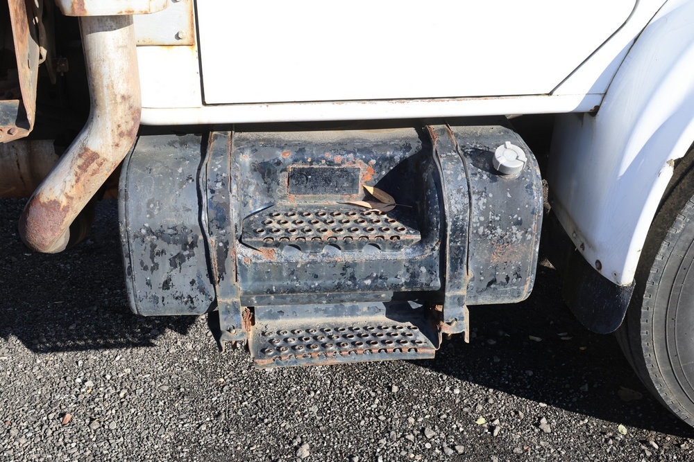 1990 International 4900 flatbed truck with hydraulic crane with a 7.6L L6 DIESEL engine. VIN: 1HTSHZ3R2LH683277. Odometer reading: 42,150 miles. Equipped with a diesel engine, automatic transmission, and dual rear wheels. Exterior: White cab with red front bumper and red flatbed. Interior features manual windows, climate control, AM/FM cassette radio, and power divider lock switch. Vehicle includes a flatbed, front crane mounting, side stake pockets, and hydraulic outriggers. Tire configuration: tandem rear axles with Continental HSC tires. Runs and drives. Title and key available.
