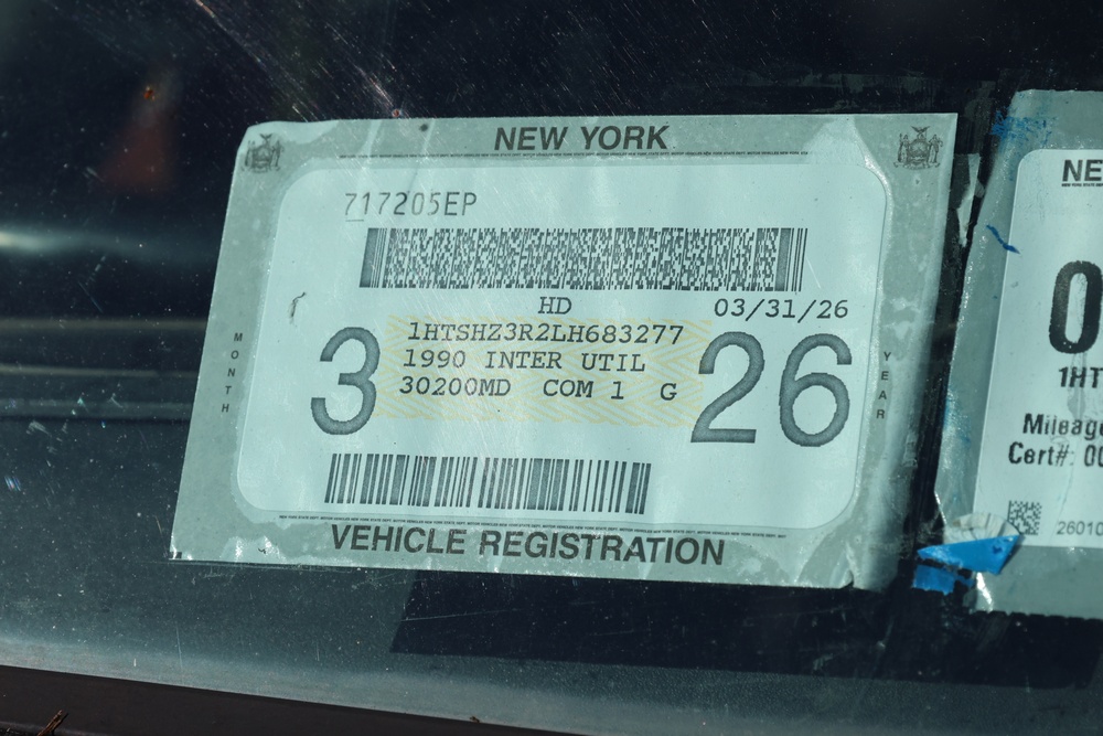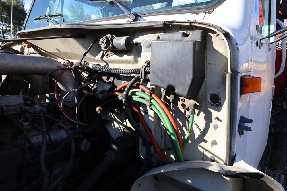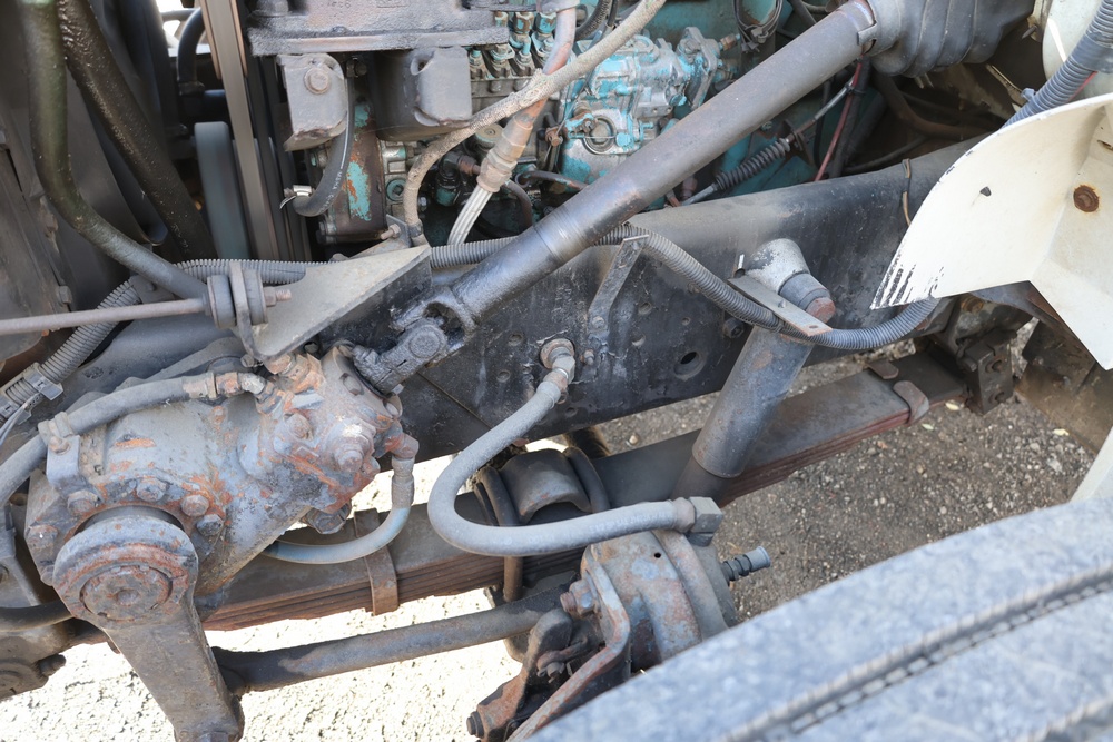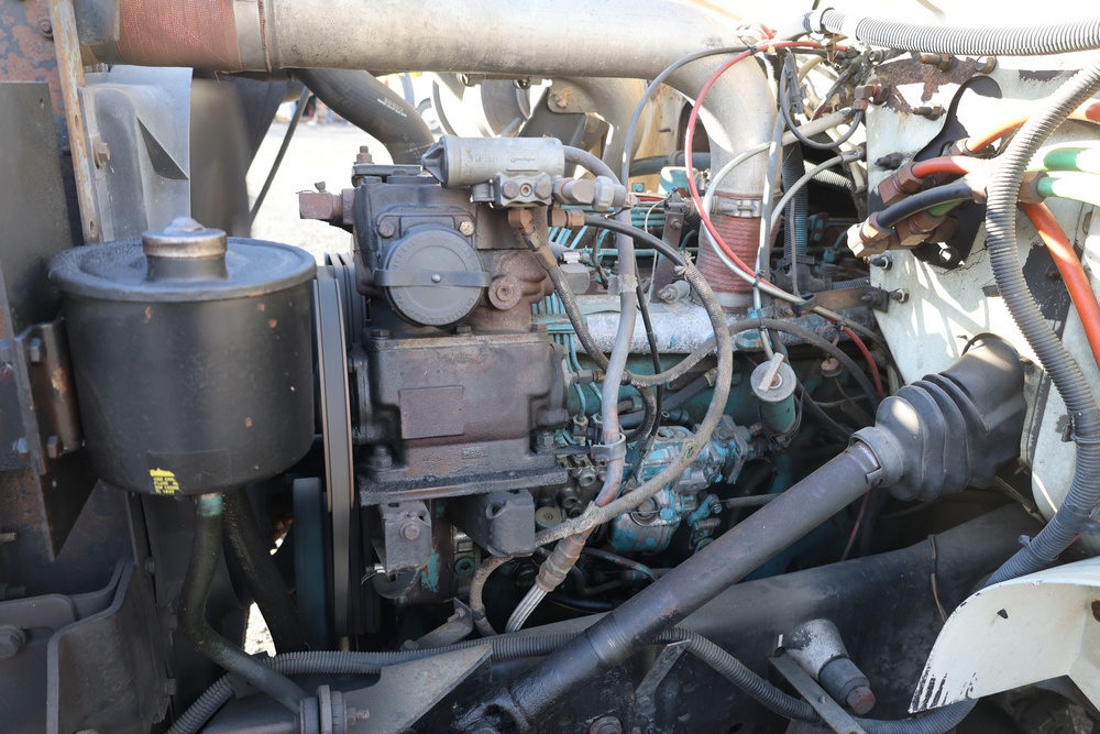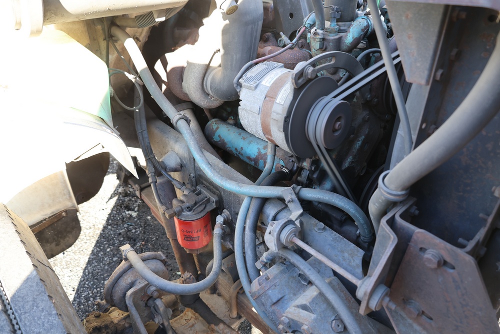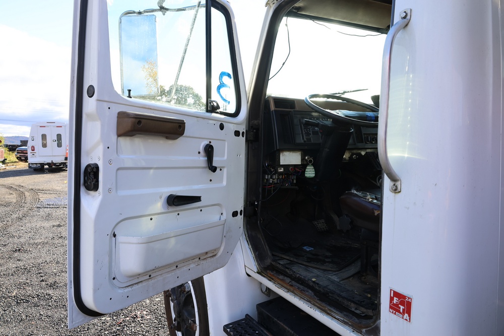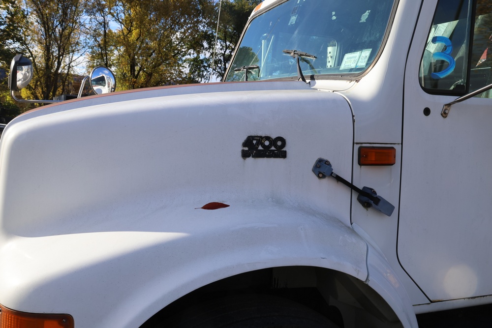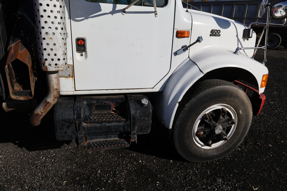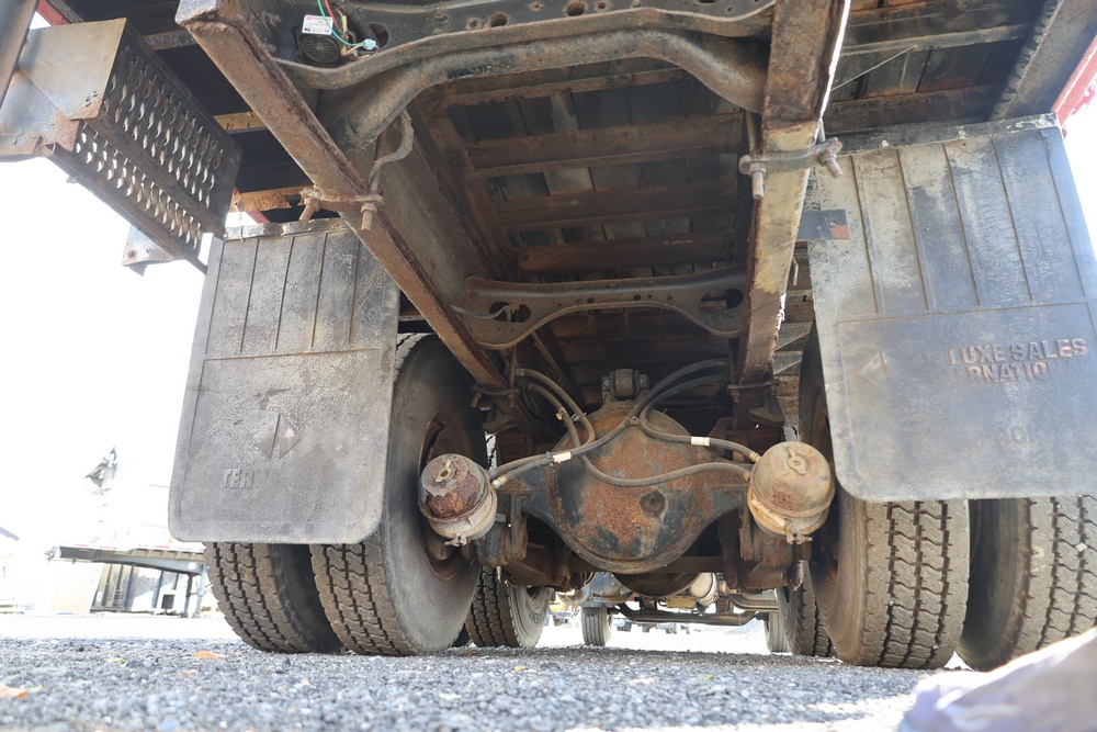 1990 International 4900 flatbed truck with hydraulic crane with a 7.6L L6 DIESEL engine. VIN: 1HTSHZ3R2LH683277. Odometer reading: 42,150 miles. Equipped with a diesel engine, automatic transmission, and dual rear wheels. Exterior: White cab with red front bumper and red flatbed. Interior features manual windows, climate control, AM/FM cassette radio, and power divider lock switch. Vehicle includes a flatbed, front crane mounting, side stake pockets, and hydraulic outriggers. Tire configuration: tandem rear axles with Continental HSC tires. Runs and drives. Title and key available.