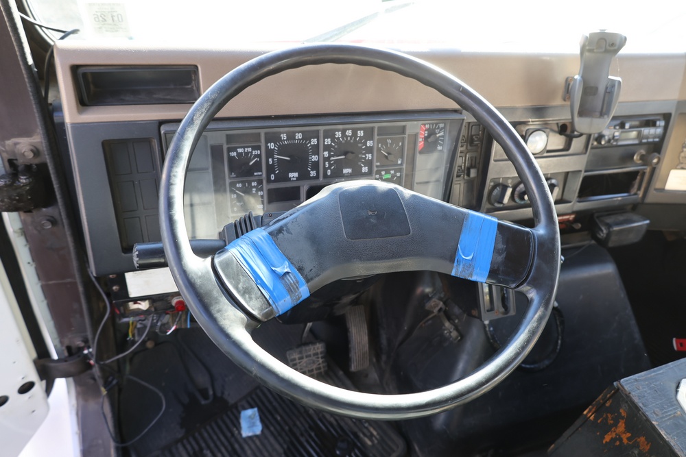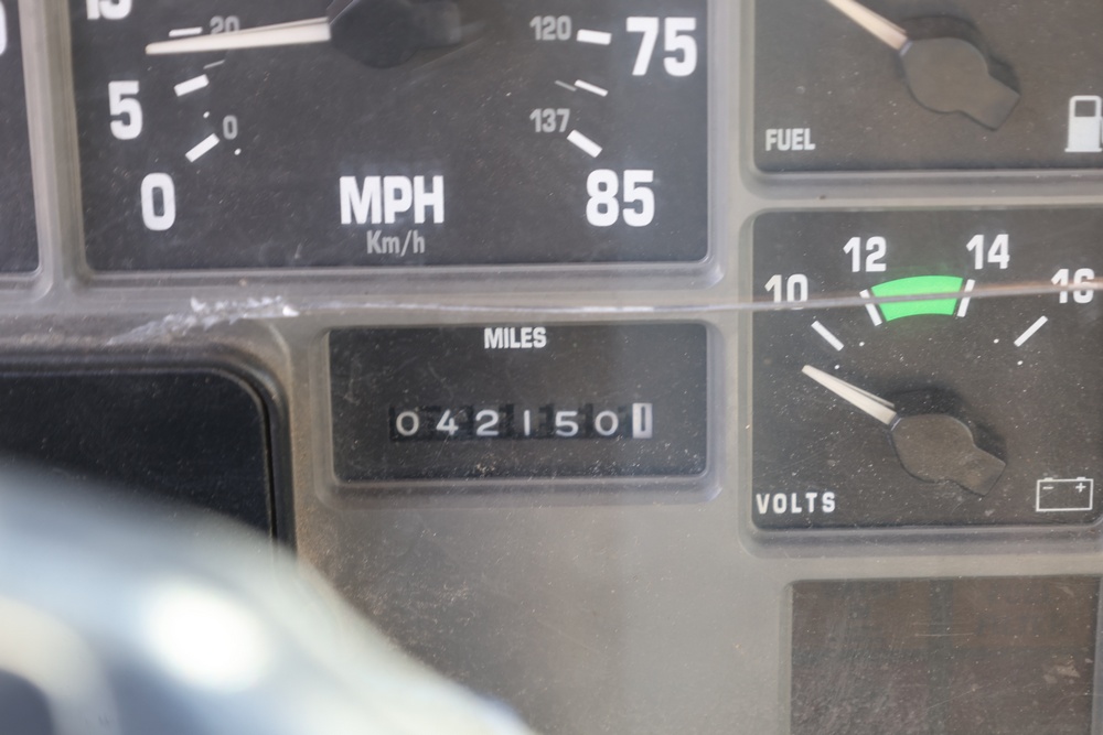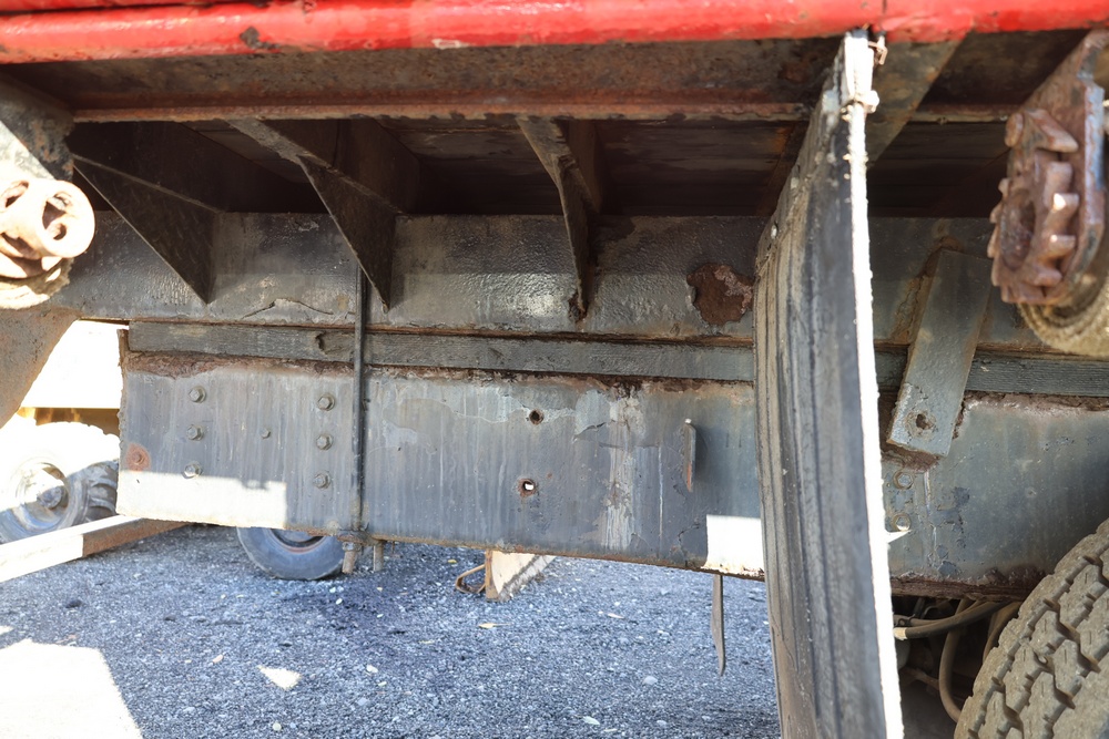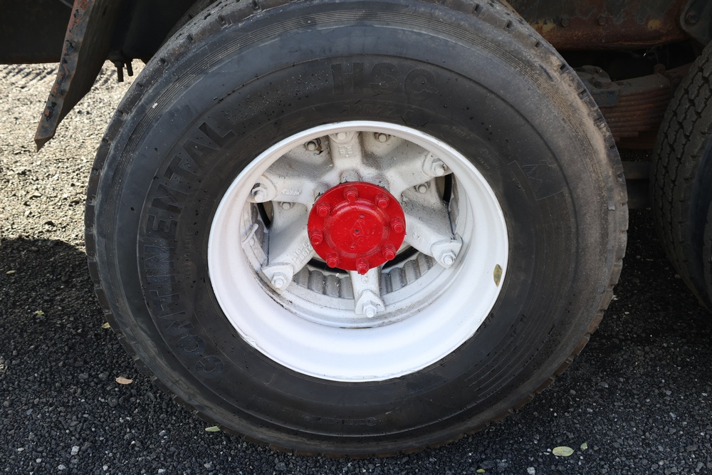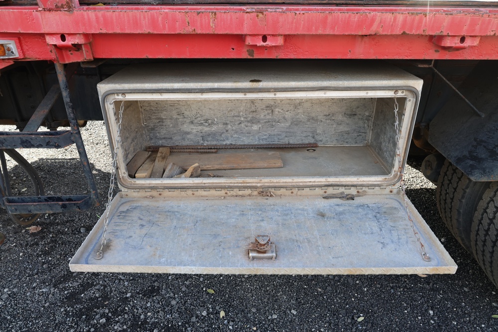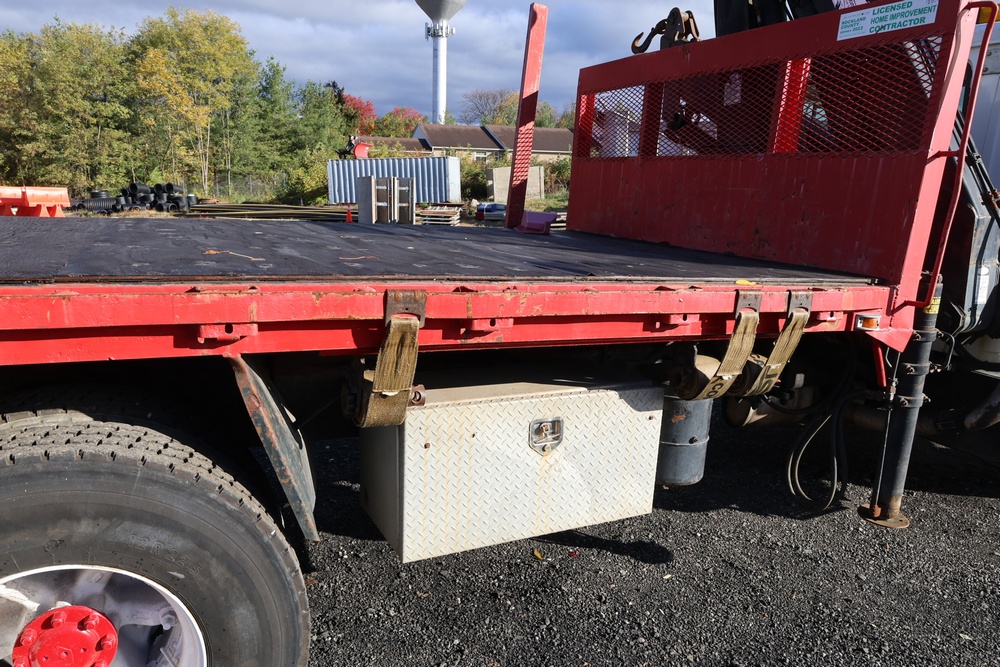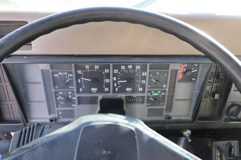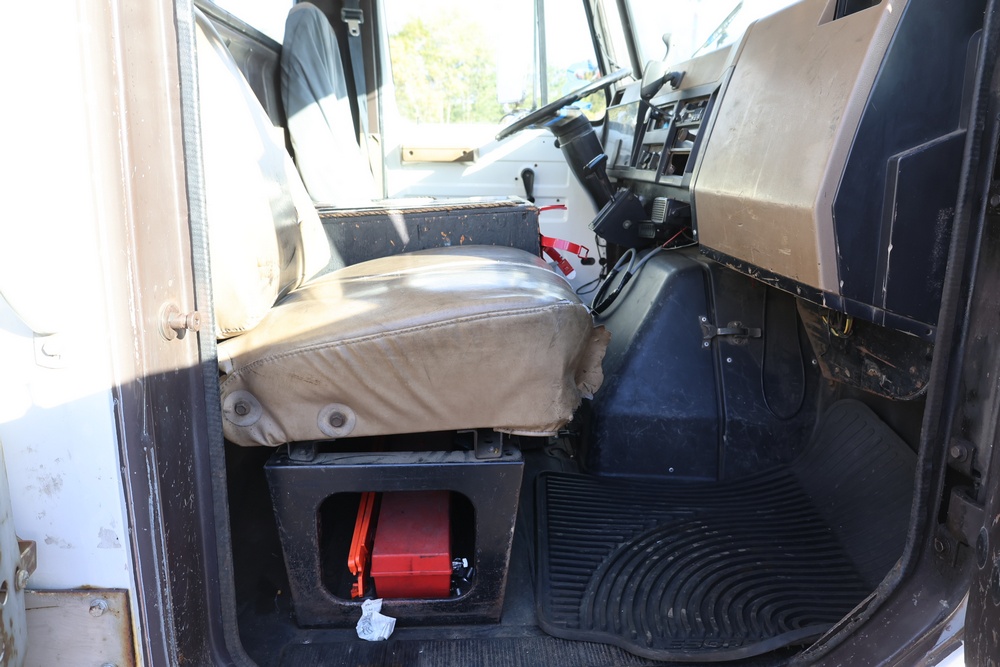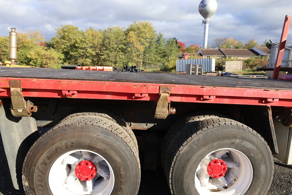 1990 International 4900 flatbed truck with hydraulic crane with a 7.6L L6 DIESEL engine. VIN: 1HTSHZ3R2LH683277. Odometer reading: 42,150 miles. Equipped with a diesel engine, automatic transmission, and dual rear wheels. Exterior: White cab with red front bumper and red flatbed. Interior features manual windows, climate control, AM/FM cassette radio, and power divider lock switch. Vehicle includes a flatbed, front crane mounting, side stake pockets, and hydraulic outriggers. Tire configuration: tandem rear axles with Continental HSC tires. Runs and drives. Title and key available.