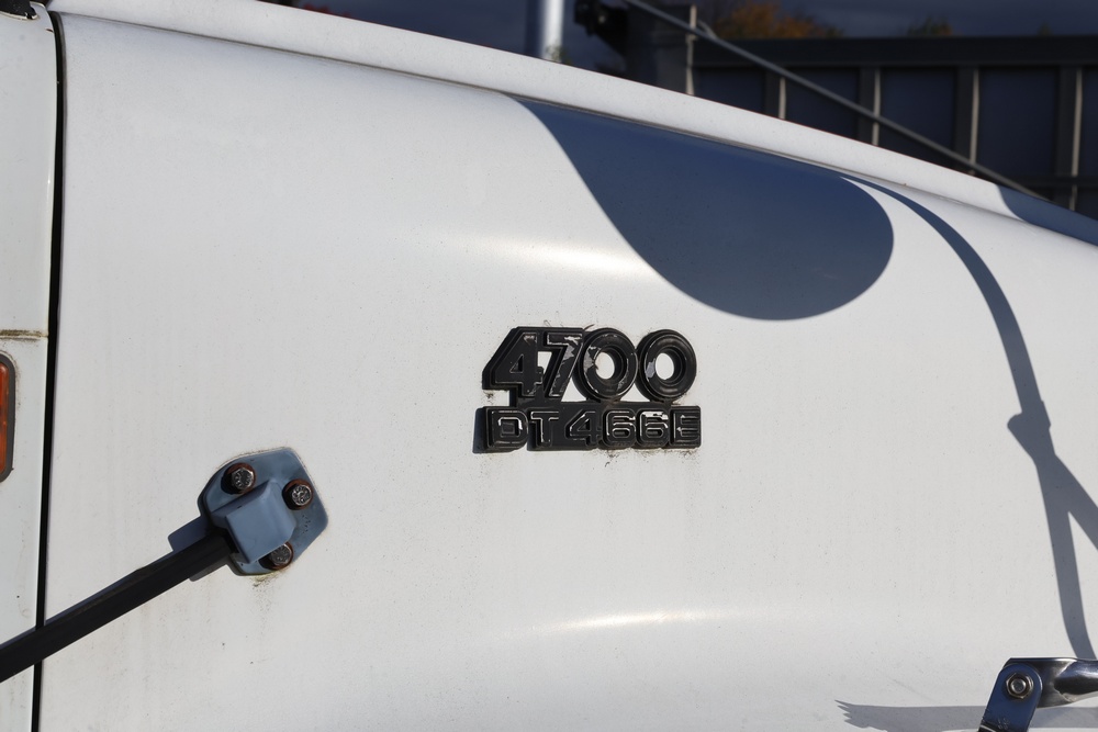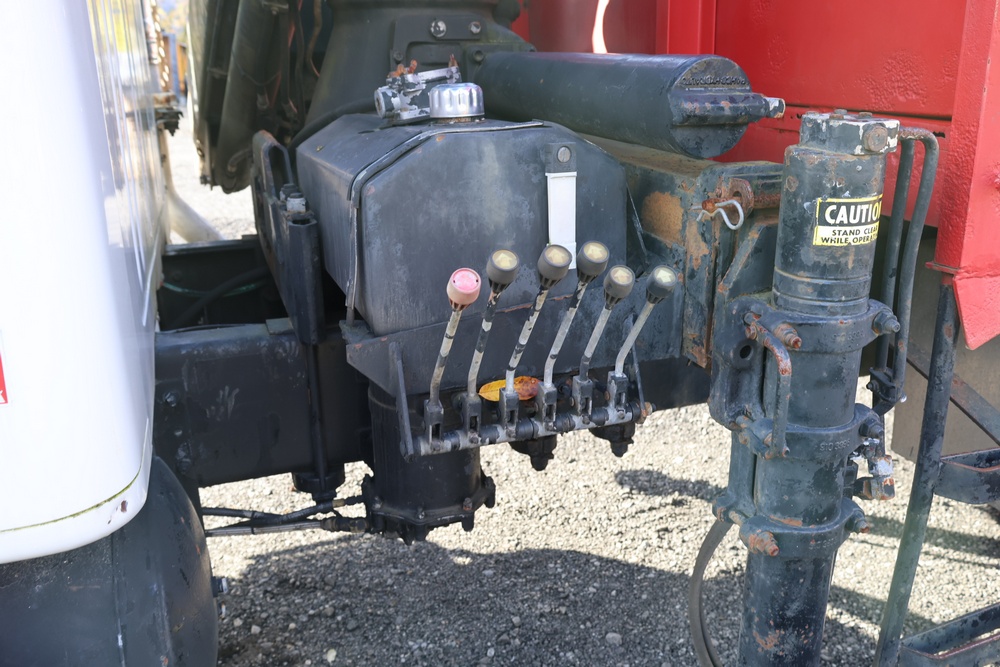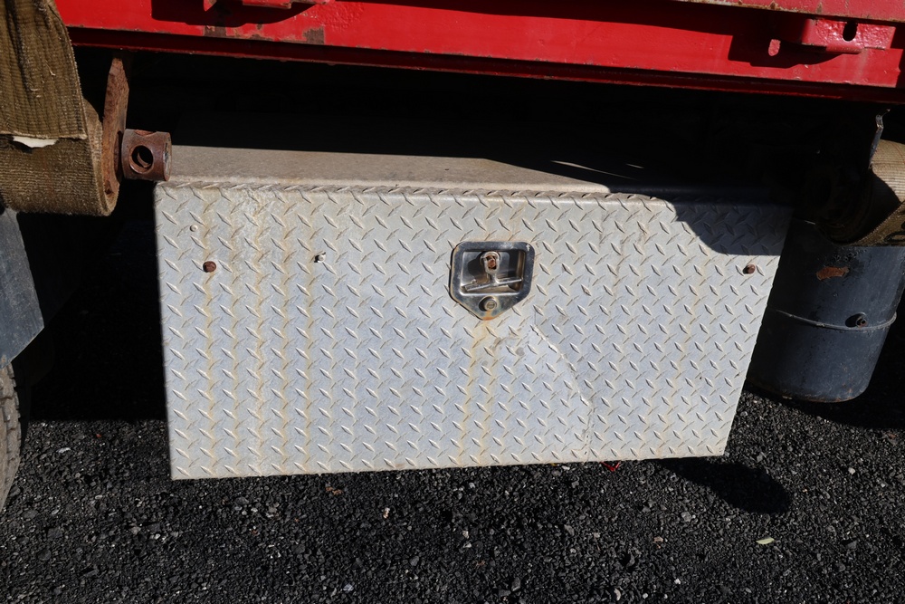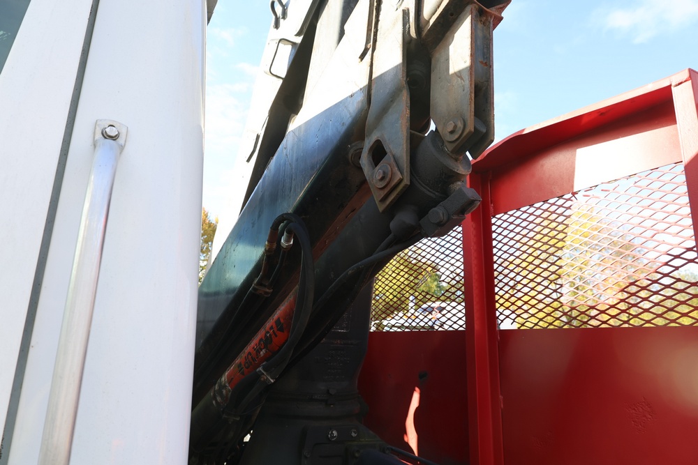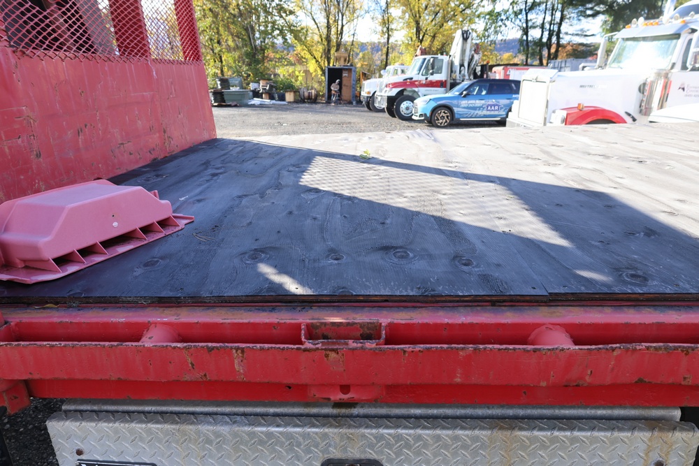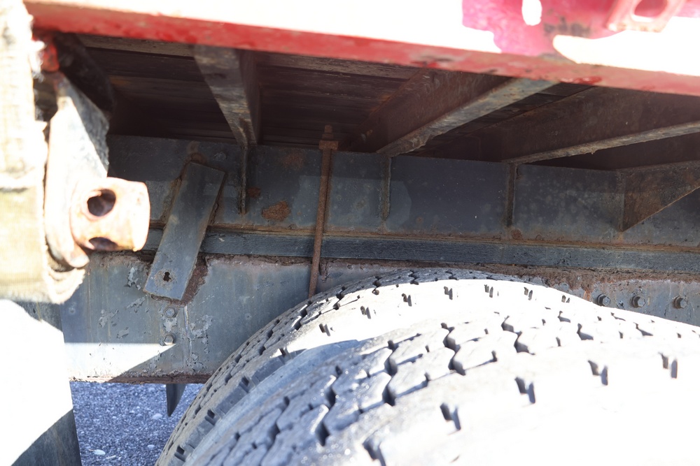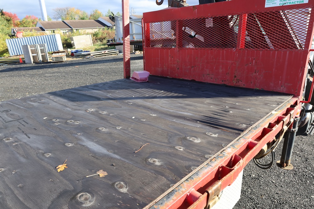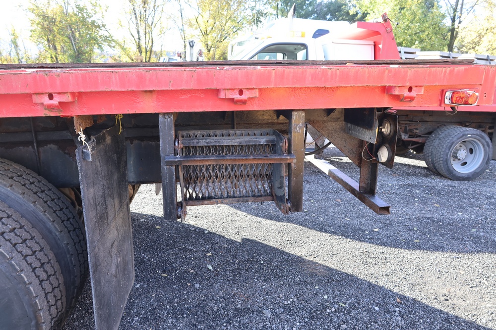 1990 International 4900 flatbed truck with hydraulic crane with a 7.6L L6 DIESEL engine. VIN: 1HTSHZ3R2LH683277. Odometer reading: 42,150 miles. Equipped with a diesel engine, automatic transmission, and dual rear wheels. Exterior: White cab with red front bumper and red flatbed. Interior features manual windows, climate control, AM/FM cassette radio, and power divider lock switch. Vehicle includes a flatbed, front crane mounting, side stake pockets, and hydraulic outriggers. Tire configuration: tandem rear axles with Continental HSC tires. Runs and drives. Title and key available.