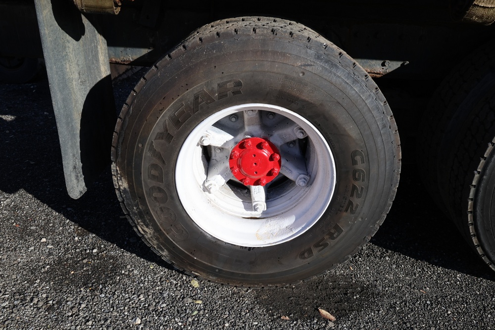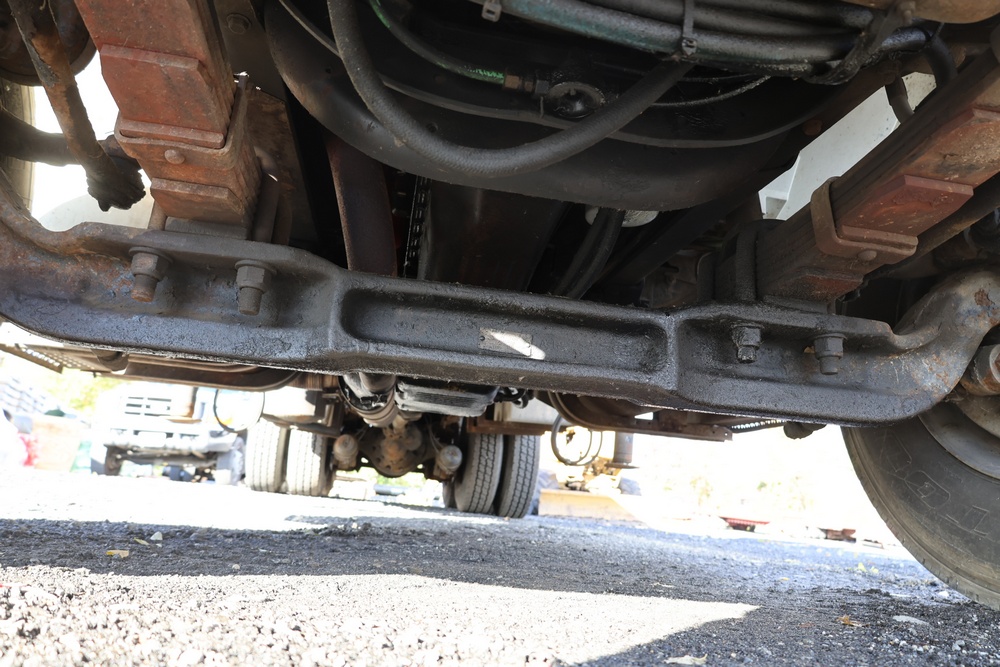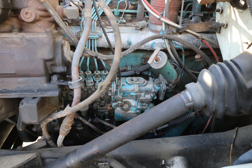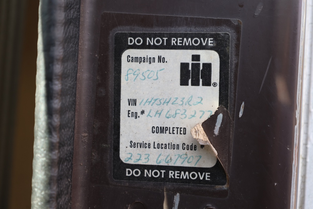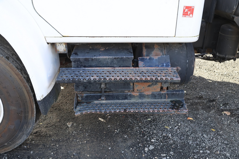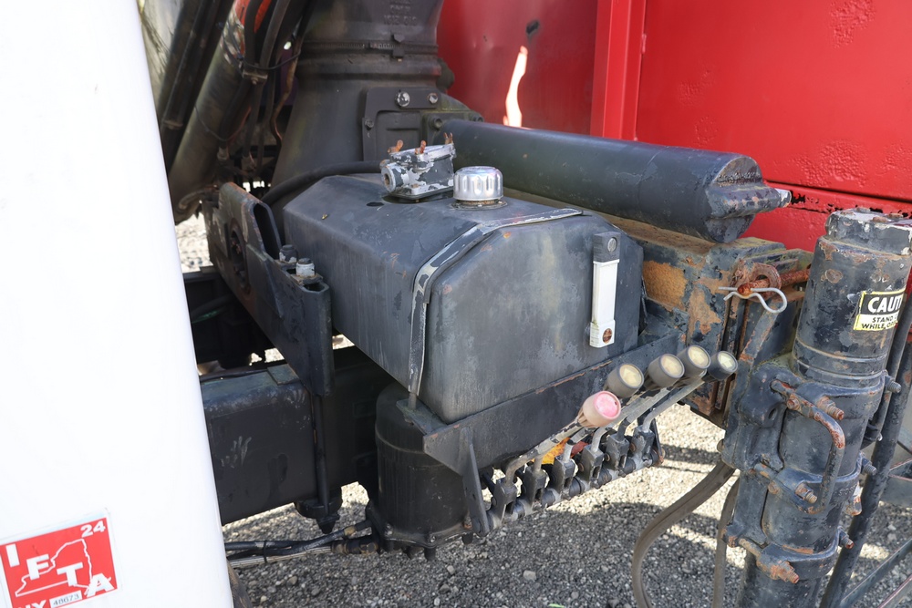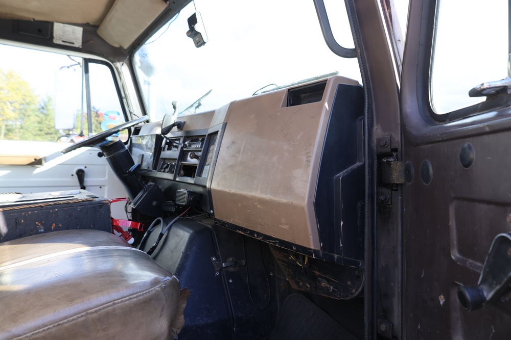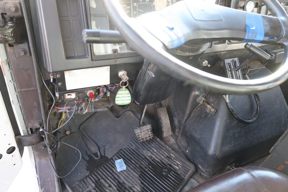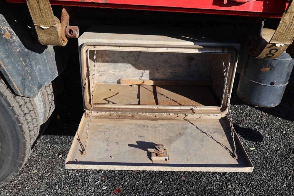 1990 International 4900 flatbed truck with hydraulic crane with a 7.6L L6 DIESEL engine. VIN: 1HTSHZ3R2LH683277. Odometer reading: 42,150 miles. Equipped with a diesel engine, automatic transmission, and dual rear wheels. Exterior: White cab with red front bumper and red flatbed. Interior features manual windows, climate control, AM/FM cassette radio, and power divider lock switch. Vehicle includes a flatbed, front crane mounting, side stake pockets, and hydraulic outriggers. Tire configuration: tandem rear axles with Continental HSC tires. Runs and drives. Title and key available.