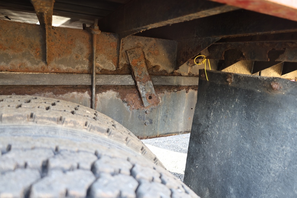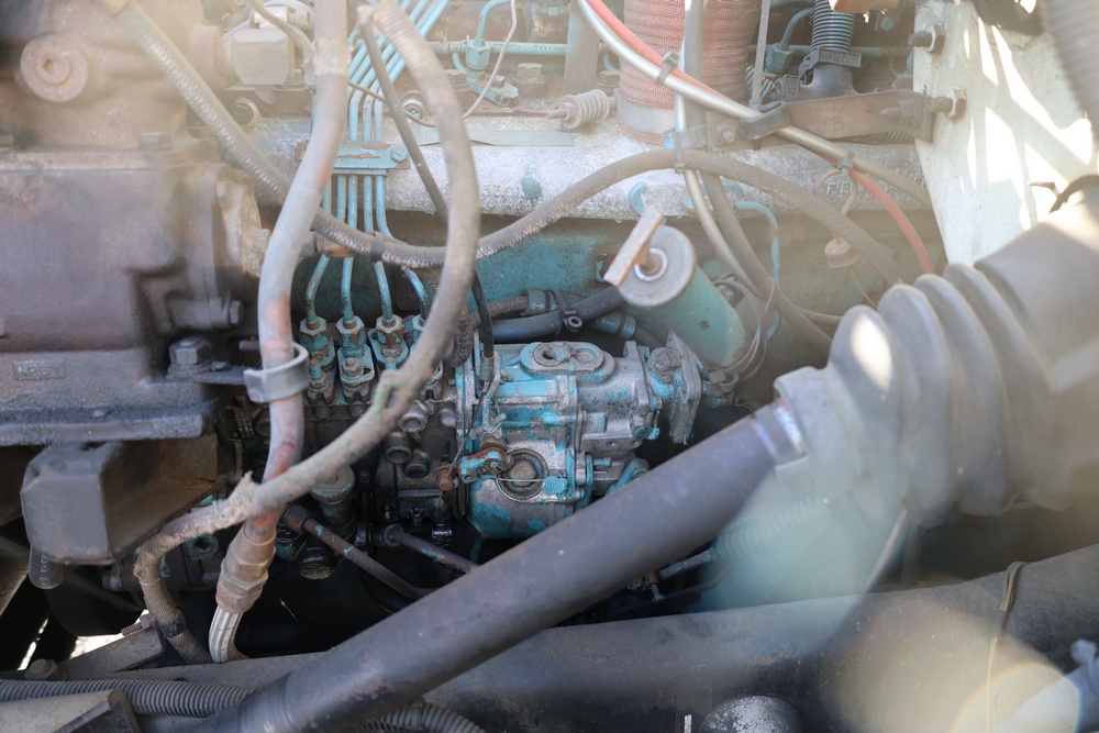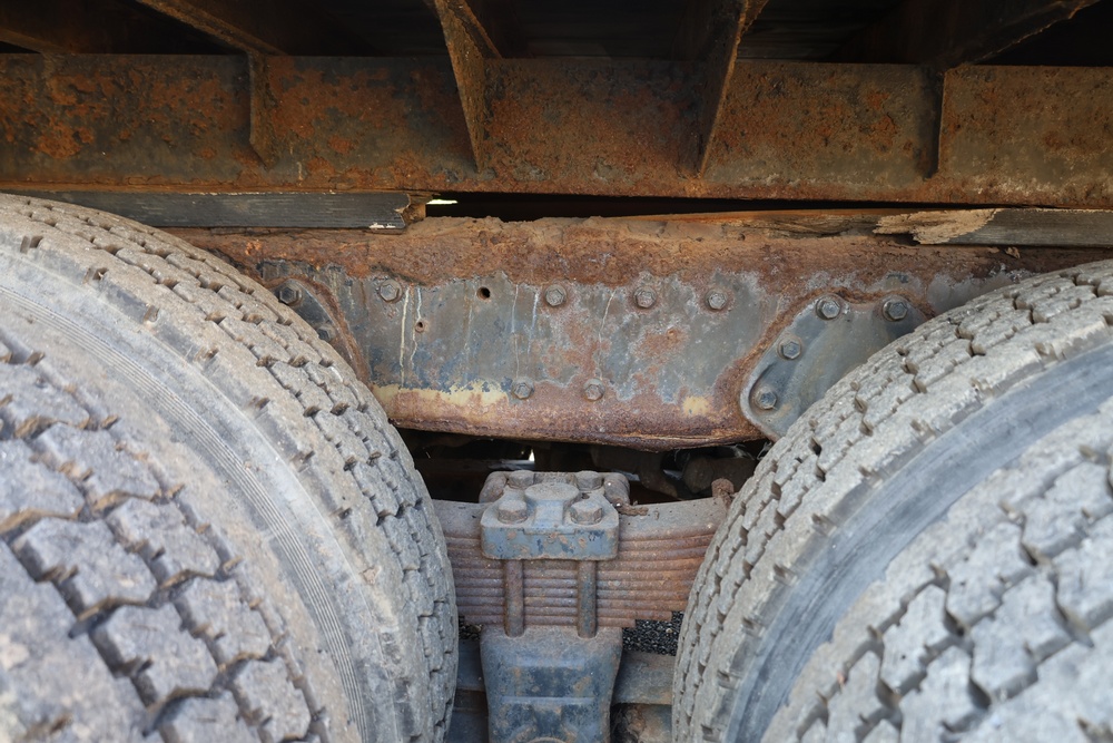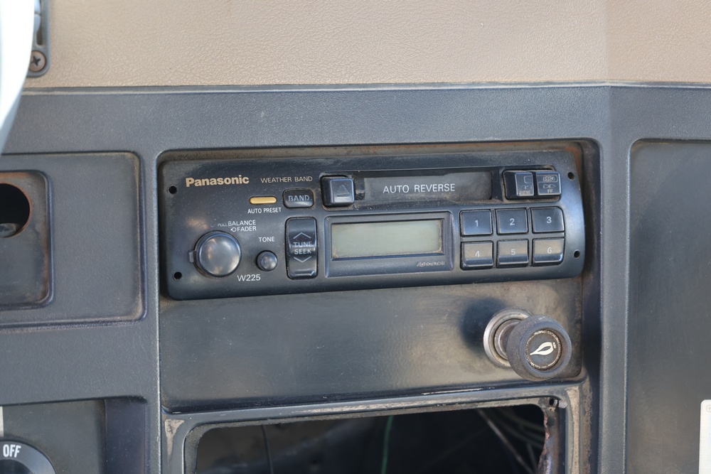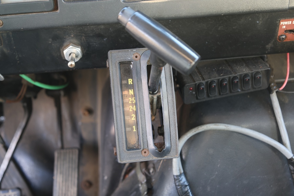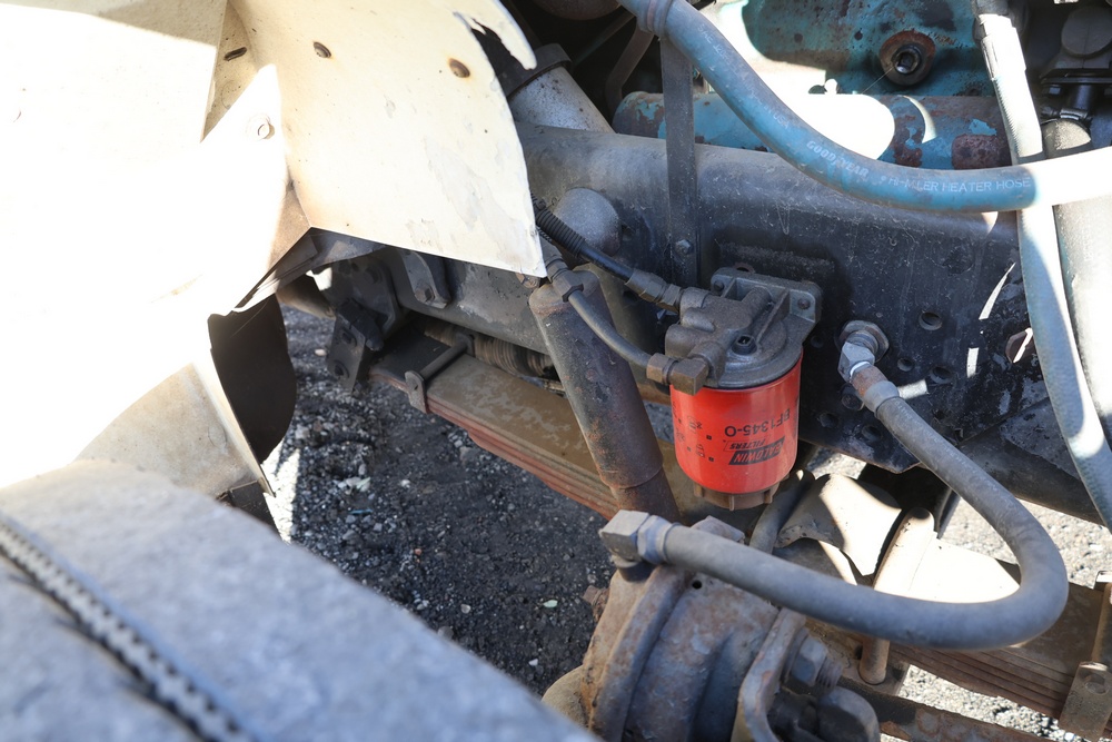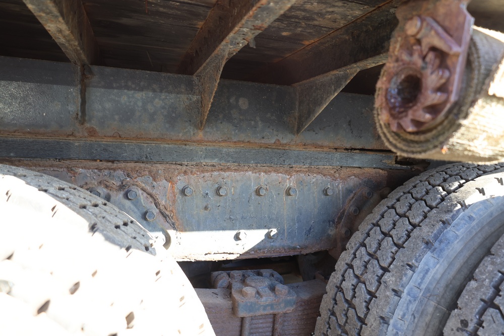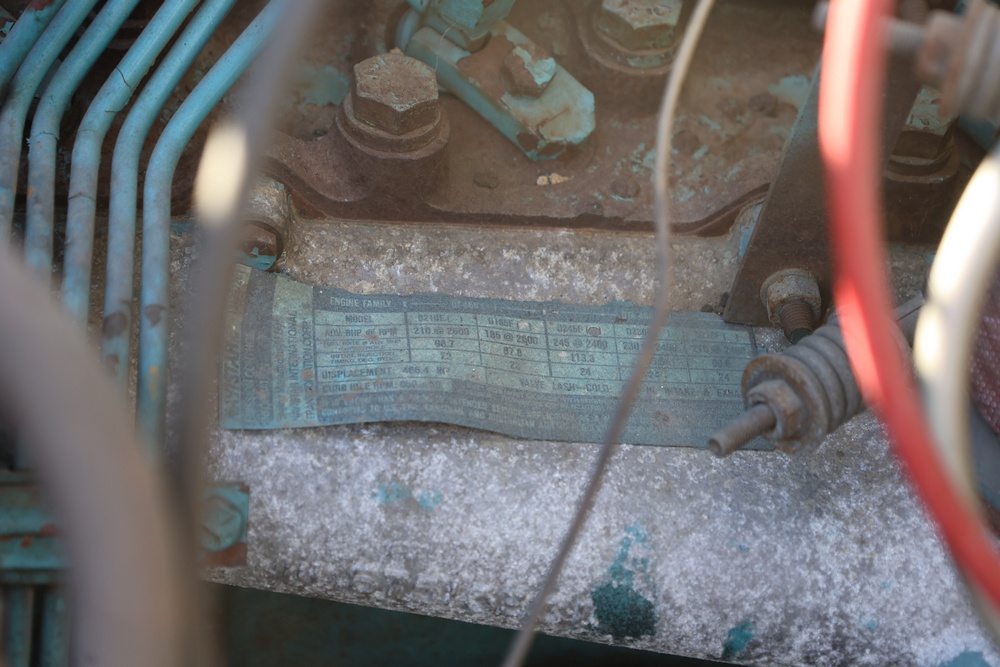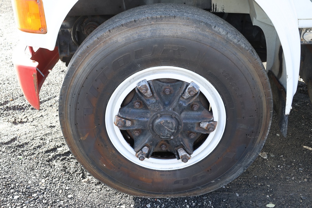 1990 International 4900 flatbed truck with hydraulic crane with a 7.6L L6 DIESEL engine. VIN: 1HTSHZ3R2LH683277. Odometer reading: 42,150 miles. Equipped with a diesel engine, automatic transmission, and dual rear wheels. Exterior: White cab with red front bumper and red flatbed. Interior features manual windows, climate control, AM/FM cassette radio, and power divider lock switch. Vehicle includes a flatbed, front crane mounting, side stake pockets, and hydraulic outriggers. Tire configuration: tandem rear axles with Continental HSC tires. Runs and drives. Title and key available.