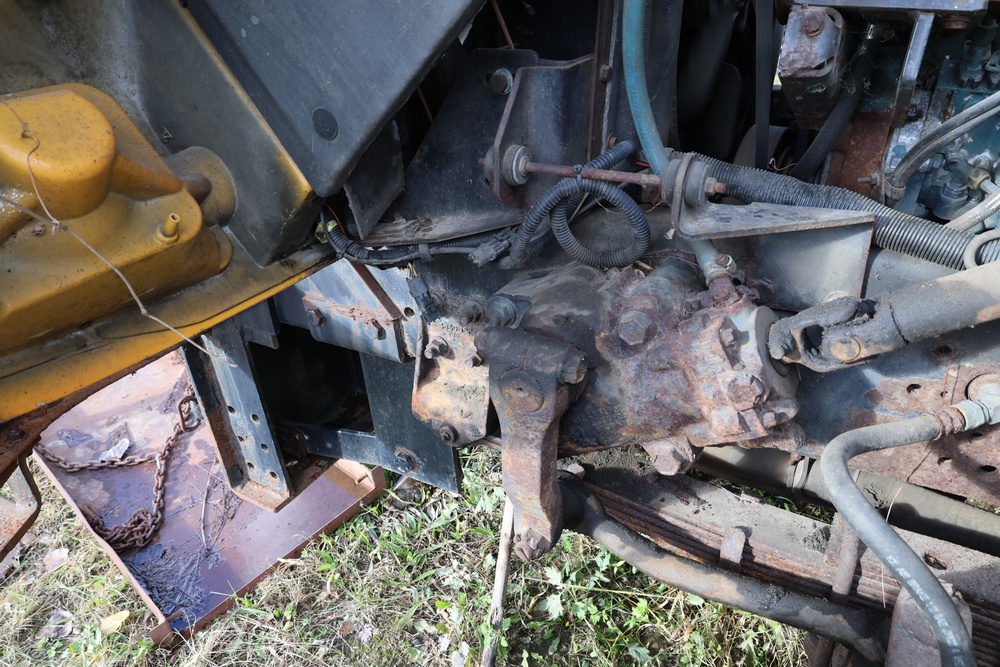 1989 International 4800 4x4 dump truck with automatic transmission. VIN: 1HTSEDBRXLH235186. Odometer reading: 36,295. Exterior: Yellow cab and dump body with dual rear wheels, front plow mount, rear liquid tank, and amber roof light bar. Interior: Brown driver's seat, Panasonic radio, auxiliary switchgear. Tire configuration: Dual rear wheels. Additional equipment includes dump bed, front plow mount. Cab rotted through, suitable for parts. Runs, must be towed. Bill of Sale Only and key available.
