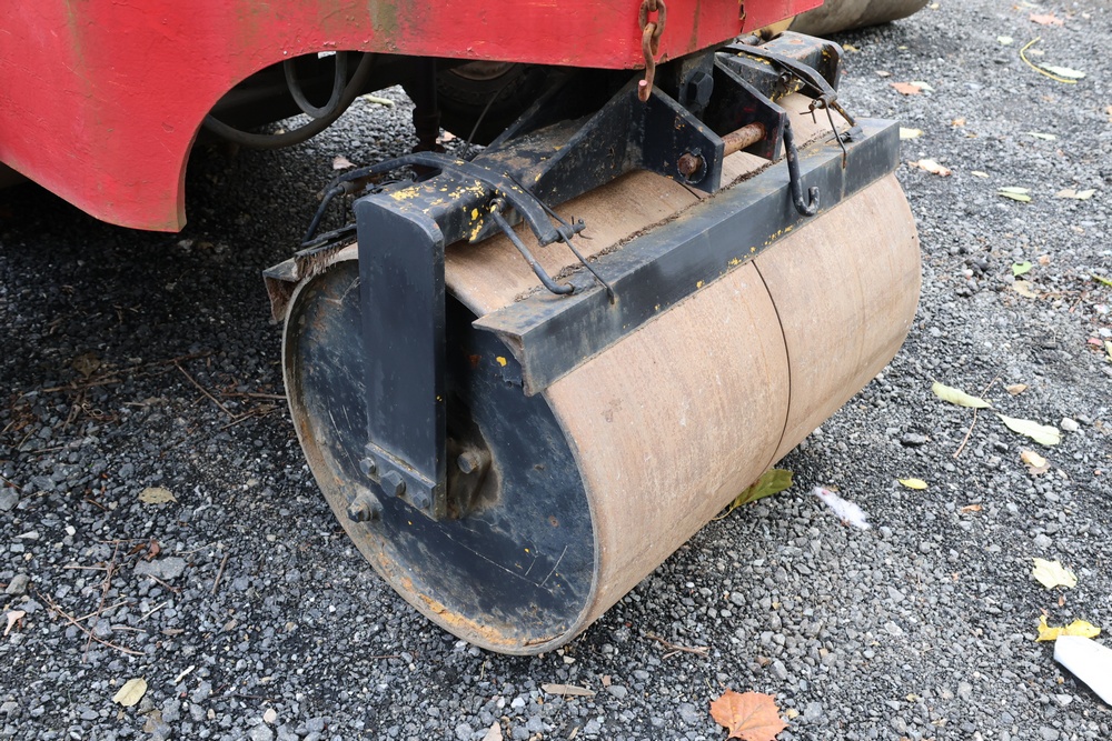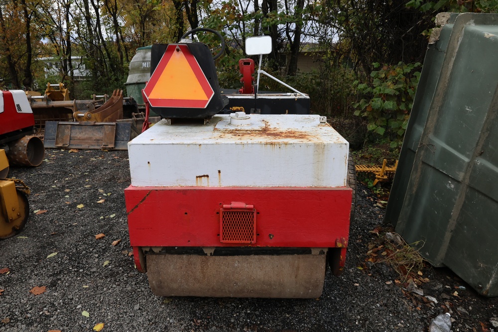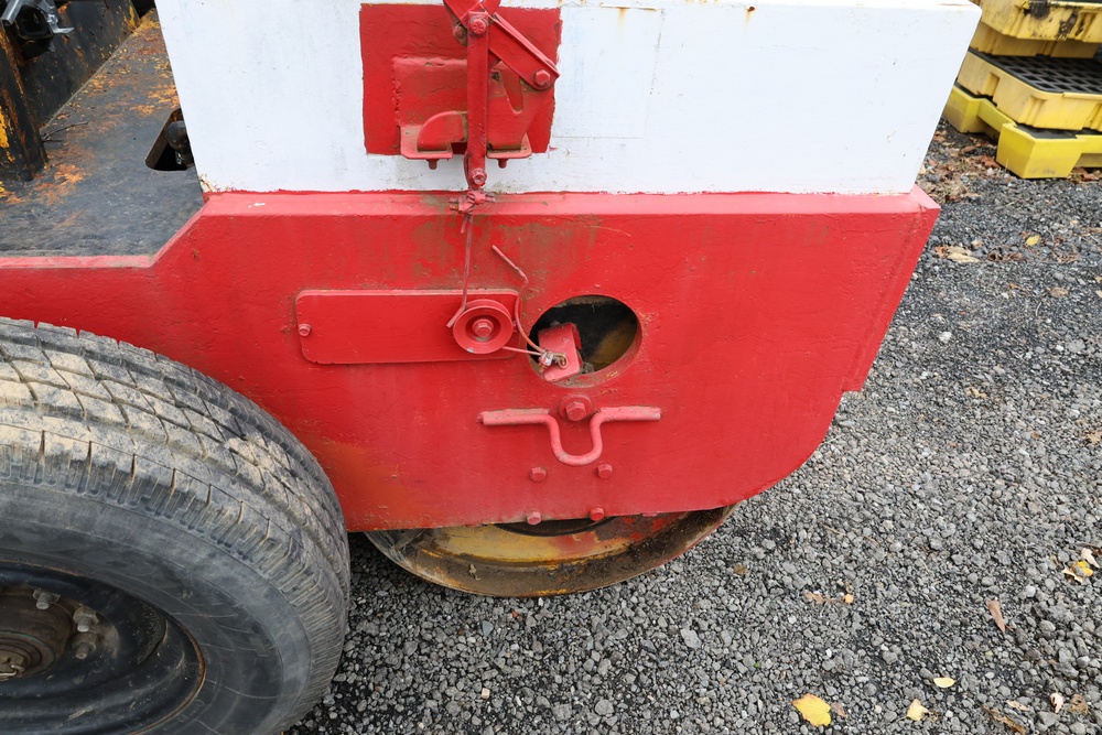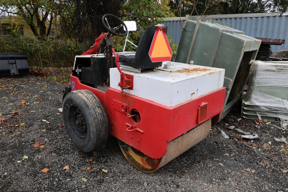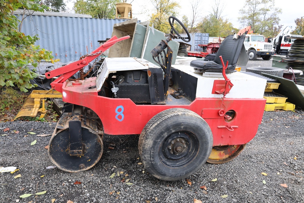 General Engines Co. Roller tow behind Ride-On Steel Drum Roller with Hydraulic Drive, Front and Rear Drums, and Rear Pneumatic Transport Tires. Powered by Predator 670cc Gasoline Engine. Equipped with Hydraulic Control Levers, Adjustable Seat, and Steering Wheel. Manufactured by General Engines Co., Thorofare, New Jersey. Runs and operates as intended.
