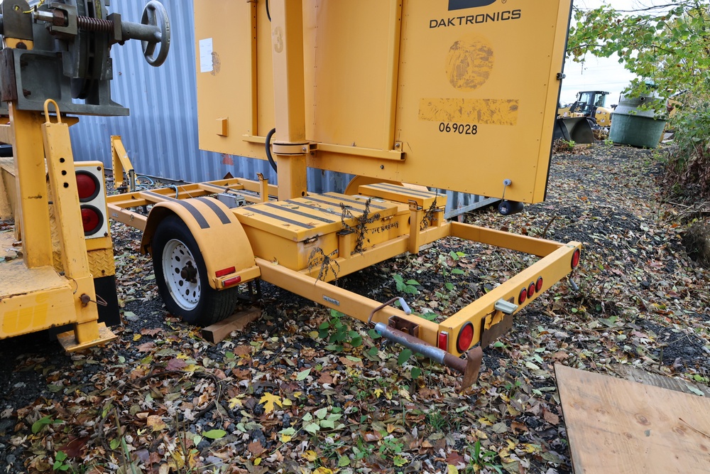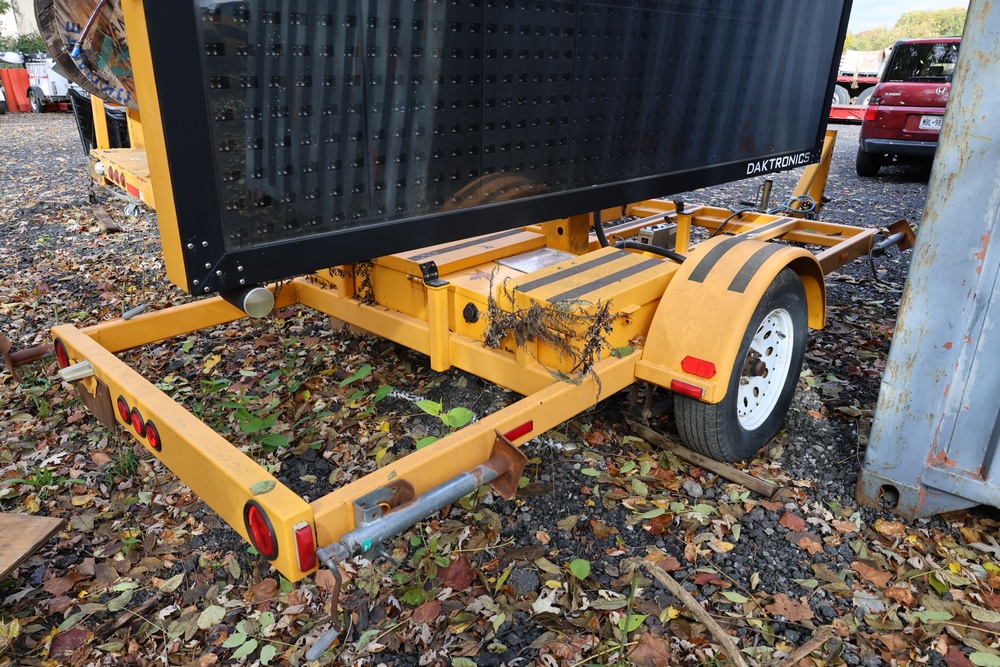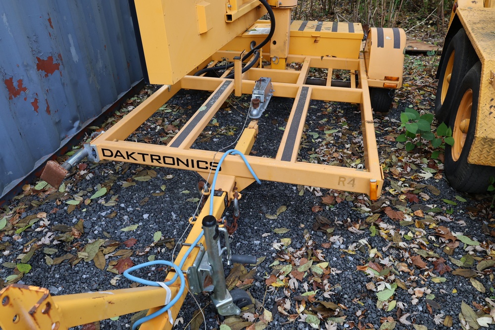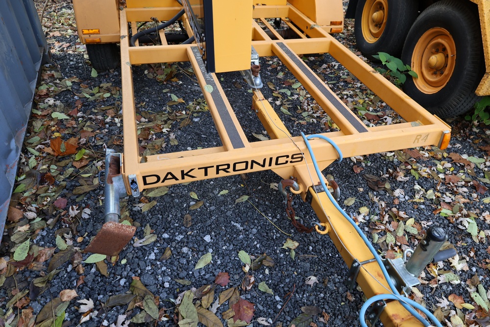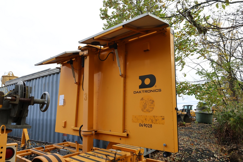 Daktronics Portable Message Board Trailer, Serial #069028. Solar-Powered Variable Message Sign (VMS) with Dual Solar Panels, Hydraulic Lift, and LED Display Panel. Yellow Steel Frame, Adjustable Pintle Hitch, and Manual Jack Stand. Equipped with Daktronics Control System and Power Box. Hasn't been used by the seller, unknown if operational.