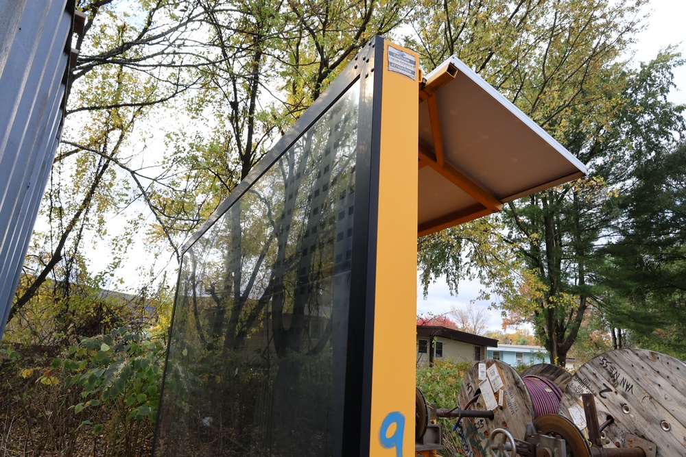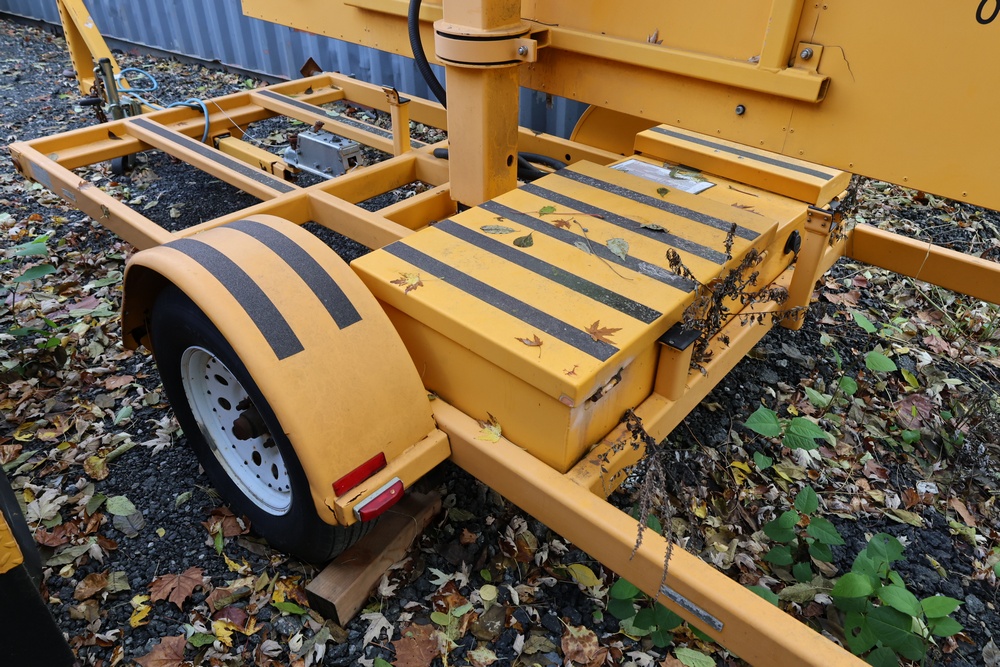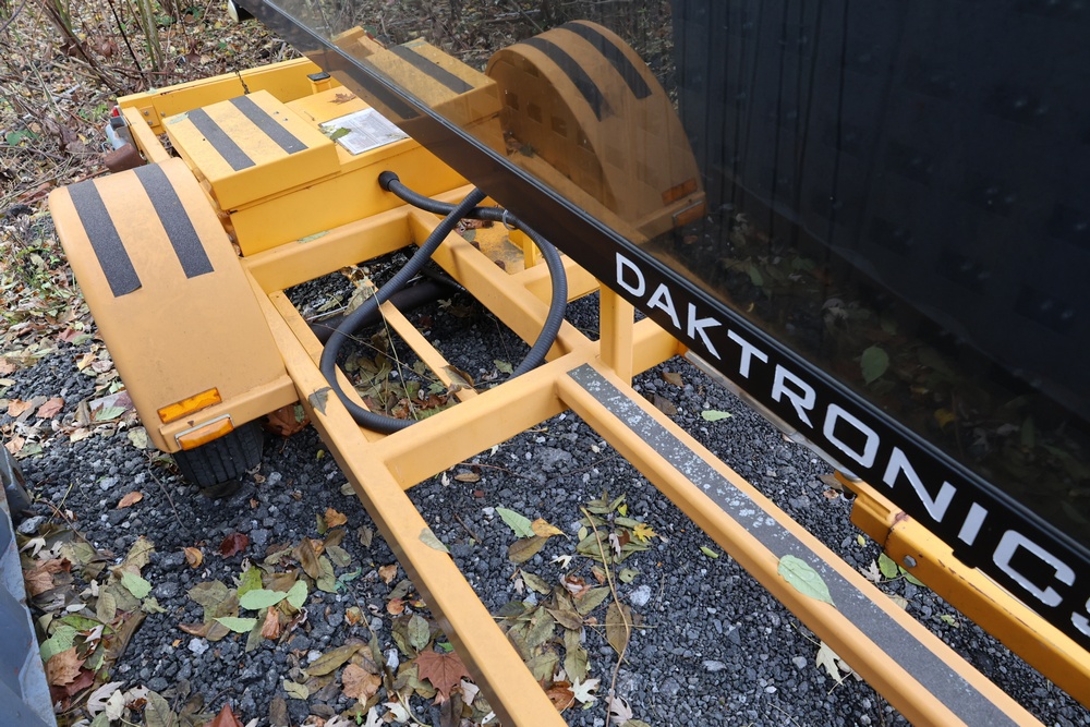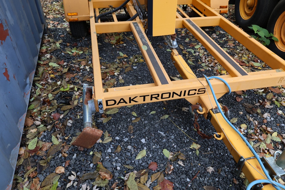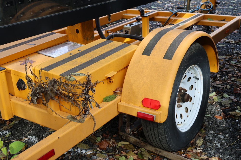Daktronics Portable Message Board Trailer, Serial #069028. Solar-Powered Variable Message Sign (VMS) with Dual Solar Panels, Hydraulic Lift, and LED Display Panel. Yellow Steel Frame, Adjustable Pintle Hitch, and Manual Jack Stand. Equipped with Daktronics Control System and Power Box. Hasn't been used by the seller, unknown if operational.