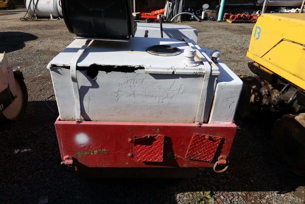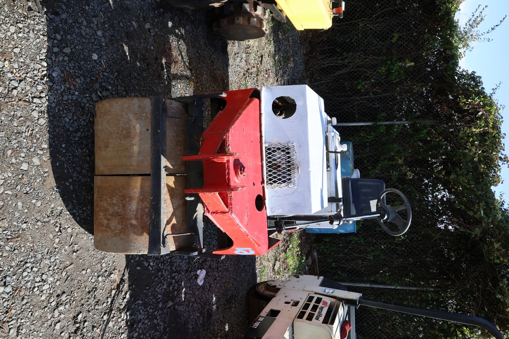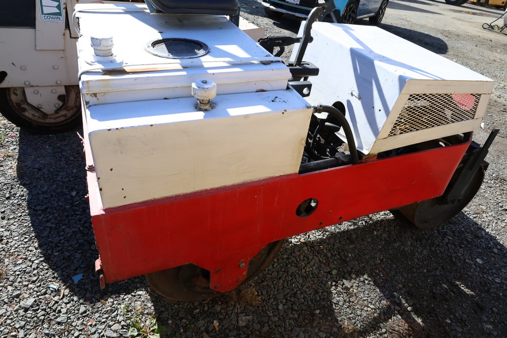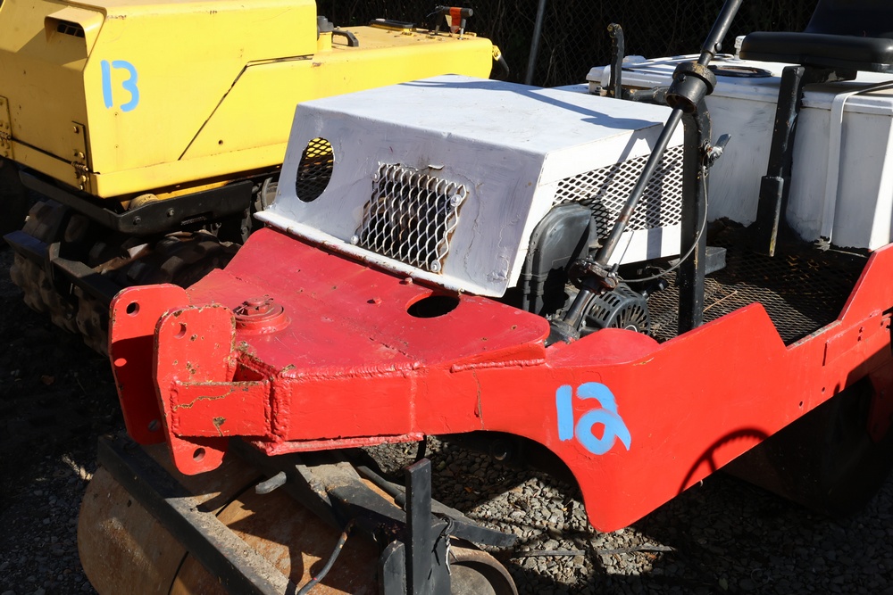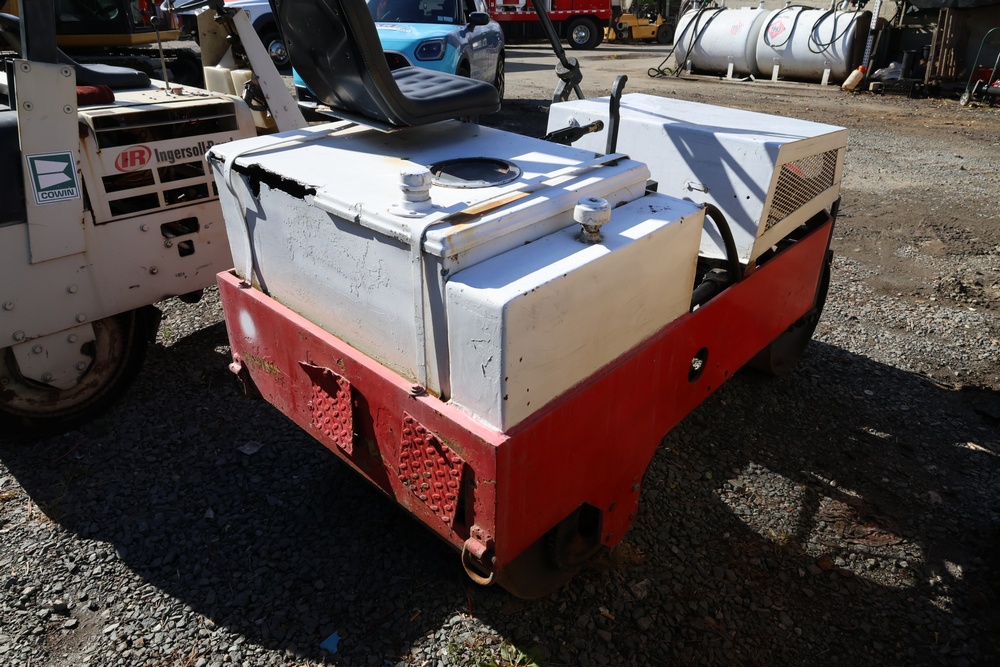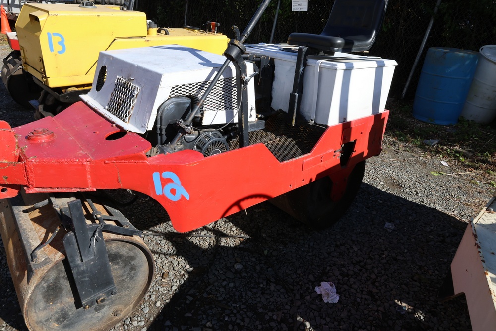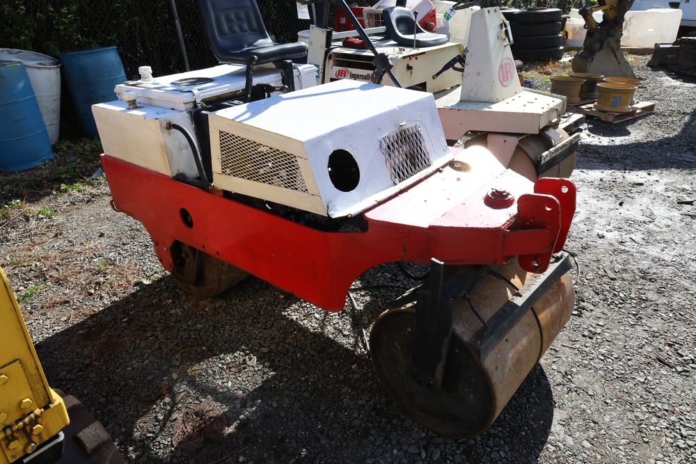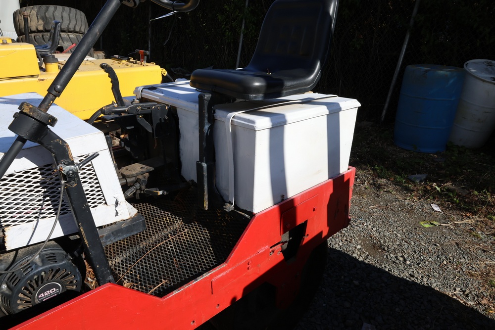 Ride-On Double Drum Roller, Serial #Unavailable. Hour Meter Reading: Not Equipped. Roller with Steel Smooth Drums, Predator 420cc Gasoline Engine, and Manual Controls. Red and White Painted Steel Frame with Open Operator Platform and Steering Wheel. Runs and operates as intended.
