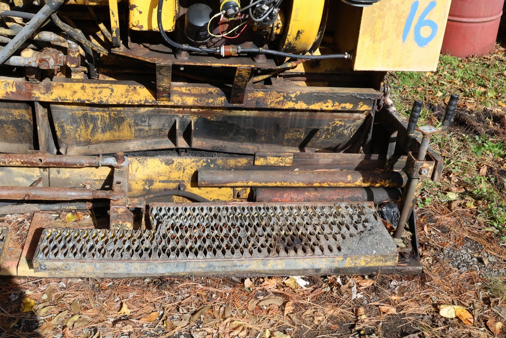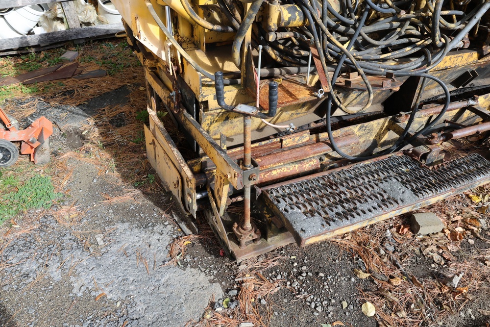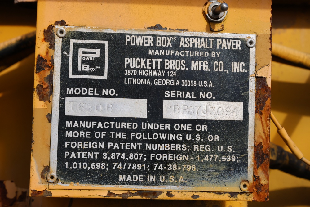 Puckett Bros. Power Box Asphalt Paver, Model T650B, Serial #PBP87J3094. Hour Meter Reading: 2,018 hours. Approximate Weight: 10,000 lbs. Powered by Diesel Engine. Hydraulic Controls for Auger, Conveyor, and Screed with Multiple Levers. Hopper Feed System with Chain Conveyors, Adjustable Screed, and Hydraulic Extensions. Seller reports ran when parked, sat for a couple of years.