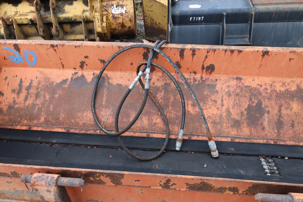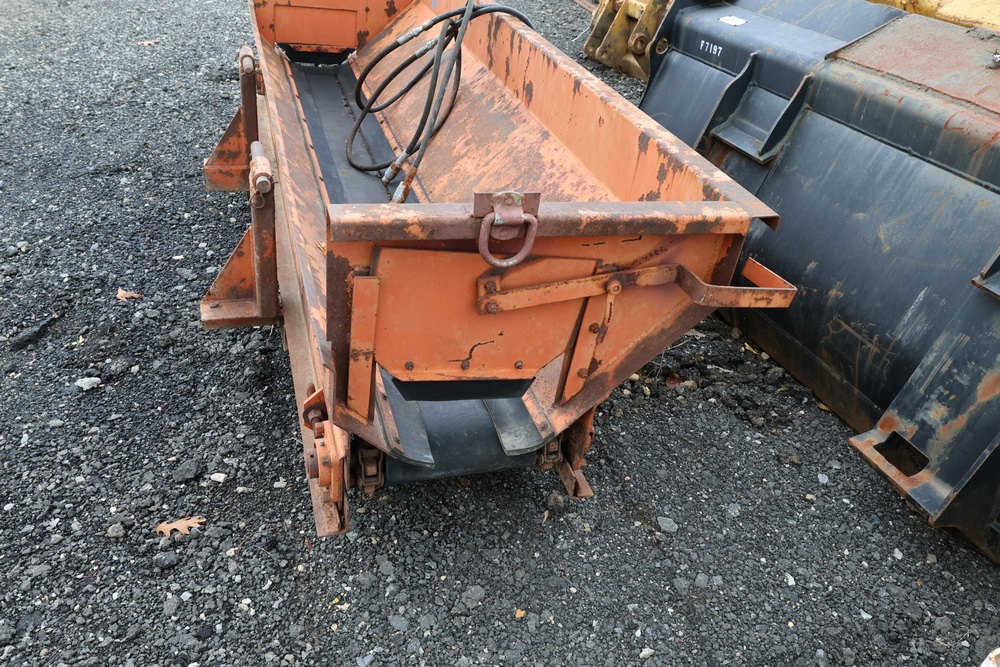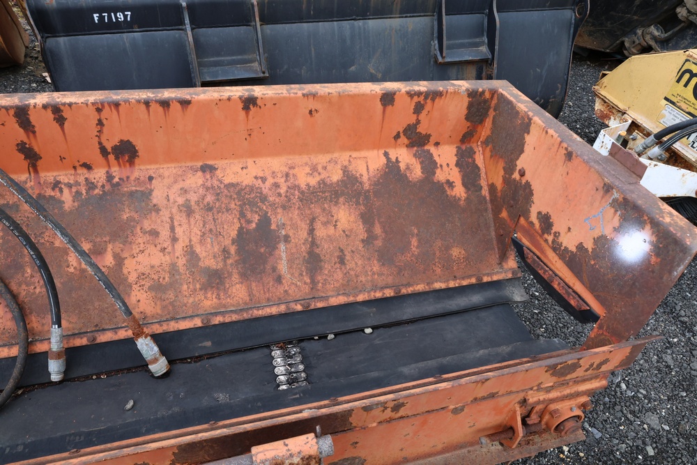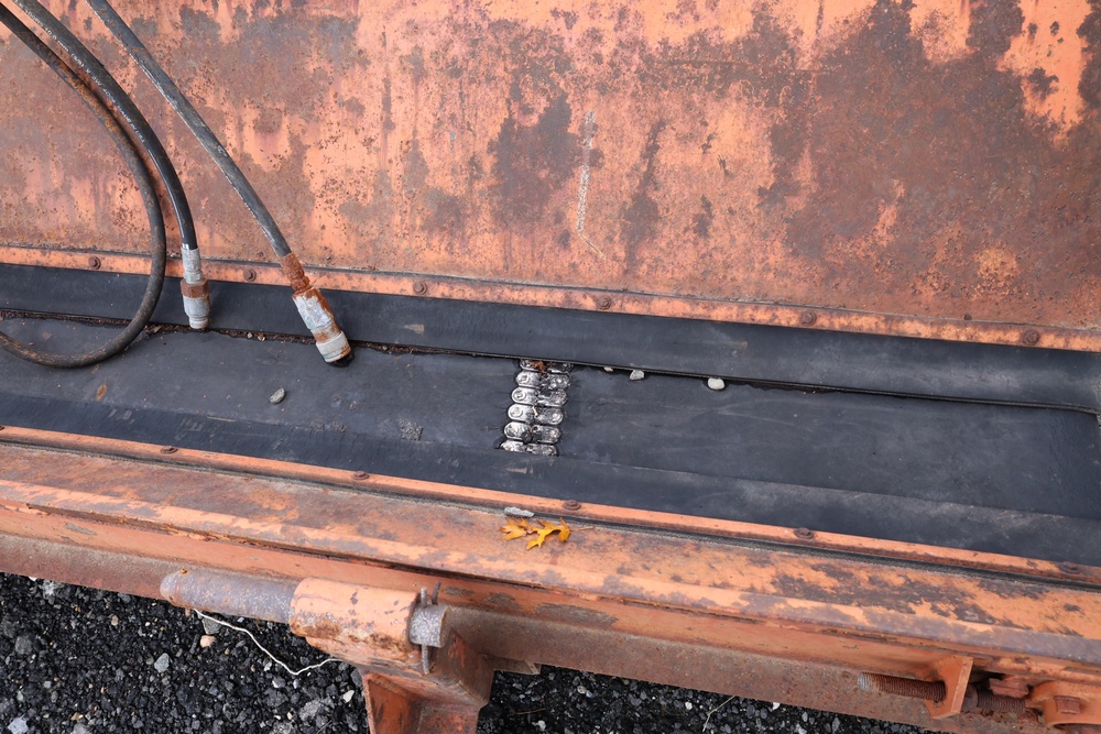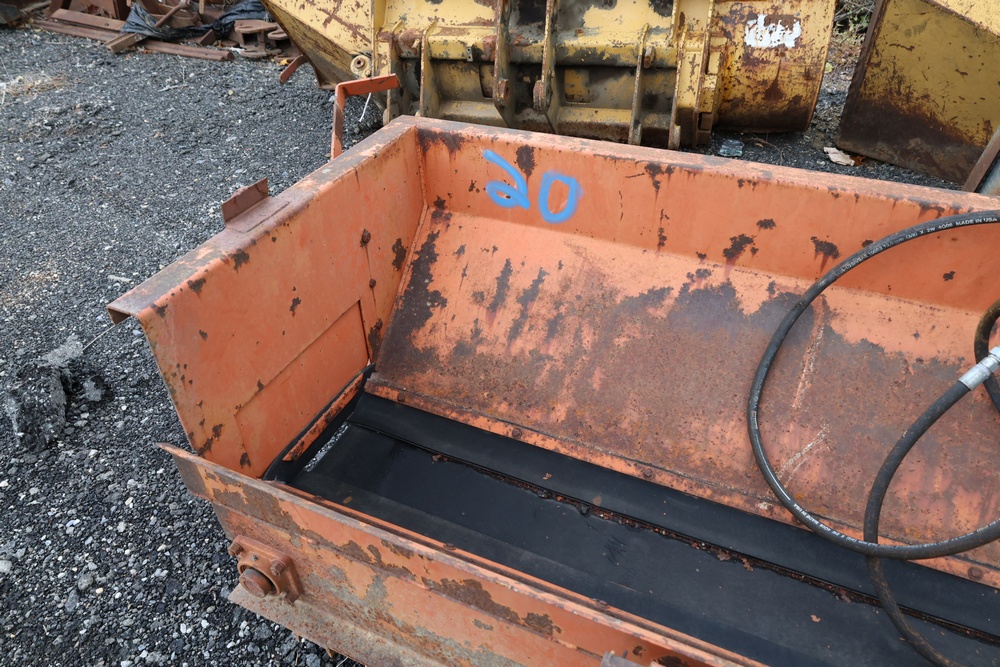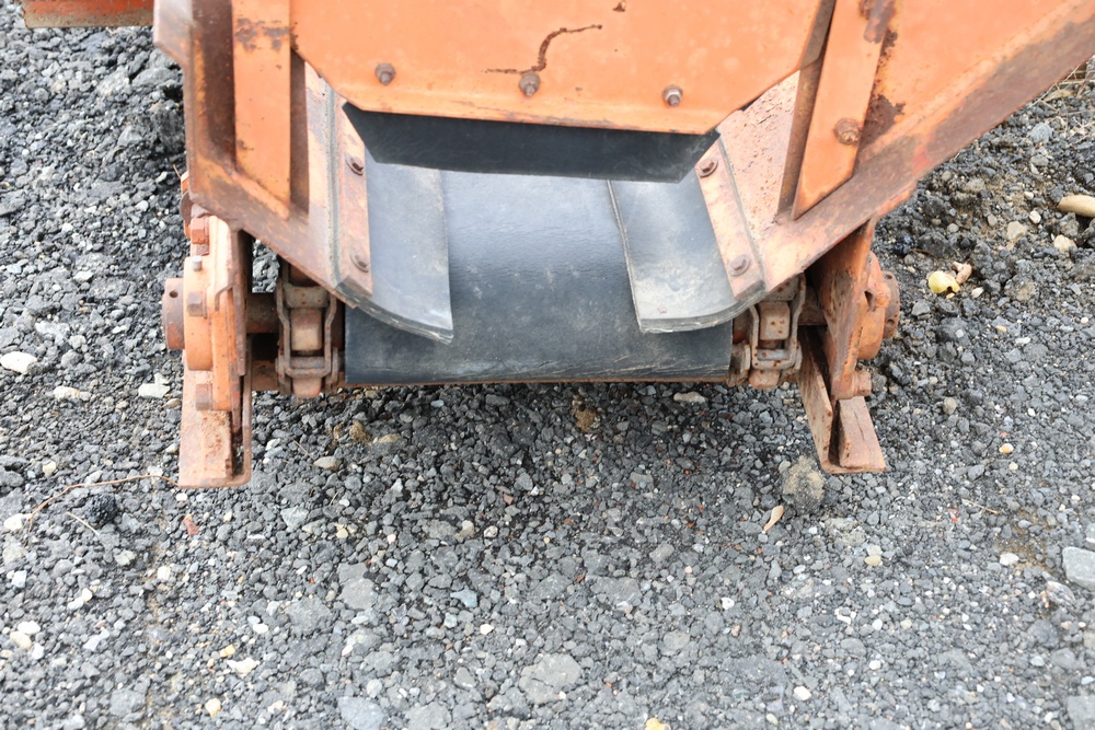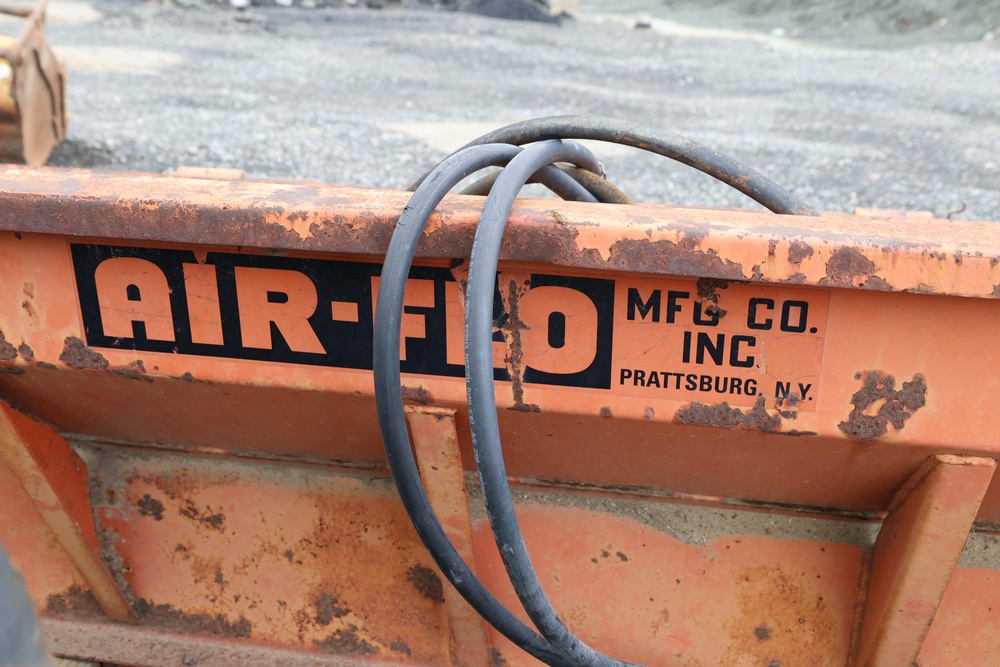 Air-Flo Manufacturing Co. hydraulic material spreader, Prattsburg, New York. Unit features dual hydraulic lines, conveyor-style feed system, and rear discharge gate. Equipped with a Durst gearbox and lubrication chart specifying SAE 80-90 oil for the gearbox and multi-purpose grease for front and rear bearings.